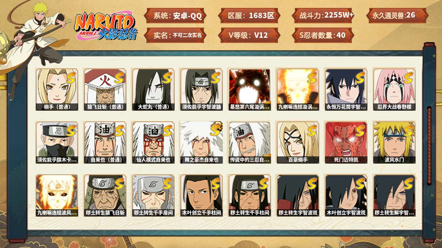 【火影忍者】【lyhy8964】战斗力:2255w;段位:上忍3阶;本服排名:33;vip:v12级;s忍:40个;a忍:57个;通灵兽:26个,s忍:纲手(普通) 5星|猿飞日斩(普通) 5星|大蛇丸(普通) 4星|须佐能乎宇智波鼬 4星|暴怒第六尾漩涡鸣人|九喇嘛连结漩涡鸣人|永恒万花筒宇智波佐助|忍界大战春野樱|须佐能乎旗木卡卡西|自来也(普通)|仙人模式自来也|舞之豪杰自来也|传说中的三忍自来也|百豪纲手|死门迈特凯|波风水门|九喇嘛连结波风水门|秽土转生猿飞日斩|秽土转生千手扉间|木叶创立千手柱间|秽土转生千手柱间|秽土转生宇智波斑|木叶创立宇智波斑|秽土转生解宇智波斑|秽土转生宇智波鼬|须佐能乎宇智波止水|白面具宇智波斑|五影会谈宇智波斑|忍界大战宇智波带土|红夜之刃神秘面具男|初代目风影烈斗|忍界大战艾|忍界大战大野木|秽土转生半藏|天道佩恩|秽土转生长门|仙人模式药师兜|最终章大筒木舍人|大筒木桃式|博人传大筒木金式__a忍:迈特凯(普通) 5星|猿飞阿斯玛(普通) 5星|蝎(普通) 5星|干柿鬼鲛(普通) 5星|死司凭血飞段 5星|疾风传我爱罗 4星|飞段(普通) 4星|初始形态机械鸣人|忍者之路神秘面具男|仙人模式漩涡鸣人|九尾查克拉漩涡鸣人|万花筒写轮眼宇智波佐助|须佐能乎宇智波佐助|侠隐江湖宇智波佐助|宇智波泉奈|百豪春野樱|忍界大战秋道丁次|忍界大战日向宁次|忍界大战李洛克|幻之真容旗木卡卡西|万花筒写轮眼旗木卡卡西|宇智波止水(普通)|青年波风水门|新春限定我爱罗|忍界大战我爱罗|近松十人卫千代|五代目水影照美冥|秽土转生桃地再不斩|桃地再不斩|忍界大战奇拉比|奇拉比(普通)|青年艾|忍界大战土台|半蛇斗篷药师兜|不风|不动|青年长门|小南(普通)|角都(普通)|地怨虞角都|秽土转生角都|新春限定大蛇丸|晓大蛇丸|绯流琥蝎|宇智波鼬(普通)|夏日限定宇智波鼬|迪达拉(普通)|秽土转生迪达拉|侠隐江湖大野木|羁绊神农|木叶上忍猿飞木叶丸|桃式显现漩涡博人|六代目水影长十郎|五代目雷影达鲁伊|仙人模式巳月|四代目土影黑土|夏日限定黑土__通灵兽:忍犬(普通)|蓝蛇|蛤蟆吉|忍龟|镰鼬|猿魔|山椒鱼|蜃|蛤蟆仙人|鲛鲨|蛤蟆健|乌鸦(普通)|蛞蝓(普通)|砂之守鹤|蛤蟆龙|蛤蟆广|怒鬼无臂|梦貘|怒鬼(普通)|鹰|怒鬼爪|蜘蛛|辛牙|熊猫|万蛇|乌鸦夏日限定