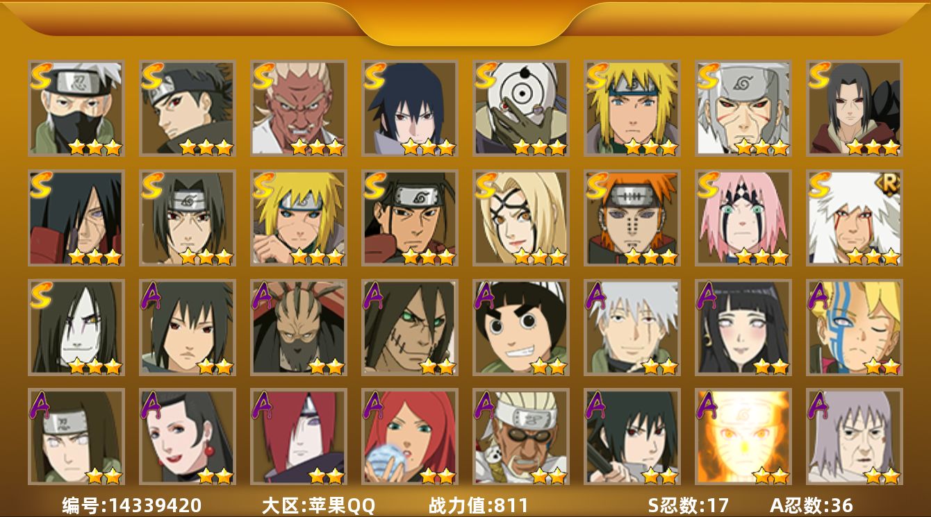 【苹果q-2512区-881万战力-v10-19s-34a-167忍者-16通灵】 s:暴怒六尾鸣人 旋涡鸣人 宇智波佐助 忍战樱 豪杰自来也 三忍自来也 波风水门 九喇嘛水门 秽土日斩 创立柱间 秽土柱间 解斑 须佐鼬 秽土鼬 白面具 红夜之刃 忍战艾 佩恩 大筒木桃式 a: 日向雏田 风之守护我爱罗 不风 浪客佩恩 恶灵飞段 秽土迪达拉 旋涡博人 "