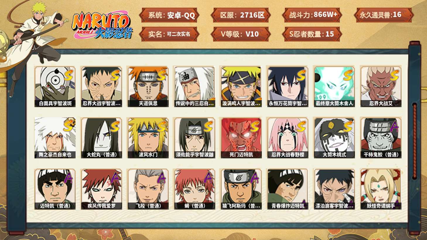 【火影忍者】【lyhy11452】战斗力:866w;段位:上忍2阶;本服排名:568;vip:v10级;s忍:15个;a忍:38个;通灵兽:16个,s忍:白面具宇智波斑|忍界大战宇智波带土|天道佩恩|传说中的三忍自来也|漩涡鸣人宇智波佐助|永恒万花筒宇智波佐助|最终章大筒木舍人|忍界大战艾|舞之豪杰自来也|大蛇丸(普通)|波风水门|须佐能乎宇智波鼬|死门迈特凯|忍界大战春野樱|大筒木桃式__a忍:青春爆炸迈特凯|漂泊浪客宇智波带土|妖怪奇谭纲手|幻之真容旗木卡卡西|忍界大战李洛克|秽土转生角都|忍界大战日向宁次|四代目土影黑土|青年长门|秽土转生迪达拉|新春限定宇智波止水|青年波风水门|青年艾|近松十人卫千代|晓创生角都|须佐能乎宇智波佐助|九尾查克拉漩涡鸣人|秽土转生猿飞阿斯玛|五代目水影照美冥|五代目雷影达鲁伊|死司凭血飞段|地怨虞角都|疾风传我爱罗 3星|迪达拉(普通)|飞段(普通) 3星|仙人模式漩涡鸣人|迈特凯(普通) 4星|宇智波鼬(普通)|干柿鬼鲛(普通) 5星|秽土转生桃地再不斩|蝎(普通) 3星|绯流琥蝎|猿飞阿斯玛(普通) 3星|桃式显现漩涡博人|最终章日向雏田|宇智波泉奈|羁绊神农|夏日限定黑土__通灵兽:忍犬(普通)|蓝蛇|蛤蟆吉|砂之守鹤|忍龟|镰鼬|猿魔|山椒鱼|蜃|蛤蟆仙人|鲛鲨|蛤蟆健|乌鸦(普通)|蛤蟆龙|蛞蝓(普通)|蛤蟆广【社交限制,但不影响游戏,介意勿拍】