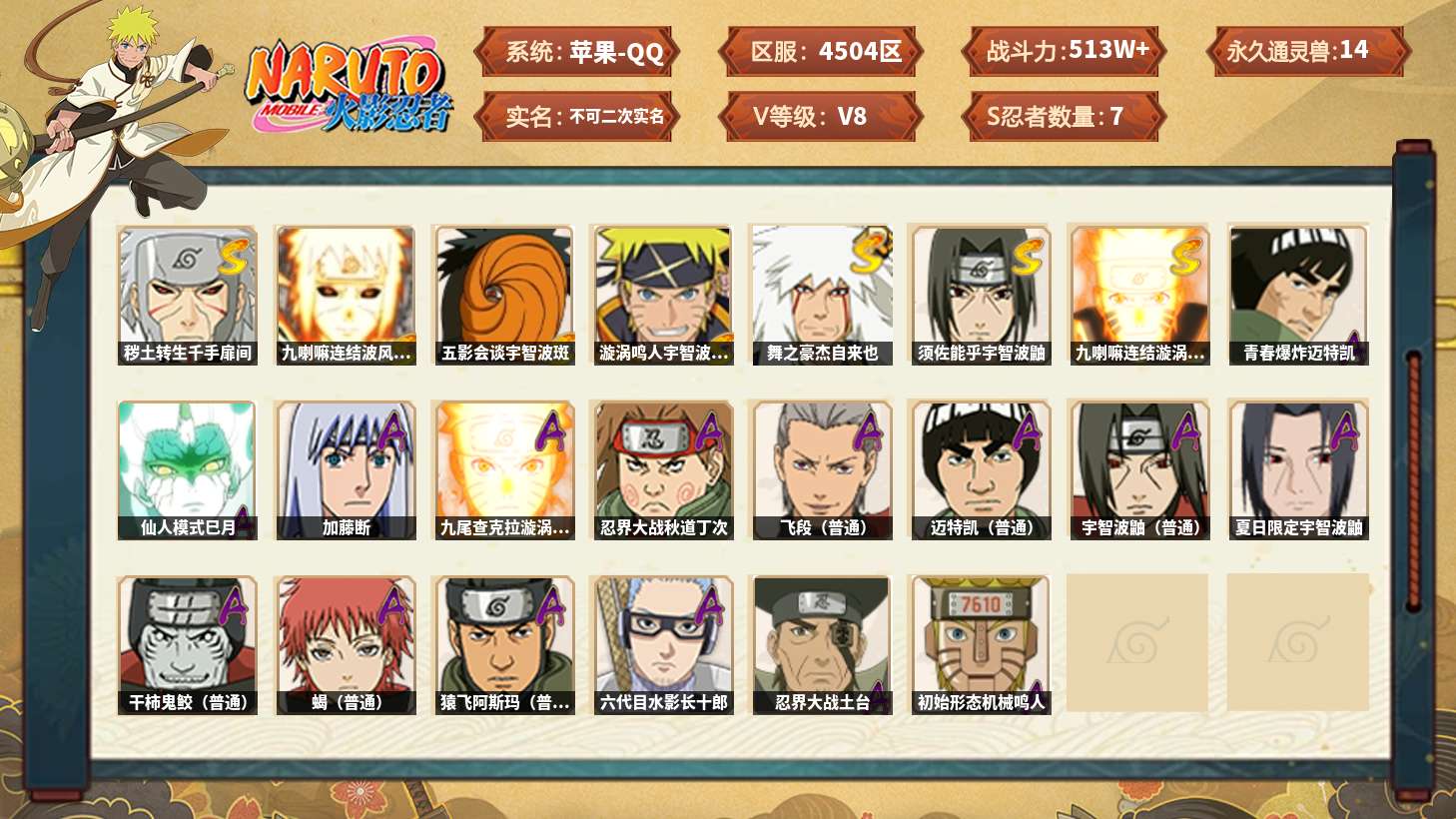 【火影忍者】【lyhy11457】战斗力:513w;段位:上忍1阶;本服排名:120;vip:v8级;s忍:7个;a忍:15个;通灵兽:14个,s忍:秽土转生千手扉间|九喇嘛连结波风水门|五影会谈宇智波斑|漩涡鸣人宇智波佐助|舞之豪杰自来也|须佐能乎宇智波鼬|九喇嘛连结漩涡鸣人__a忍:青春爆炸迈特凯|仙人模式巳月|加藤断|九尾查克拉漩涡鸣人|忍界大战秋道丁次|飞段(普通)|迈特凯(普通)|宇智波鼬(普通)|夏日限定宇智波鼬|干柿鬼鲛(普通)|蝎(普通)|猿飞阿斯玛(普通)|六代目水影长十郎|忍界大战土台|初始形态机械鸣人__通灵兽:忍犬(普通)|蓝蛇|蛤蟆吉|忍龟|镰鼬|猿魔|砂之守鹤|山椒鱼|蜃|蛤蟆仙人|鲛鲨|蛤蟆健|乌鸦(普通)|熊猫