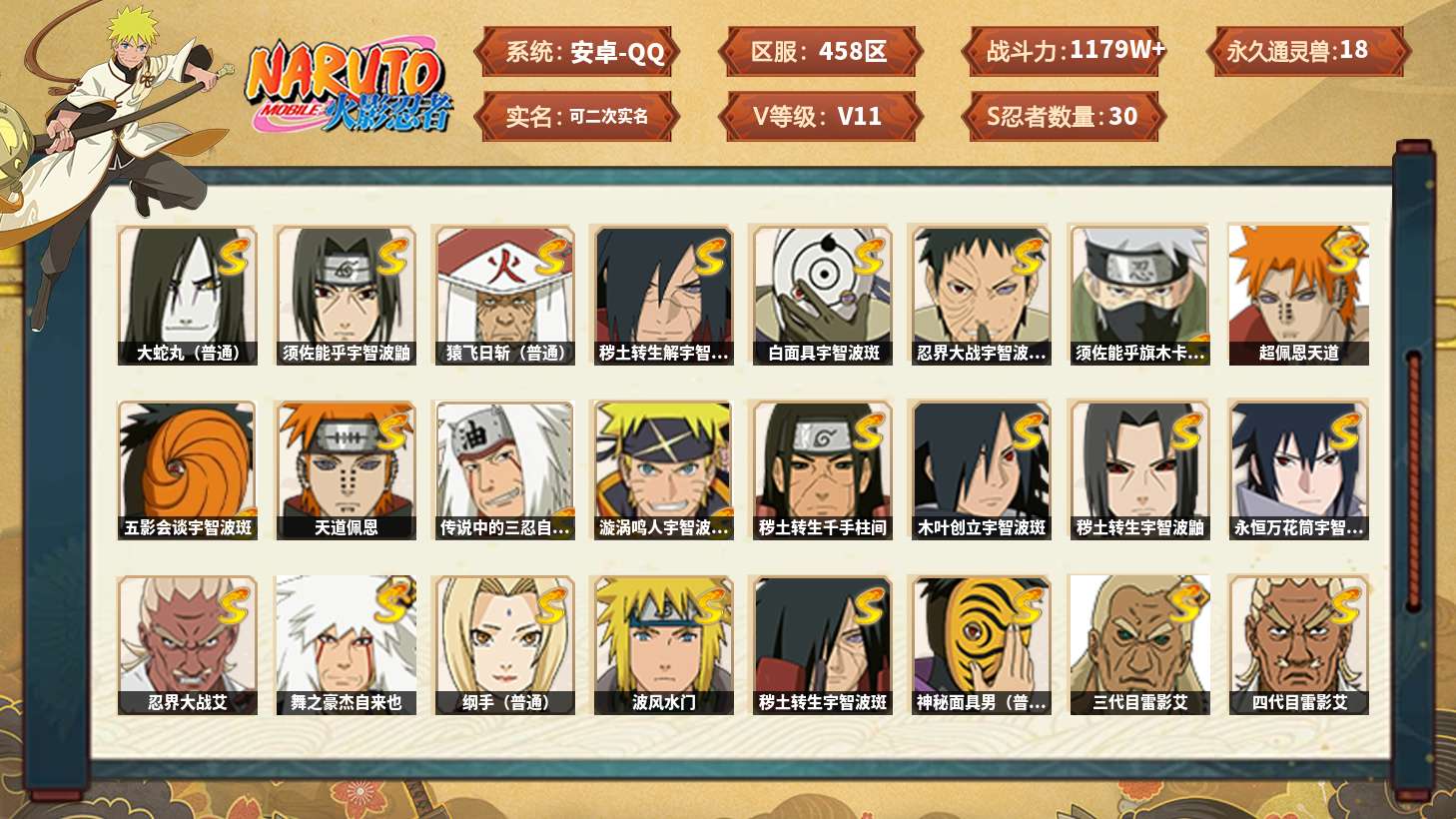 【火影忍者】【lyhy11450】战斗力:1179w;段位:上忍1阶;本服排名:159;vip:v11级;s忍:30个;a忍:45个;通灵兽:18个,s忍:秽土转生解宇智波斑|白面具宇智波斑|忍界大战宇智波带土|须佐能乎旗木卡卡西|超佩恩天道|五影会谈宇智波斑|天道佩恩|传说中的三忍自来也|漩涡鸣人宇智波佐助|秽土转生千手柱间|木叶创立宇智波斑|秽土转生宇智波鼬|永恒万花筒宇智波佐助|忍界大战艾|舞之豪杰自来也|大蛇丸(普通) 4星|纲手(普通)|波风水门|秽土转生宇智波斑|须佐能乎宇智波鼬 4星|神秘面具男(普通)|三代目雷影艾|四代目雷影艾|仙人模式药师兜|死门迈特凯|忍界大战春野樱|九喇嘛连结漩涡鸣人|猿飞日斩(普通) 4星|秽土转生猿飞日斩|自来也(普通)__a忍:青春爆炸迈特凯|忍界大战李洛克|忍界大战日向宁次|四代目土影黑土|木叶上忍猿飞木叶丸|青年长门|忍者之路神秘面具男|秽土转生迪达拉|宇智波止水(普通)|忍界大战奇拉比|青年波风水门|青年艾|漂泊武士千手扉间|加藤断|近松十人卫千代|须佐能乎宇智波佐助|九尾查克拉漩涡鸣人|晓大蛇丸|忍界大战秋道丁次 3星|忍界大战我爱罗|秽土转生猿飞阿斯玛|奇拉比(普通)|万花筒写轮眼宇智波佐助|五代目水影照美冥|五代目雷影达鲁伊|死司凭血飞段 3星|地怨虞角都|疾风传我爱罗 4星|迪达拉(普通)|飞段(普通) 4星|小南(普通)|仙人模式漩涡鸣人|万花筒写轮眼旗木卡卡西|迈特凯(普通) 5星|宇智波鼬(普通)|干柿鬼鲛(普通) 5星|秽土转生桃地再不斩|蝎(普通) 5星|绯流琥蝎|猿飞阿斯玛(普通) 5星|桃式显现漩涡博人|六代目水影长十郎|宇智波泉奈|忍界大战土台|初始形态机械鸣人__通灵兽:忍犬(普通)|蓝蛇|蛤蟆吉|忍龟|镰鼬|猿魔|山椒鱼|蜃|蛤蟆仙人|鲛鲨|蛤蟆健|砂之守鹤|乌鸦(普通)|蛞蝓(普通)|蛤蟆龙|蛤蟆广|梦貘|鹰1