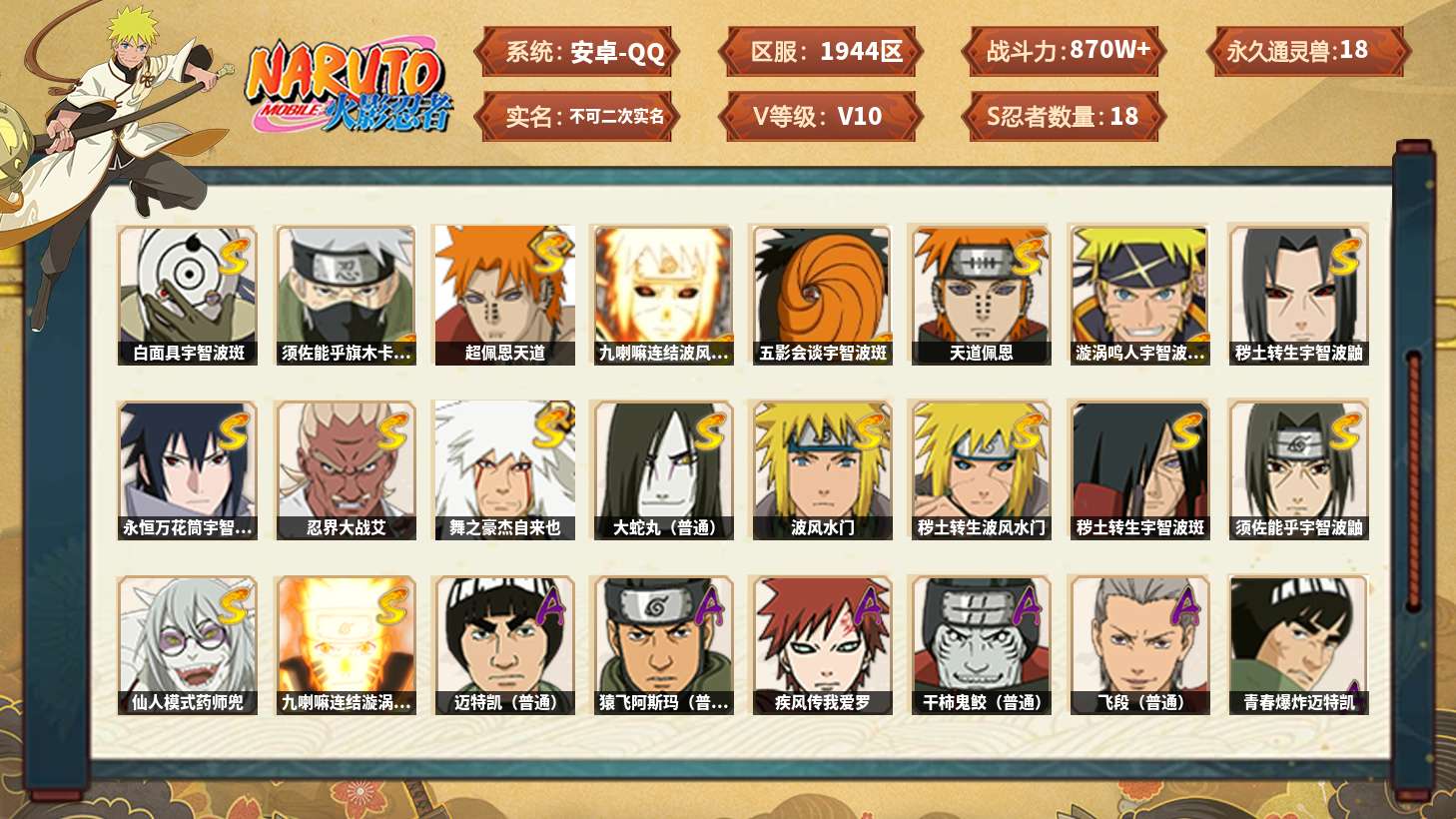 【火影忍者】【lyhy11451】战斗力:870w;段位:见习1阶;本服排名:578;vip:v10级;s忍:18个;a忍:43个;通灵兽:18个,s忍:白面具宇智波斑|须佐能乎旗木卡卡西|超佩恩天道|九喇嘛连结波风水门|五影会谈宇智波斑|天道佩恩|漩涡鸣人宇智波佐助|秽土转生宇智波鼬|永恒万花筒宇智波佐助|忍界大战艾|舞之豪杰自来也|大蛇丸(普通)|波风水门|秽土转生波风水门|秽土转生宇智波斑|须佐能乎宇智波鼬|仙人模式药师兜|九喇嘛连结漩涡鸣人__a忍:青春爆炸迈特凯|漂泊浪客宇智波带土|侠隐江湖宇智波佐助|幻之真容旗木卡卡西|忍界大战李洛克|忍界大战日向宁次|四代目土影黑土|青年长门|秽土转生迪达拉|宇智波止水(普通)|忍界大战奇拉比|青年波风水门|青年艾|近松十人卫千代|半蛇斗篷药师兜|须佐能乎宇智波佐助|九尾查克拉漩涡鸣人|晓大蛇丸|百豪春野樱|秽土转生猿飞阿斯玛|奇拉比(普通)|万花筒写轮眼宇智波佐助|五代目水影照美冥|死司凭血飞段|地怨虞角都|疾风传我爱罗 4星|迪达拉(普通)|飞段(普通) 3星|仙人模式漩涡鸣人|迈特凯(普通) 5星|夏日限定宇智波鼬|干柿鬼鲛(普通) 4星|桃地再不斩|秽土转生桃地再不斩|蝎(普通)|猿飞阿斯玛(普通) 5星|最终章日向雏田|六代目水影长十郎|不缘|宇智波泉奈|忍界大战土台|初始形态机械鸣人|侠隐江湖大野木__通灵兽:忍犬(普通)|蓝蛇|蛤蟆吉|忍龟|镰鼬|猿魔|山椒鱼|蜃|蛤蟆仙人|鲛鲨|蛤蟆健|砂之守鹤|乌鸦(普通)|蛞蝓(普通)|蛤蟆龙|蛤蟆广|万蛇|梦貘