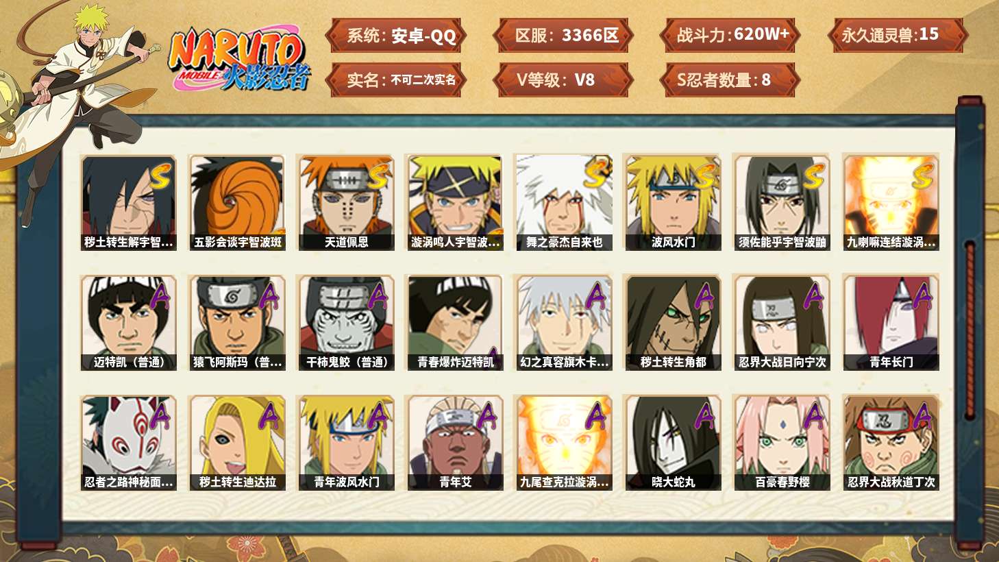 【火影忍者】【lyhy11455】战斗力:620w;段位:中忍3阶;本服排名:970;vip:v8级;s忍:8个;a忍:28个;通灵兽:15个,s忍:秽土转生解宇智波斑|五影会谈宇智波斑|天道佩恩|漩涡鸣人宇智波佐助|舞之豪杰自来也|波风水门|须佐能乎宇智波鼬|九喇嘛连结漩涡鸣人__a忍:青春爆炸迈特凯|幻之真容旗木卡卡西|秽土转生角都|忍界大战日向宁次|青年长门|忍者之路神秘面具男|秽土转生迪达拉|青年波风水门|青年艾|九尾查克拉漩涡鸣人|晓大蛇丸|百豪春野樱|忍界大战秋道丁次|五代目雷影达鲁伊|死司凭血飞段|疾风传我爱罗|飞段(普通)|迈特凯(普通) 5星|宇智波鼬(普通)|干柿鬼鲛(普通) 3星|蝎(普通)|猿飞阿斯玛(普通) 5星|桃式显现漩涡博人|宇智波泉奈|羁绊神农|忍界大战土台|初始形态机械鸣人|侠隐江湖大野木__通灵兽:忍犬(普通)|蓝蛇|蛤蟆吉|忍龟|镰鼬|猿魔|山椒鱼|蜃|蛤蟆仙人|鲛鲨|蛤蟆健|砂之守鹤|蛞蝓(普通)|乌鸦(普通)|蛤蟆龙