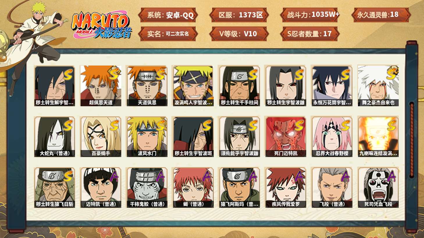 【火影忍者】【lyhy11439】战斗力:1035w;段位:下忍2阶;本服排名:534;vip:v10级;s忍:17个;a忍:46个;通灵兽:18个,s忍:秽土转生解宇智波斑|超佩恩天道|天道佩恩|漩涡鸣人宇智波佐助|秽土转生千手柱间|秽土转生宇智波鼬|永恒万花筒宇智波佐助|舞之豪杰自来也|大蛇丸(普通)|百豪纲手|波风水门|秽土转生宇智波斑|须佐能乎宇智波鼬|死门迈特凯|忍界大战春野樱|九喇嘛连结漩涡鸣人|秽土转生猿飞日斩__a忍:青春爆炸迈特凯|仙人模式巳月|忍界大战李洛克|漂泊浪客佩恩六道|忍界大战日向宁次|四代目土影黑土|木叶上忍猿飞木叶丸|青年长门|秽土转生迪达拉|忍界大战奇拉比|青年波风水门|青年艾|漂泊武士千手扉间|近松十人卫千代|半蛇斗篷药师兜|须佐能乎宇智波佐助|九尾查克拉漩涡鸣人|晓大蛇丸|百豪春野樱|忍界大战秋道丁次|忍界大战我爱罗|秽土转生猿飞阿斯玛|疾风传咒印宇智波佐助|新春限定宇智波鼬|万花筒写轮眼宇智波佐助|五代目水影照美冥|五代目雷影达鲁伊|死司凭血飞段 3星|疾风传我爱罗 4星|迪达拉(普通)|飞段(普通) 4星|小南(普通)|漂泊浪客小南|仙人模式漩涡鸣人|万花筒写轮眼旗木卡卡西|迈特凯(普通) 5星|宇智波鼬(普通)|夏日限定宇智波鼬|干柿鬼鲛(普通) 5星|蝎(普通) 5星|猿飞阿斯玛(普通) 5星|桃式显现漩涡博人|最终章日向雏田|六代目水影长十郎|宇智波泉奈|侠隐江湖大野木__通灵兽:忍犬(普通)|蓝蛇|蛤蟆吉|忍龟|镰鼬|猿魔|山椒鱼|蜃|熊猫|蛤蟆仙人|鲛鲨|二尾又旅|蛤蟆健|砂之守鹤|乌鸦(普通)|蛤蟆龙|蛤蟆广|蛞蝓(普通)