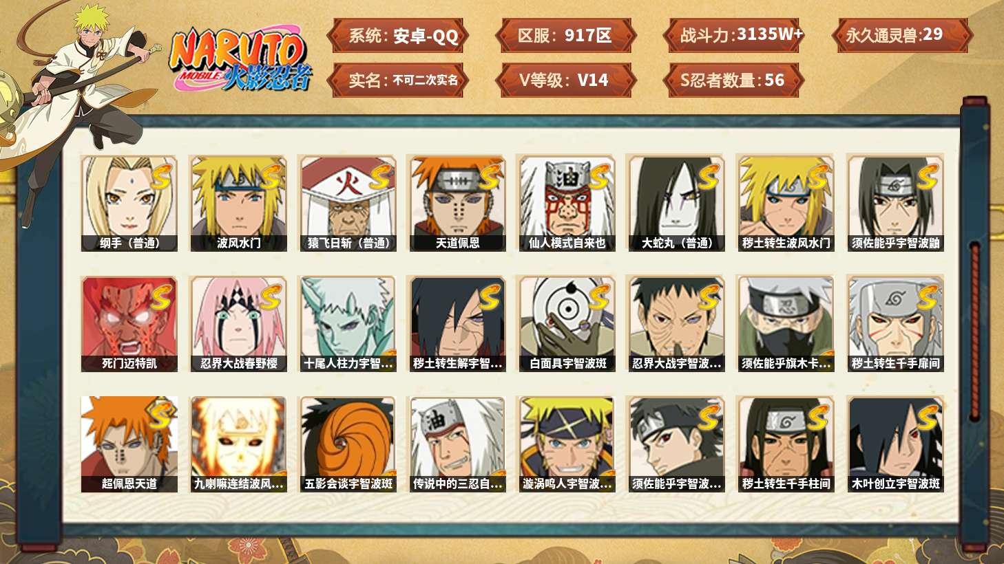 【火影忍者】【lyhy11430】战斗力:3135w;段位:上忍2阶;本服排名:7;vip:v14级;s忍:56个;a忍:87个;通灵兽:29个,s忍:十尾人柱力宇智波带土|秽土转生解宇智波斑|白面具宇智波斑|忍界大战宇智波带土|须佐能乎旗木卡卡西|秽土转生千手扉间|超佩恩天道|九喇嘛连结波风水门|五影会谈宇智波斑|天道佩恩 4星|传说中的三忍自来也|漩涡鸣人宇智波佐助|须佐能乎宇智波止水|秽土转生千手柱间|木叶创立宇智波斑|秽土转生宇智波鼬|永恒万花筒宇智波佐助|最终章大筒木舍人|仙人模式自来也 4星|木叶创立千手柱间|忍界大战艾|舞之豪杰自来也|大蛇丸(普通) 4星|纲手(普通) 5星|百豪纲手|波风水门 5星|秽土转生波风水门 4星|千手扉间(普通)|千手柱间(普通)|秽土转生宇智波斑|宇智波斑(普通)|须佐能乎宇智波鼬 4星|神秘面具男(普通)|红夜之刃神秘面具男|秽土转生长门|秽土转生半藏|秽土转生三代目风影|秽土转生金角银角|二代目土影无|二代目水影鬼灯幻月|三代目土影大野木|三代目雷影艾|四代目雷影艾|四代目风影罗砂|仙人模式药师兜|死门迈特凯 4星|忍界大战大野木|忍界大战春野樱 4星|九喇嘛连结漩涡鸣人|博人传大筒木金式|大筒木桃式|猿飞日斩(普通) 5星|秽土转生猿飞日斩|自来也(普通)|暴怒第六尾漩涡鸣人|初代目风影烈斗__a忍:青春爆炸迈特凯|漂泊浪客宇智波带土|妖怪奇谭纲手|仙人模式巳月 3星|侠隐江湖纲手|幻之真容旗木卡卡西|忍界大战李洛克 3星|漂泊浪客佩恩六道|秽土转生角都|忍界大战日向宁次|四代目土影黑土|木叶上忍猿飞木叶丸|火之意志继承者卑留呼|青年长门 3星|侠隐江湖照美冥|忍者之路神秘面具男|秽土转生迪达拉|志村团藏|宇智波止水(普通)|新春限定宇智波止水|不风|新春限定迪达拉|忍界大战奇拉比|青年波风水门|青年艾|漂泊武士千手扉间|加藤断|忍界大战旗木卡卡西|漂泊武士桃地再不斩|近松十人卫千代|夏日泳装照美冥|晓创生蝎|晓创生角都|半蛇斗篷药师兜 3星|须佐能乎宇智波佐助|九尾查克拉漩涡鸣人|新春限定小南|七夕限定猿飞阿斯玛|暴怒宇智波带土|晓大蛇丸|地陆|火影继承人猿飞日斩 3星|百豪春野樱|忍界大战秋道丁次|忍界大战我爱罗|忍界大战勘九郎|秽土转生猿飞阿斯玛|新春限定波风水门|夏日泳装小南|疾风传咒印宇智波佐助|新春限定宇智波鼬|奇拉比(普通)|万花筒写轮眼宇智波佐助|五代目水影照美冥 3星|达鲁伊(普通)|五代目雷影达鲁伊|惊门迈特凯|绝|死司凭血飞段 5星|角都(普通)|地怨虞角都|疾风传我爱罗 5星|迪达拉(普通) 3星|飞段(普通) 5星|小南(普通) 3星|漂泊浪客小南|仙人模式漩涡鸣人 3星|万花筒写轮眼旗木卡卡西|旗木卡卡西(普通) 4星|迈特凯(普通) 5星|宇智波鼬(普通)|干柿鬼鲛(普通) 5星|秽土转生桃地再不斩|桃地再不斩|蝎(普通) 5星|绯流琥蝎 3星|猿飞阿斯玛(普通) 5星|桃式显现漩涡博人 3星|最终章日向雏田|六代目水影长十郎 3星|不缘|不动|宇智波泉奈|羁绊神农|忍界大战土台|初始形态机械鸣人|侠隐江湖大野木__通灵兽:忍犬(普通)|蓝蛇|蛤蟆吉|忍龟|镰鼬|猿魔|万蛇|山椒鱼|蛞蝓(普通)|蜃|蛤蟆仙人|鲛鲨|蛤蟆健|乌鸦(普通)|熊猫|螃蟹|二尾又旅|蛤蟆龙|怒鬼(普通)|蛤蟆广|三尾矶抚|梦貘|砂之守鹤|鹰|蜘蛛|怒鬼无臂|怒鬼爪|蛞蝓侠隐江湖|辛牙