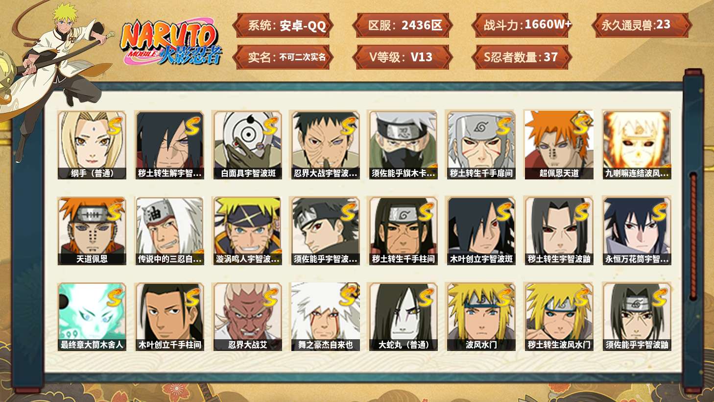 【火影忍者】【lyhy11437】战斗力:1660w;段位:上忍1阶;本服排名:104;vip:v13级;s忍:37个;a忍:63个;通灵兽:23个,s忍:秽土转生解宇智波斑|白面具宇智波斑|忍界大战宇智波带土|须佐能乎旗木卡卡西|秽土转生千手扉间|超佩恩天道|九喇嘛连结波风水门|天道佩恩|传说中的三忍自来也|漩涡鸣人宇智波佐助|须佐能乎宇智波止水|秽土转生千手柱间|木叶创立宇智波斑|秽土转生宇智波鼬|永恒万花筒宇智波佐助|最终章大筒木舍人|木叶创立千手柱间|忍界大战艾|舞之豪杰自来也|大蛇丸(普通)|纲手(普通) 5星|波风水门|秽土转生波风水门|须佐能乎宇智波鼬|红夜之刃神秘面具男|秽土转生三代目风影|四代目雷影艾|四代目风影罗砂|死门迈特凯|忍界大战大野木|忍界大战春野樱|九喇嘛连结漩涡鸣人|博人传大筒木金式|大筒木桃式|猿飞日斩(普通)|秽土转生猿飞日斩|自来也(普通)__a忍:青春爆炸迈特凯|仙人模式巳月|侠隐江湖纲手|幻之真容旗木卡卡西|忍界大战李洛克|漂泊浪客佩恩六道|秽土转生角都|忍界大战日向宁次|四代目土影黑土|火之意志继承者卑留呼|青年长门|忍者之路神秘面具男|秽土转生迪达拉|宇智波止水(普通)|新春限定宇智波止水|元气夏日旗木卡卡西|不风|忍界大战奇拉比|青年波风水门|青年艾|漂泊武士千手扉间|鲛肌融合干柿鬼鲛|忍界大战旗木卡卡西|漂泊武士桃地再不斩|近松十人卫千代|忍界大战迈特凯|须佐能乎宇智波佐助|恶灵之影飞段|暴怒宇智波带土|晓大蛇丸|百豪春野樱|忍界大战秋道丁次|忍界大战我爱罗|秽土转生猿飞阿斯玛|新春限定波风水门|夏日泳装小南|新春限定宇智波鼬|奇拉比(普通)|万花筒写轮眼宇智波佐助|五代目水影照美冥|五代目雷影达鲁伊|死司凭血飞段 3星|疾风传我爱罗 4星|迪达拉(普通) 3星|飞段(普通) 4星|小南(普通)|漂泊浪客小南|迈特凯(普通) 5星|宇智波鼬(普通) 3星|干柿鬼鲛(普通) 5星|秽土转生桃地再不斩|桃地再不斩|蝎(普通) 4星|绯流琥蝎|猿飞阿斯玛(普通) 5星|桃式显现漩涡博人|最终章日向雏田|六代目水影长十郎|宇智波泉奈|羁绊神农|忍界大战土台|初始形态机械鸣人|侠隐江湖大野木__通灵兽:忍犬(普通)|蓝蛇|砂之守鹤|蛤蟆吉|忍龟|镰鼬|猿魔|山椒鱼|蛞蝓(普通)|蜃|蛤蟆仙人|鲛鲨|蛤蟆健|熊猫|乌鸦(普通)|螃蟹|蛤蟆龙|蛤蟆广|蛞蝓侠隐江湖|梦貘|辛牙|鹰|蜘蛛