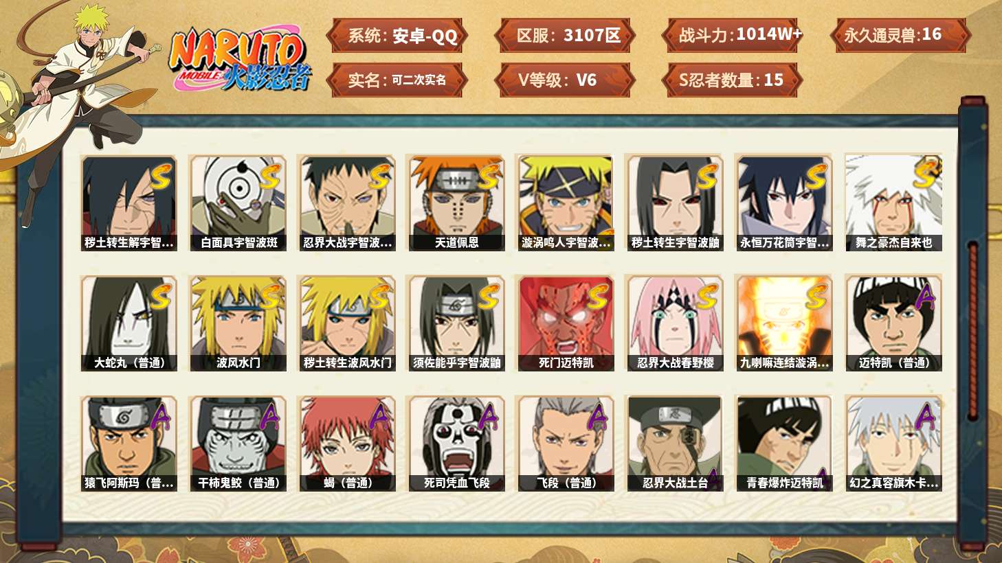 【火影忍者】【lyhy11444】战斗力:1170w;段位:中忍3阶;vip:v11级;s忍:17个;a忍:31个;通灵兽:18个,s忍:秽土转生解宇智波斑|九喇嘛连结波风水门|传说中的三忍自来也|漩涡鸣人宇智波佐助|永恒万花筒宇智波佐助|木叶创立千手柱间|忍界大战艾|舞之豪杰自来也|纲手(普通)|波风水门|须佐能乎宇智波鼬|红夜之刃神秘面具男|忍界大战春野樱|九喇嘛连结漩涡鸣人|博人传大筒木金式|大筒木桃式|猿飞日斩(普通)__a忍:青春爆炸迈特凯|妖怪奇谭纲手|忍界大战日向宁次|青年长门|秽土转生迪达拉|志村团藏|近松十人卫千代|半蛇斗篷药师兜|须佐能乎宇智波佐助|恶灵之影飞段|百豪春野樱|忍界大战秋道丁次|万花筒写轮眼宇智波佐助|死司凭血飞段|疾风传我爱罗 3星|迪达拉(普通)|飞段(普通) 3星|迈特凯(普通) 5星|宇智波鼬(普通)|干柿鬼鲛(普通) 5星|秽土转生桃地再不斩|蝎(普通) 3星|绯流琥蝎|猿飞阿斯玛(普通) 5星|桃式显现漩涡博人|六代目水影长十郎|宇智波泉奈|羁绊神农|忍界大战土台 3星|初始形态机械鸣人|侠隐江湖大野木__通灵兽:忍犬(普通)|蓝蛇|蛤蟆吉|砂之守鹤|忍龟|镰鼬|猿魔|山椒鱼|蛞蝓(普通)|蜃|蛤蟆仙人|鲛鲨|蛤蟆健|乌鸦(普通)|蛤蟆龙|蛤蟆广|辛牙|梦貘