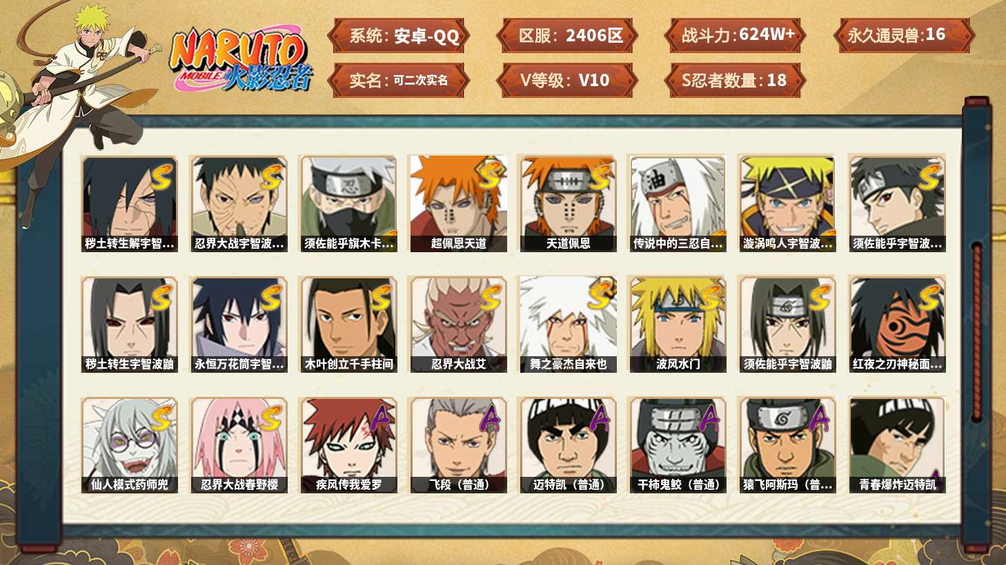 【火影忍者】【lyhy11446】战斗力:624w;段位:上忍1阶;本服排名:1233;vip:v10级;s忍:18个;a忍:31个;通灵兽:16个,s忍:秽土转生解宇智波斑|忍界大战宇智波带土|须佐能乎旗木卡卡西|超佩恩天道|天道佩恩|传说中的三忍自来也|漩涡鸣人宇智波佐助|须佐能乎宇智波止水|秽土转生宇智波鼬|永恒万花筒宇智波佐助|木叶创立千手柱间|忍界大战艾|舞之豪杰自来也|波风水门|须佐能乎宇智波鼬|红夜之刃神秘面具男|仙人模式药师兜|忍界大战春野樱__a忍:青春爆炸迈特凯|幻之真容旗木卡卡西|忍界大战李洛克|忍界大战日向宁次|四代目土影黑土|青年长门|秽土转生迪达拉|忍界大战奇拉比|青年波风水门|近松十人卫千代|须佐能乎宇智波佐助|九尾查克拉漩涡鸣人|忍界大战秋道丁次|疾风传咒印宇智波佐助|万花筒写轮眼宇智波佐助|死司凭血飞段|疾风传我爱罗 3星|迪达拉(普通)|飞段(普通) 3星|迈特凯(普通) 3星|宇智波鼬(普通)|干柿鬼鲛(普通) 3星|秽土转生桃地再不斩|绯流琥蝎|蝎(普通)|猿飞阿斯玛(普通) 3星|桃式显现漩涡博人|最终章日向雏田|六代目水影长十郎|不缘|宇智波泉奈__通灵兽:忍犬(普通)|蓝蛇|砂之守鹤|蛤蟆吉|忍龟|镰鼬|猿魔|山椒鱼|蛞蝓(普通)|蜃|蛤蟆仙人|鲛鲨|蛤蟆健|乌鸦(普通)|蛤蟆龙|蛤蟆广