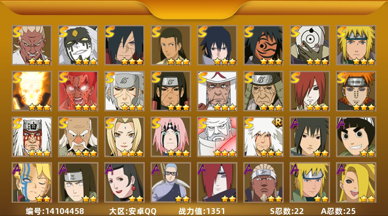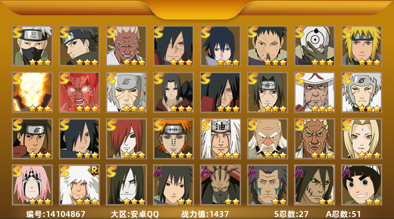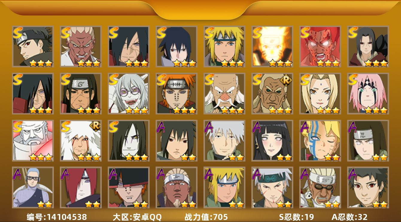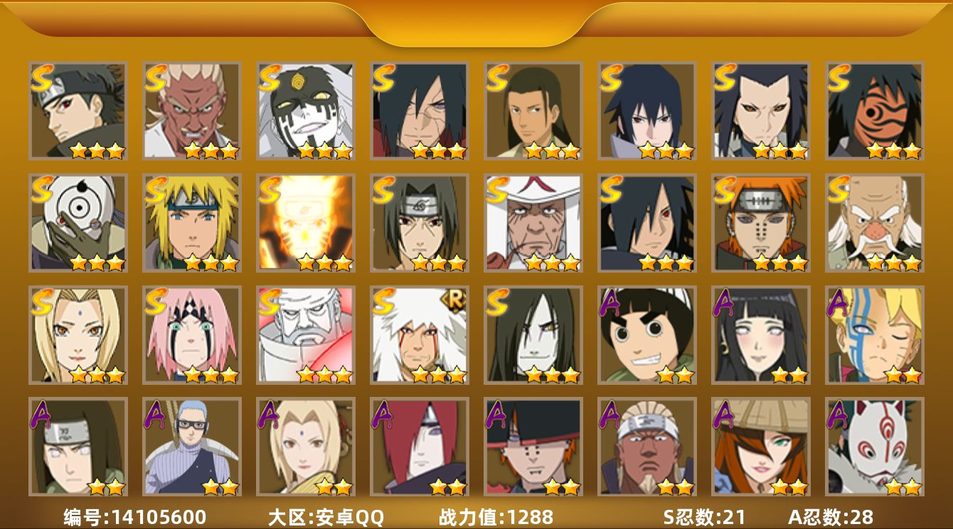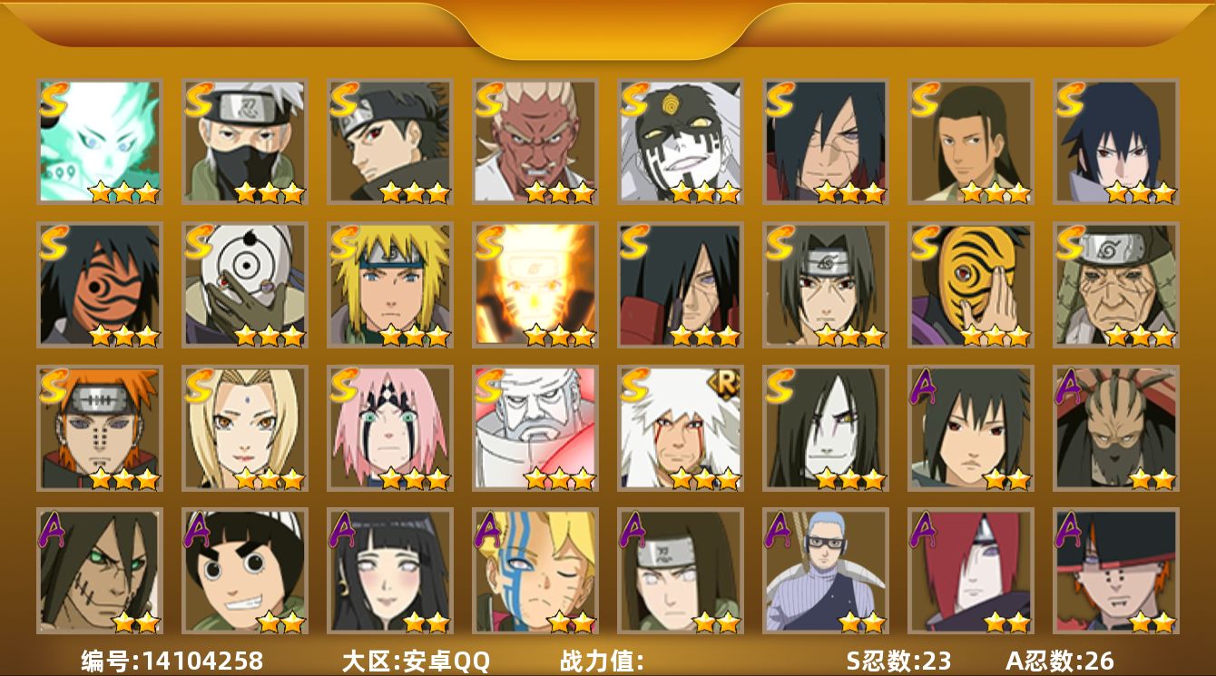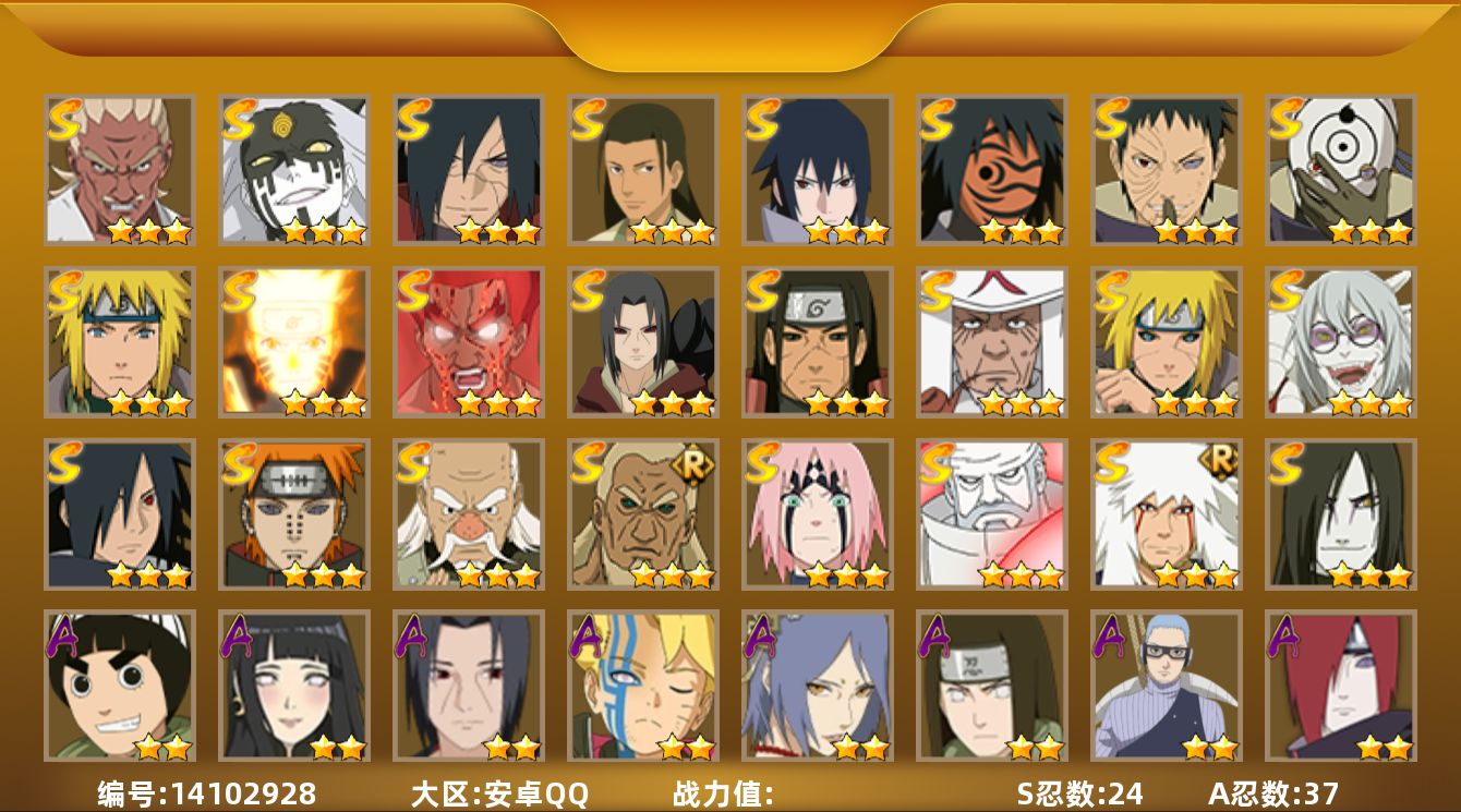 [14104538]【编号76745可秒换绑】【店长推荐捡漏号】19s级忍者数-32a级忍者数 【s级忍者】:千手柱间「秽土转生」3星,宇智波鼬「秽土转生」3星,宇智波斑「秽土转生」3星,宇智波斑「秽土转生·解」3星,大野木「忍界大战」3星,春野樱「忍界大战」3星,艾「忍界大战」3星,宇智波止水「须佐能乎」3星,艾「三代目雷影」3星,自来也「舞之豪杰」3星,大蛇丸3星,纲手3星,波风水门3星,药师兜「仙人模式」3星,漩涡鸣人「九喇嘛连结」3星,迈特凯「死门」3星,佩恩「天道」3星,宇智波佐助「永恒万花筒」3星,大筒木金式3星 【a级忍者】:艾「青年」2星,长门「青年」2星,波风水门「青年」2星,达鲁伊「博人传」2星,迪达拉2星,迪达拉「秽土转生」2星,奇拉比2星,奇拉比「忍界大战」2星,飞段3星,飞段「死司凭血」2星,干柿鬼鲛5星,漩涡博人「桃式显现」2星,迈特凯3星,迈特凯「忍界大战」2星,旗木卡卡西「幻之真容」2星,桃地再不斩「漂泊武士」2星,我爱罗「疾风传」4星,蝎3星,猿飞阿斯玛4星,宇智波止水「新春限定」2星,宇智波鼬2星,宇智波佐助「须佐能乎」2星,宇智波佐助「万花筒写轮眼」2星,照美冥「五代目水影」2星,日向宁次「忍界大战」2星,日向雏田「最终章」2星,长十郎「六代目水影」2星,佩恩·六道「漂泊浪客」2星,黑土「博人传」2星,千手扉间「漂泊武士」2星,千代「近松十人卫」2星,宇智波泉奈2星