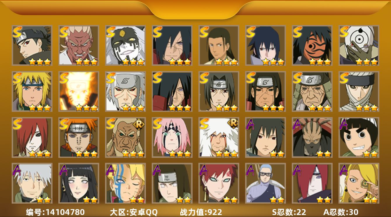 [14104458]【编号89579可秒换绑】【店长推荐精品号】22s级忍者数-25a级忍者数 【s级忍者】:长门「秽土转生」3星,猿飞日斩「秽土转生」3星,千手扉间「秽土转生」3星,千手柱间「秽土转生」3星,宇智波斑「秽土转生·解」3星,大野木「忍界大战」3星,春野樱「忍界大战」3星,艾「忍界大战」3星,千手柱间「木叶创立」3星,自来也「仙人模式」3星,自来也「舞之豪杰」3星,纲手5星,猿飞日斩3星,波风水门3星,神秘面具男「红夜之刃」3星,漩涡鸣人「九喇嘛连结」3星,迈特凯「死门」3星,佩恩「天道」3星,宇智波佐助「永恒万花筒」3星,宇智波斑 「白面具」3星宇智波斑「白面具」,大筒木金式3星,大筒木桃式3星 【a级忍者】:艾「青年」2星,长门「青年」2星,波风水门「青年」2星,迪达拉2星,迪达拉「秽土转生」2星,大蛇丸「晓」2星,飞段「死司凭血」2星,干柿鬼鲛5星,漩涡博人「桃式显现」2星,迈特凯5星,我爱罗「疾风传」3星,蝎5星,猿飞阿斯玛5星,宇智波鼬2星,宇智波佐助「万花筒写轮眼」2星,照美冥「五代目水影」2星,日向宁次「忍界大战」2星,长十郎「六代目水影」2星,李洛克「忍界大战」2星,黑土「博人传」2星,春野樱「百豪」2星,秋道丁次「忍界大战」2星,千代「近松十人卫」2星,不缘2星,宇智波泉奈2星