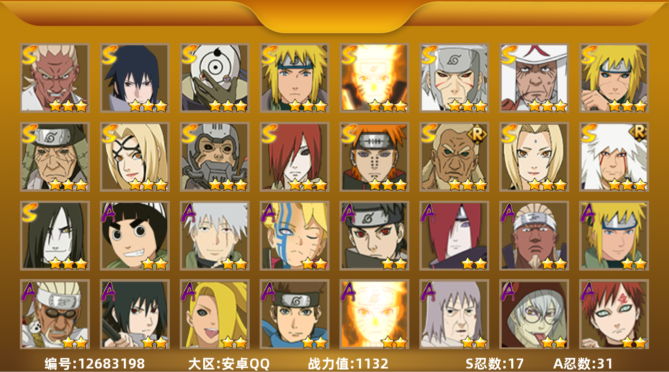 [12723027]【编号22675】【店长推荐精品号】16s级忍者数-24a级忍者数 【s级忍者】:猿飞日斩「秽土转生」3星,千手柱间「秽土转生」3星,宇智波斑「秽土转生」3星,宇智波斑「秽土转生·解」3星,艾「忍界大战」3星,宇智波止水「须佐能乎」3星,旗木卡卡西「须佐能乎」3星,自来也「舞之豪杰」3星,大蛇丸4星,纲手3星,猿飞日斩3星,波风水门3星,药师兜「仙人模式」3星,迈特凯「死门」3星,佩恩「天道」3星,宇智波佐助「永恒万花筒」3星 【a级忍者】:艾「青年」2星,波风水门「青年」2星,达鲁伊「博人传」2星,迪达拉2星,迪达拉「秽土转生」2星,奇拉比「忍界大战」2星,飞段3星,飞段「死司凭血」2星,干柿鬼鲛5星,漩涡博人「桃式显现」2星,漩涡鸣人「九尾查克拉」2星,迈特凯5星,我爱罗「疾风传」4星,蝎2星,猿飞阿斯玛5星,宇智波鼬2星,宇智波佐助「须佐能乎」2星,照美冥「五代目水影」2星,日向宁次「忍界大战」2星,长十郎「六代目水影」2星,李洛克「忍界大战」2星,黑土「博人传」2星,秋道丁次「忍界大战」2星,千代「近松十人卫」2星