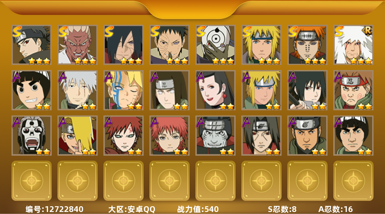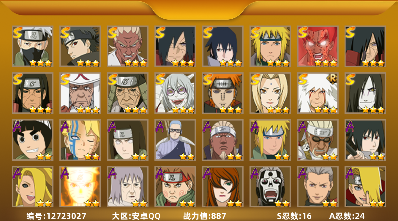 【编号22675】【店长推荐精品号】【商品标题】:16s级忍者数-24a级忍者数 【s级忍者】:猿飞日斩「秽土转生」3星,千手柱间「秽土转生」3星,宇智波斑「秽土转生」3星,宇智波斑「秽土转生·解」3星,艾「忍界大战」3星,宇智波止水「须佐能乎」3星,旗木卡卡西「须佐能乎」3星,自来也「舞之豪杰」3星,大蛇丸4星,纲手3星,猿飞日斩3星,波风水门3星,药师兜「仙人模式」3星,迈特凯「死门」3星,佩恩「天道」3星,宇智波佐助「永恒万花筒」3星 【a级忍者】:艾「青年」2星,波风水门「青年」2星,达鲁伊「博人传」2星,迪达拉2星,迪达拉「秽土转生」2星,奇拉比「忍界大战」2星,飞段3星,飞段「死司凭血」2星,干柿鬼鲛5星,漩涡博人「桃式显现」2星,漩涡鸣人「九尾查克拉」2星,迈特凯5星,我爱罗「疾风传」4星,蝎2星,猿飞阿斯玛5星,宇智波鼬2星,宇智波佐助「须佐能乎」2星,照美冥「五代目水影」2星,日向宁次「忍界大战」2星,长十郎「六代目水影」2星,李洛克「忍界大战」2星,黑土「博人传」2星,秋道丁次「忍界大战」2星,千代「近松十人卫」2星