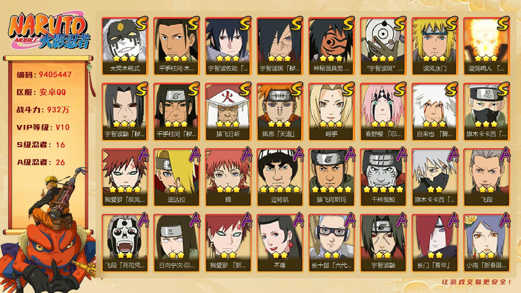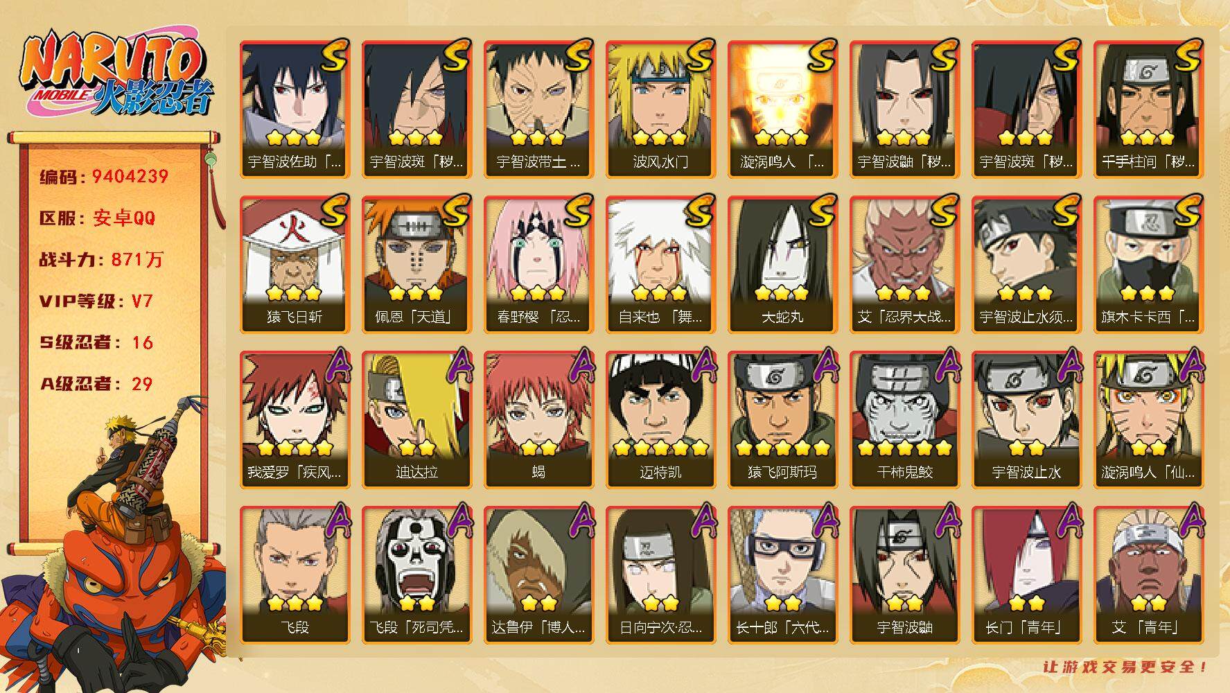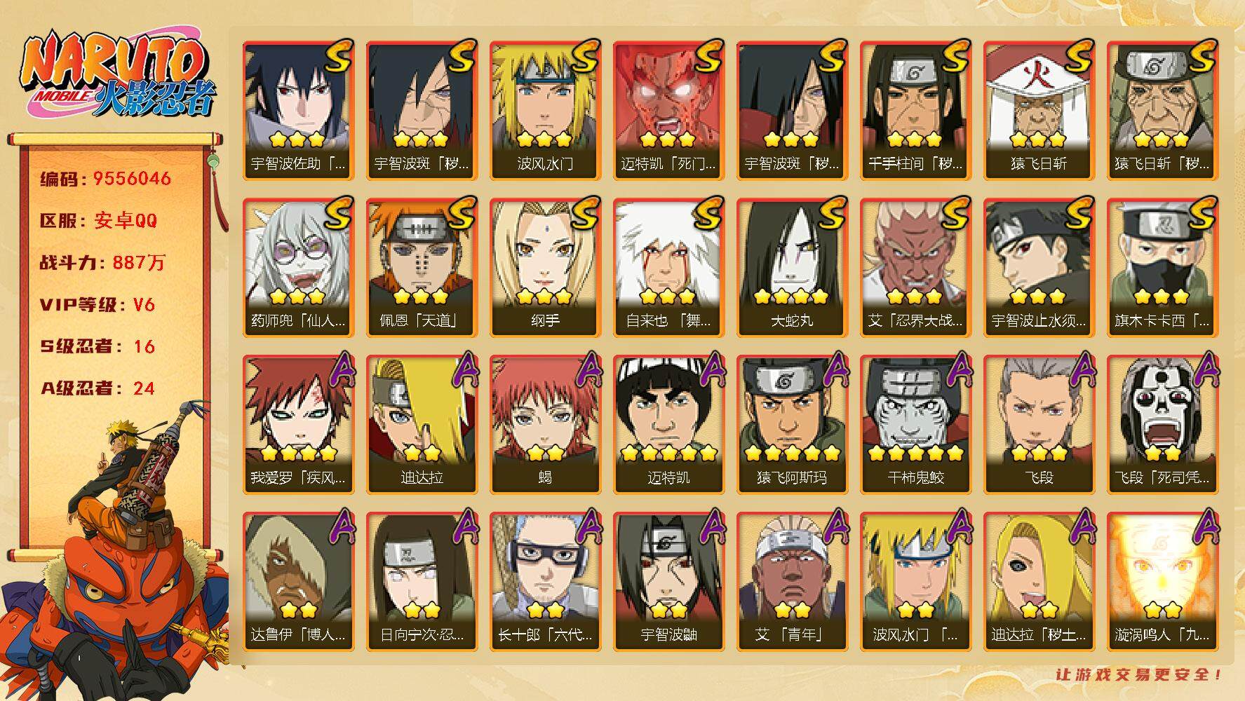 【编号15895可秒换绑】【店长推荐精品号】【商品标题】:8s级忍者数-16a级忍者数 【s级忍者】:宇智波斑「秽土转生·解」3星,宇智波带土「忍界大战」3星,艾「忍界大战」3星,宇智波止水「须佐能乎」3星,自来也「舞之豪杰」3星,波风水门3星,佩恩「天道」3星,宇智波斑 「白面具」3星宇智波斑「白面具」 【a级忍者】:波风水门「青年」2星,迪达拉2星,飞段「死司凭血」2星,干柿鬼鲛4星,漩涡博人「桃式显现」2星,迈特凯4星,旗木卡卡西「幻之真容」2星,我爱罗「疾风传」2星,蝎2星,猿飞阿斯玛4星,宇智波鼬2星,宇智波佐助「须佐能乎」2星,日向宁次「忍界大战」2星,李洛克「忍界大战」2星,秋道丁次「忍界大战」2星,不缘2星
