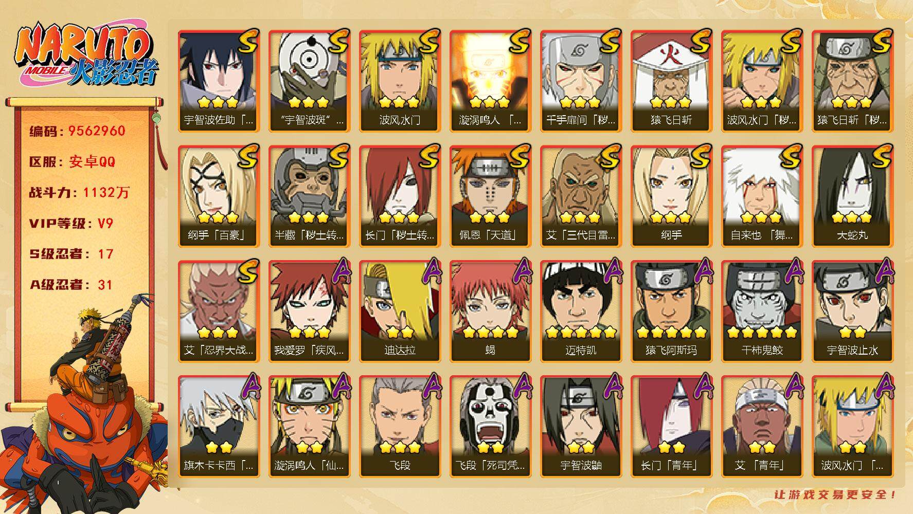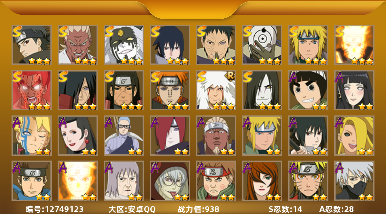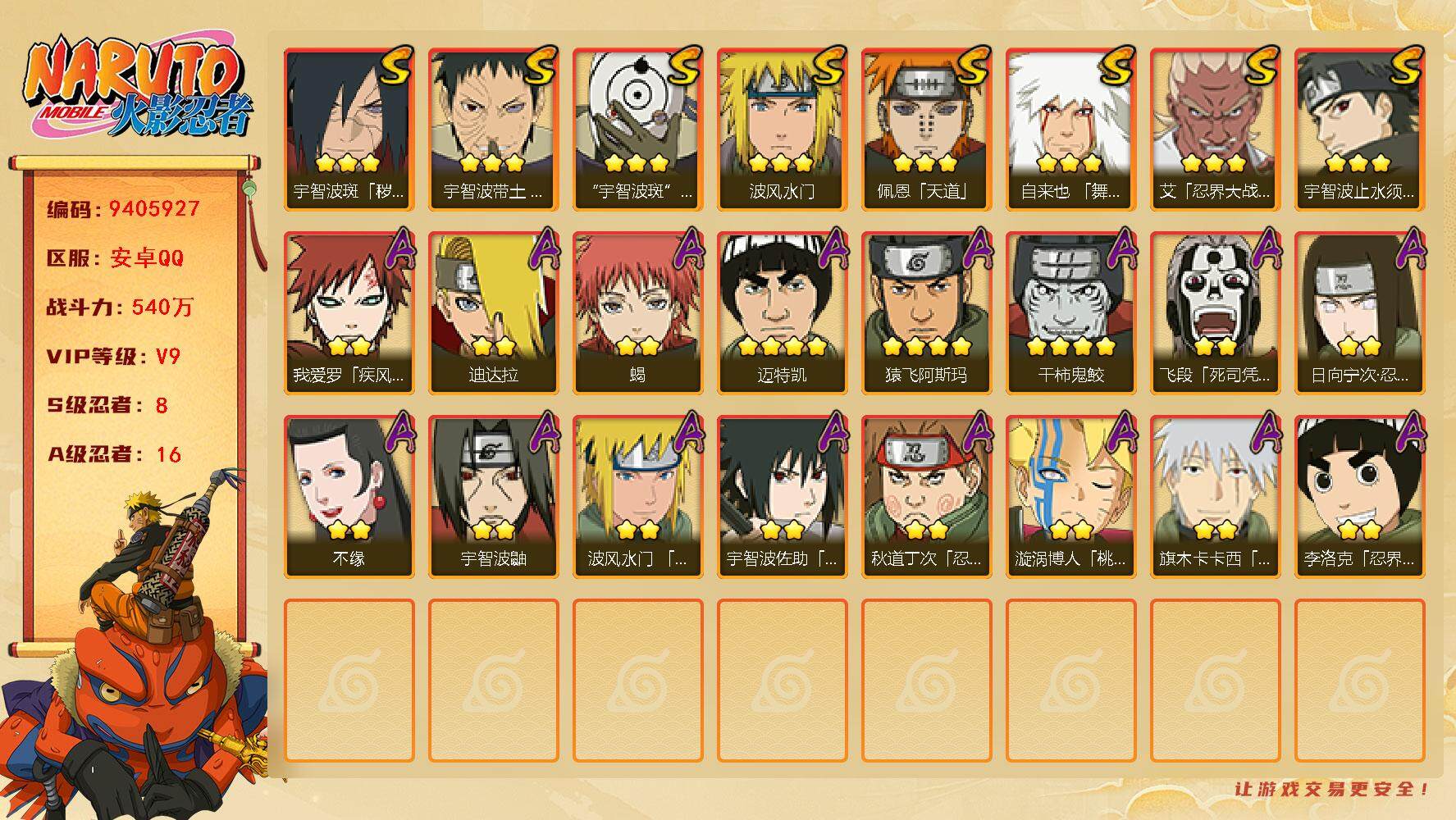 【编号15895可秒换绑】【店长推荐精品号】【商品标题】:8s级忍者数-16a级忍者数 【s级忍者】:宇智波斑「秽土转生·解」3星,宇智波带土「忍界大战」3星,艾「忍界大战」3星,宇智波止水「须佐能乎」3星,自来也「舞之豪杰」3星,波风水门3星,佩恩「天道」3星,宇智波斑 「白面具」3星宇智波斑「白面具」 【a级忍者】:波风水门「青年」2星,迪达拉2星,飞段「死司凭血」2星,干柿鬼鲛4星,漩涡博人「桃式显现」2星,迈特凯4星,旗木卡卡西「幻之真容」2星,我爱罗「疾风传」2星,蝎2星,猿飞阿斯玛4星,宇智波鼬2星,宇智波佐助「须佐能乎」2星,日向宁次「忍界大战」2星,李洛克「忍界大战」2星,秋道丁次「忍界大战」2星,不缘2星