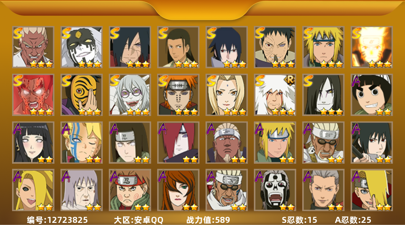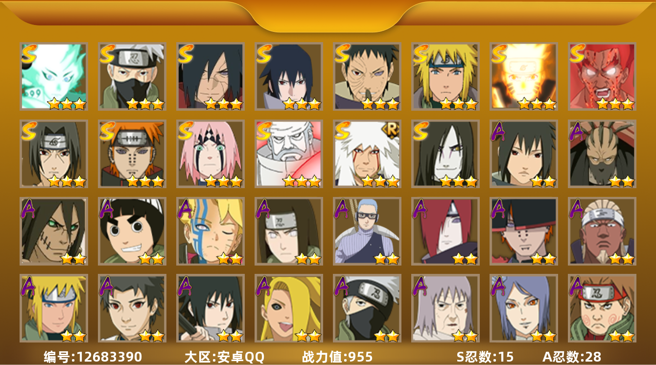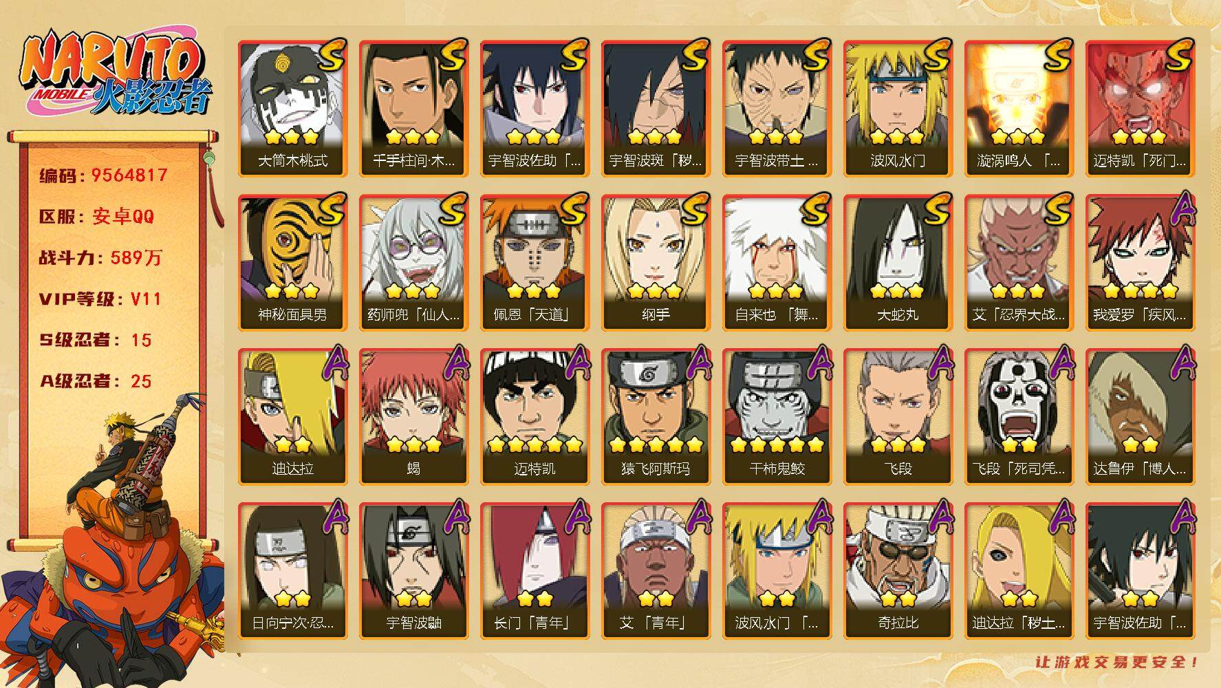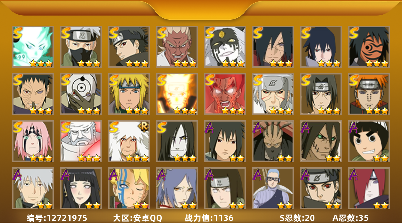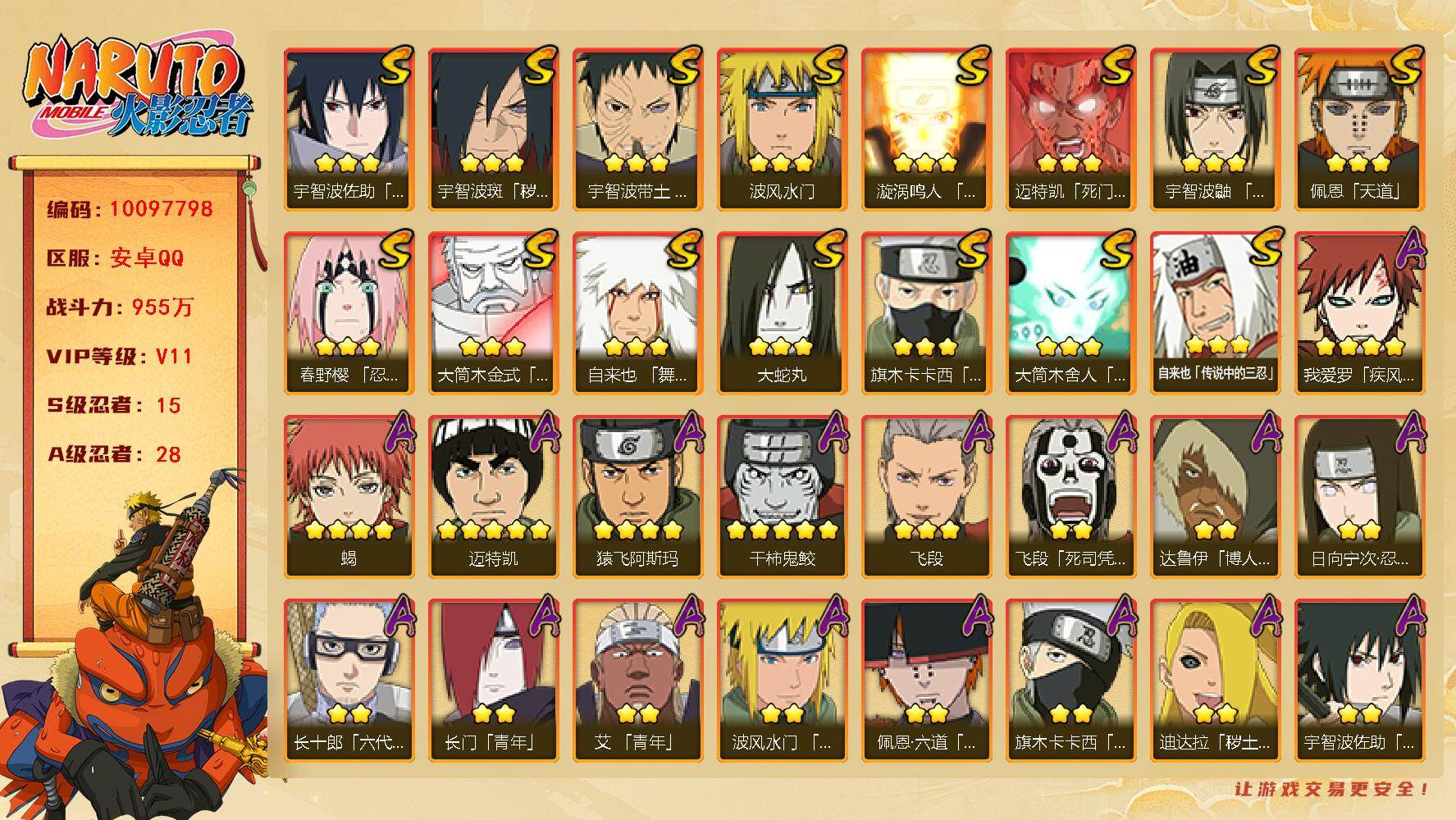 [12683390]【编号20536可秒换绑】【店长推荐捡漏号】15s级忍者数-28a级忍者数 【s级忍者】:宇智波斑「秽土转生·解」3星,春野樱「忍界大战」3星,宇智波带土「忍界大战」3星,宇智波鼬「须佐能乎」3星,旗木卡卡西「须佐能乎」3星,自来也「舞之豪杰」3星,大蛇丸3星,自来也「传说中的三忍」3星,波风水门3星,漩涡鸣人「九喇嘛连结」3星,迈特凯「死门」3星,佩恩「天道」3星,宇智波佐助「永恒万花筒」3星,大筒木金式3星,大筒木舍人「最终章」3星 【a级忍者】:艾「青年」2星,长门「青年」2星,波风水门「青年」2星,达鲁伊「博人传」2星,迪达拉「秽土转生」2星,飞段3星,飞段「死司凭血」2星,干柿鬼鲛5星,漩涡博人「桃式显现」2星,迈特凯5星,旗木卡卡西「忍界大战」2星,我爱罗「疾风传」4星,蝎4星,蝎「绯流琥」2星,小南「夏日泳装」2星,角都「秽土转生」2星,猿飞阿斯玛4星,宇智波止水「新春限定」2星,宇智波佐助「须佐能乎」2星,照美冥「五代目水影」2星,日向宁次「忍界大战」2星,长十郎「六代目水影」2星,佩恩·六道「漂泊浪客」2星,李洛克「忍界大战」2星,秋道丁次「忍界大战」2星,千代「近松十人卫」2星,神农「羁绊」2星,宇智波泉奈2星