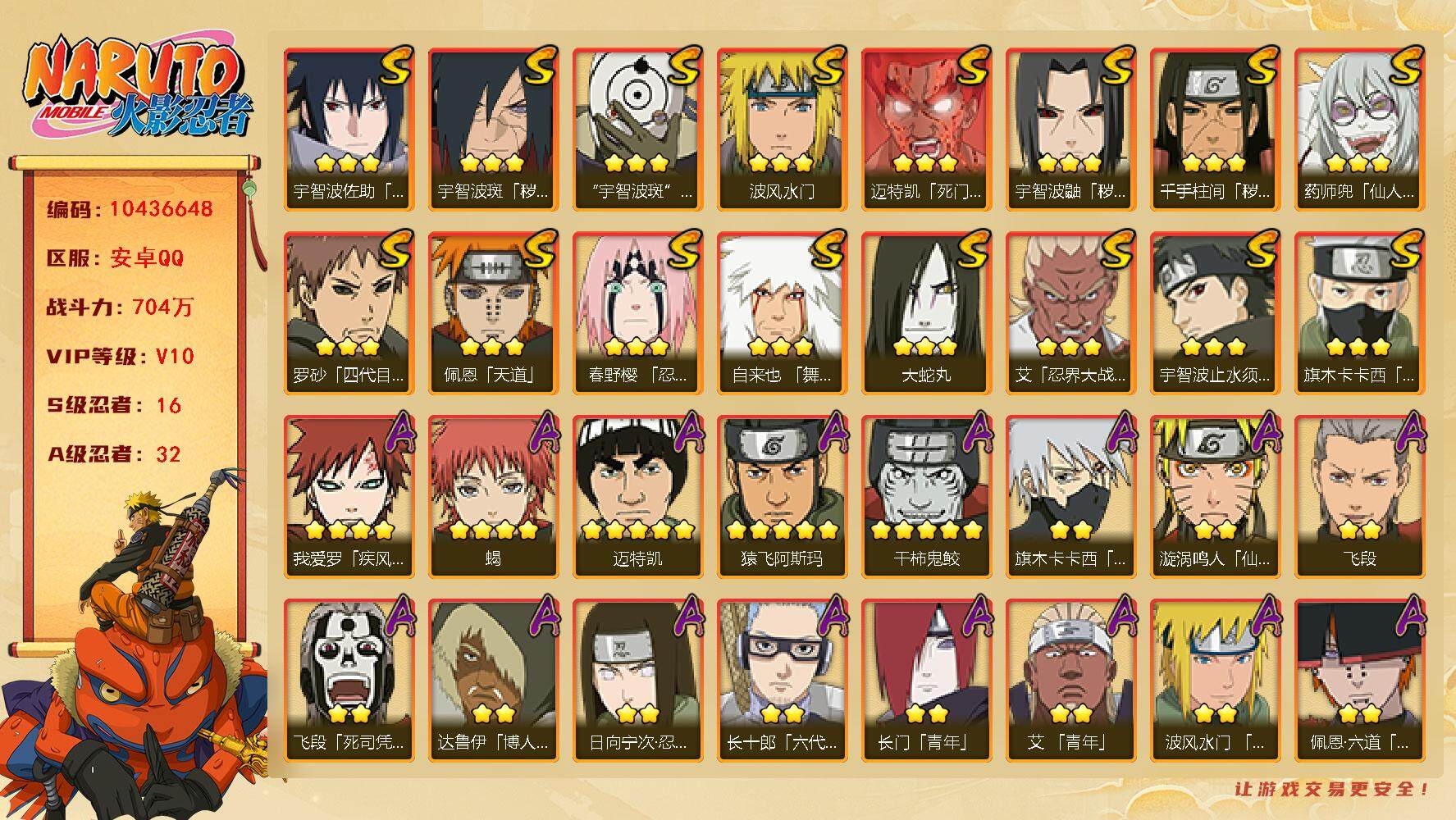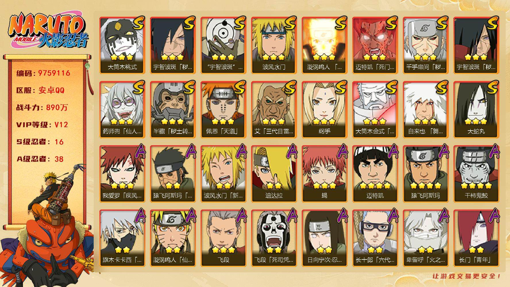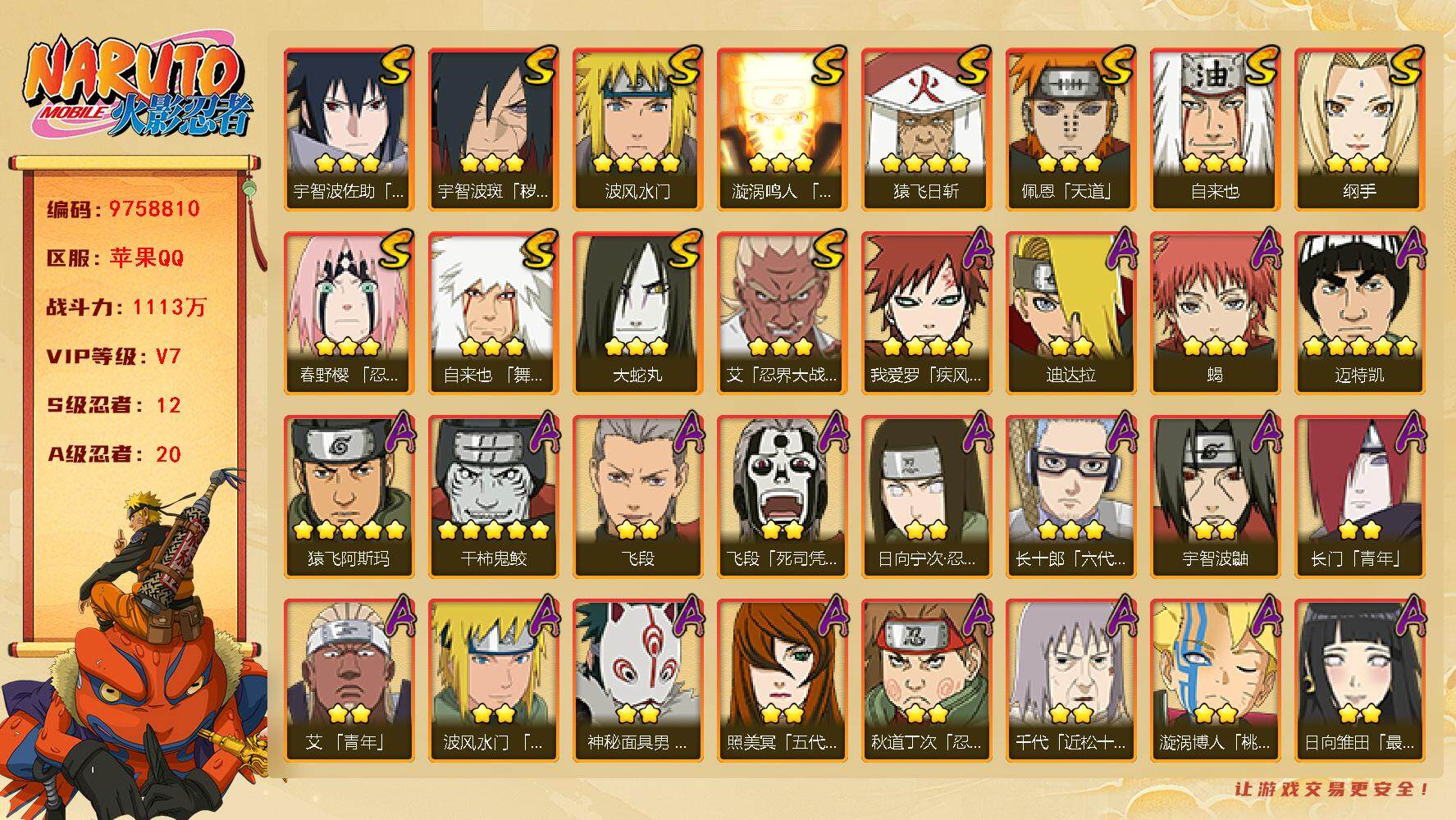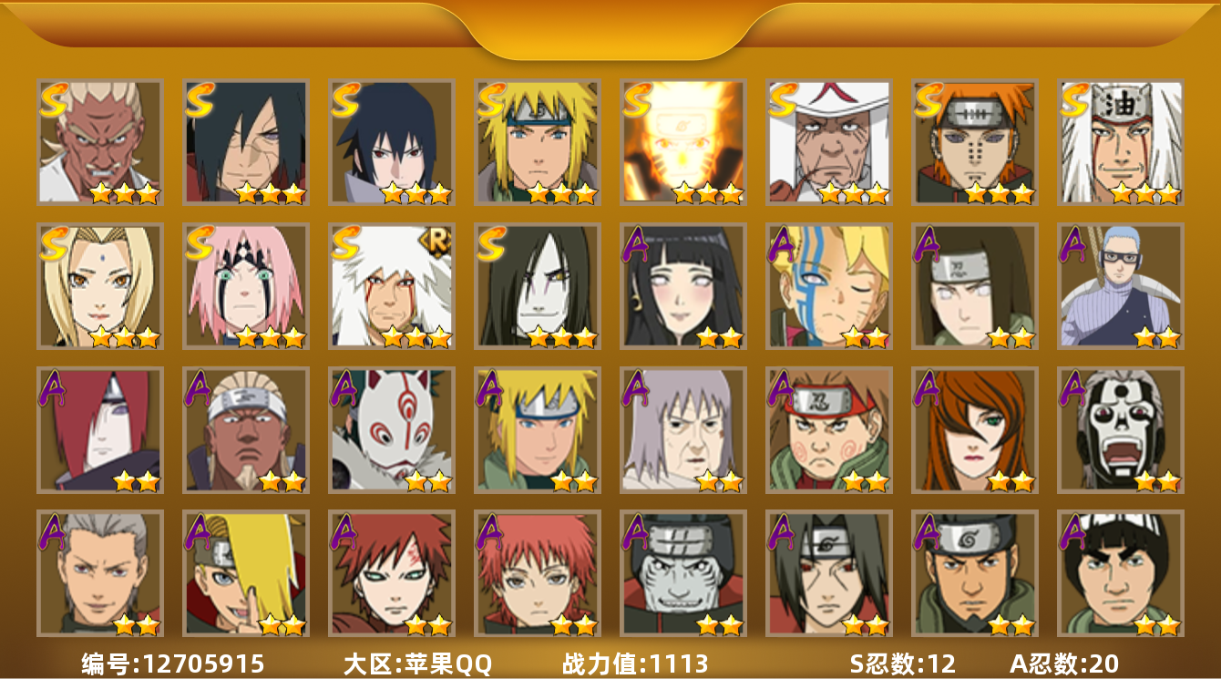 【编号12126可秒换绑】店长推荐特价处理精品号【商品标题】:12s级忍者数-20a级忍者数 【s级忍者】:宇智波斑「秽土转生·解」3星,春野樱「忍界大战」3星,艾「忍界大战」3星,自来也3星,自来也「舞之豪杰」3星,大蛇丸3星,纲手3星,猿飞日斩4星,波风水门4星,漩涡鸣人「九喇嘛连结」3星,佩恩「天道」3星,宇智波佐助「永恒万花筒」3星 【a级忍者】:艾「青年」2星,长门「青年」2星,波风水门「青年」2星,迪达拉2星,飞段2星,飞段「死司凭血」2星,干柿鬼鲛5星,漩涡博人「桃式显现」2星,迈特凯5星,我爱罗「疾风传」4星,蝎3星,猿飞阿斯玛5星,宇智波鼬2星,照美冥「五代目水影」2星,日向宁次「忍界大战」2星,日向雏田「最终章」2星,长十郎「六代目水影」3星,神秘面具男「忍者之路」2星,秋道丁次「忍界大战」2星,千代「近松十人卫」2星
