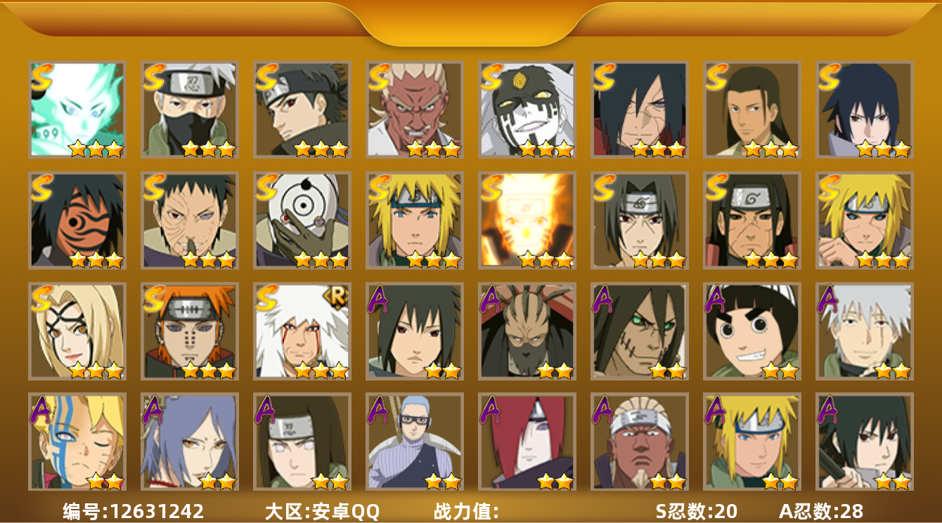 [12631242]【编号08551可秒换绑】店长推荐精品号20s级忍者数-28a级忍者数 【s级忍者】:波风水门「秽土转生」3星,千手柱间「秽土转生」3星,宇智波斑「秽土转生·解」3星,宇智波带土「忍界大战」3星,艾「忍界大战」3星,宇智波鼬「须佐能乎」3星,宇智波止水「须佐能乎」3星,旗木卡卡西「须佐能乎」3星,千手柱间「木叶创立」3星,自来也「舞之豪杰」3星,自来也「传说中的三忍」3星,纲手「百豪」3星,波风水门4星,神秘面具男「红夜之刃」3星,漩涡鸣人「九喇嘛连结」3星,佩恩「天道」3星,宇智波佐助「永恒万花筒」3星,宇智波斑 「白面具」3星宇智波斑「白面具」,大筒木桃式3星,大筒木舍人「最终章」3星 【a级忍者】:艾「青年」2星,长门「青年」2星,波风水门「青年」2星,迪达拉2星,飞段2星,飞段「死司凭血」2星,干柿鬼鲛5星,漩涡博人「桃式显现」2星,漩涡鸣人「九尾查克拉」2星,迈特凯5星,旗木卡卡西「幻之真容」2星,我爱罗「疾风传」3星,蝎4星,蝎「绯流琥」2星,小南「漂泊浪客」2星,角都「秽土转生」2星,猿飞阿斯玛5星,宇智波鼬2星,宇智波佐助「须佐能乎」2星,宇智波佐助「万花筒写轮眼」2星,照美冥「五代目水影」2星,日向宁次「忍界大战」2星,长十郎「六代目水影」2星,李洛克「忍界大战」2星,黑土「博人传」2星,秋道丁次「忍界大战」2星,千代「近松十人卫」2星,宇智波泉奈2星
