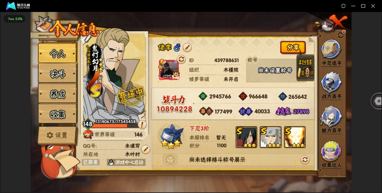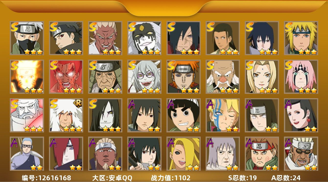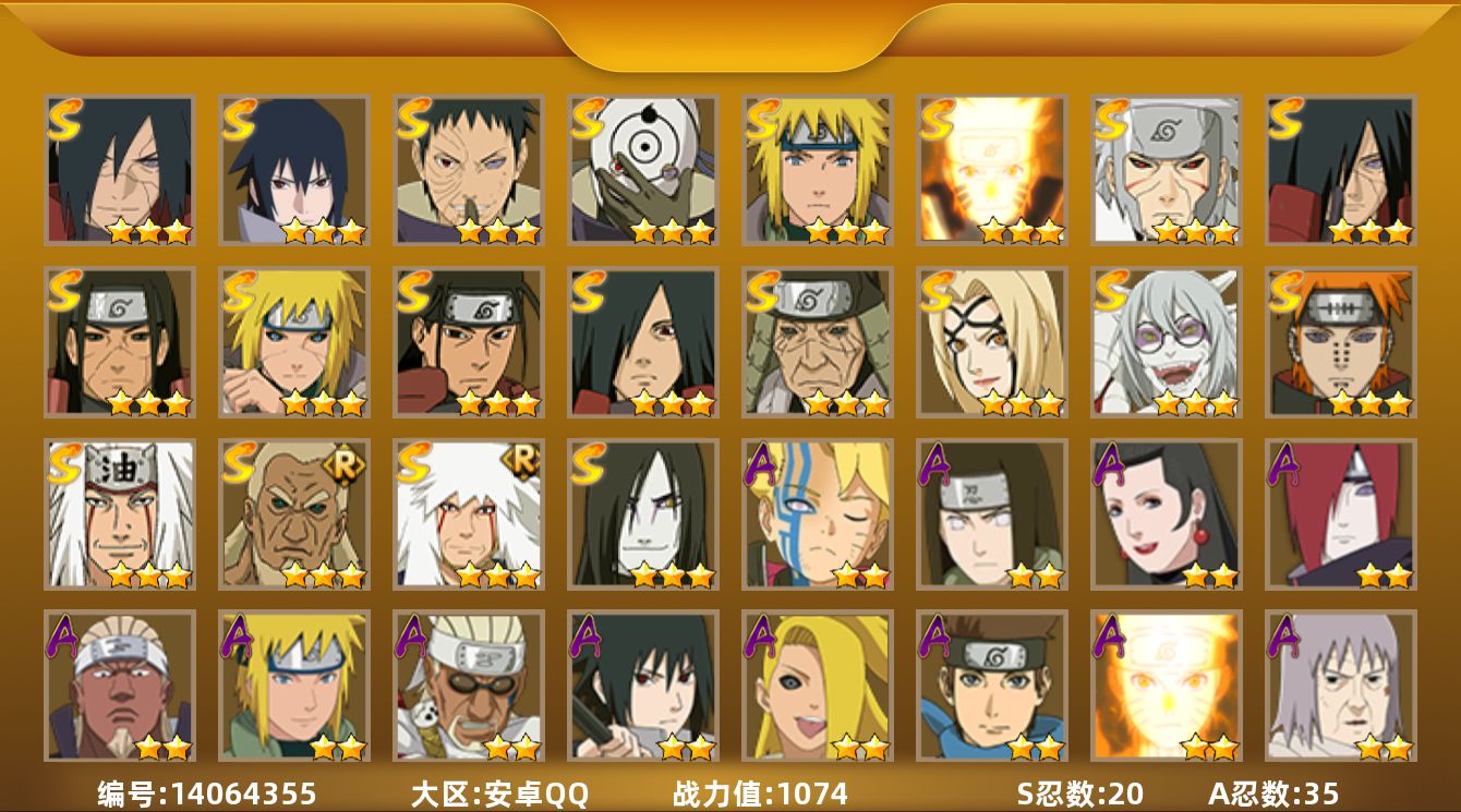 v12 24s忍 49a忍 21通灵 1089.4w战力 可二次 可修改实名 【s级忍者】:艾「忍界大战」大筒木桃式宇智波斑「秽土转生·解」春野樱 「忍界大战」漩涡鸣人 「九喇嘛连结」大野木 「忍界大战」迈特凯「死门」宇智波斑 「木叶创立」宇智波带土 「忍界大战」千手柱间「秽土转