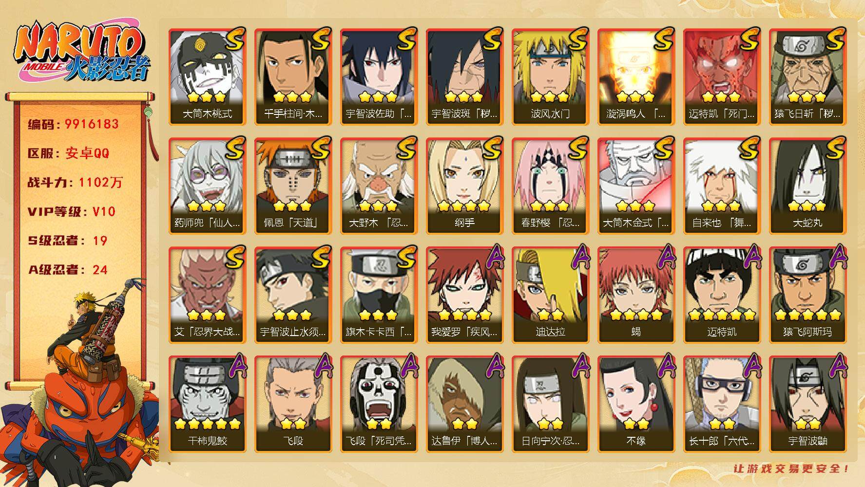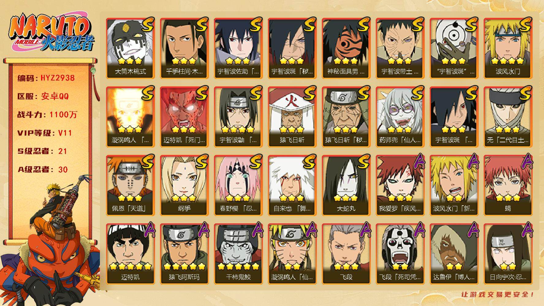 【hyz2938】v11/战力1100w/s忍21/a忍30/新春水门/忍战卡卡西/侠影纲手/纲手/达鲁伊/死司飞段/无「二代目土影」/5星猿飞阿斯玛/秽土日斩/3星蝎/5星迈特凯/忍战奇拉比/创立柱间/仙人兜/大筒木桃式/长十郎/2星桃地再不斩「秽土转生」/白面具/死门凯/漂泊六道/猿飞日斩/秽土迪达拉/忍战樱/九尾鸣人/不缘/晓大蛇/日向宁次「忍界大战」/永恒万花筒佐助/忍战带土/3星飞段