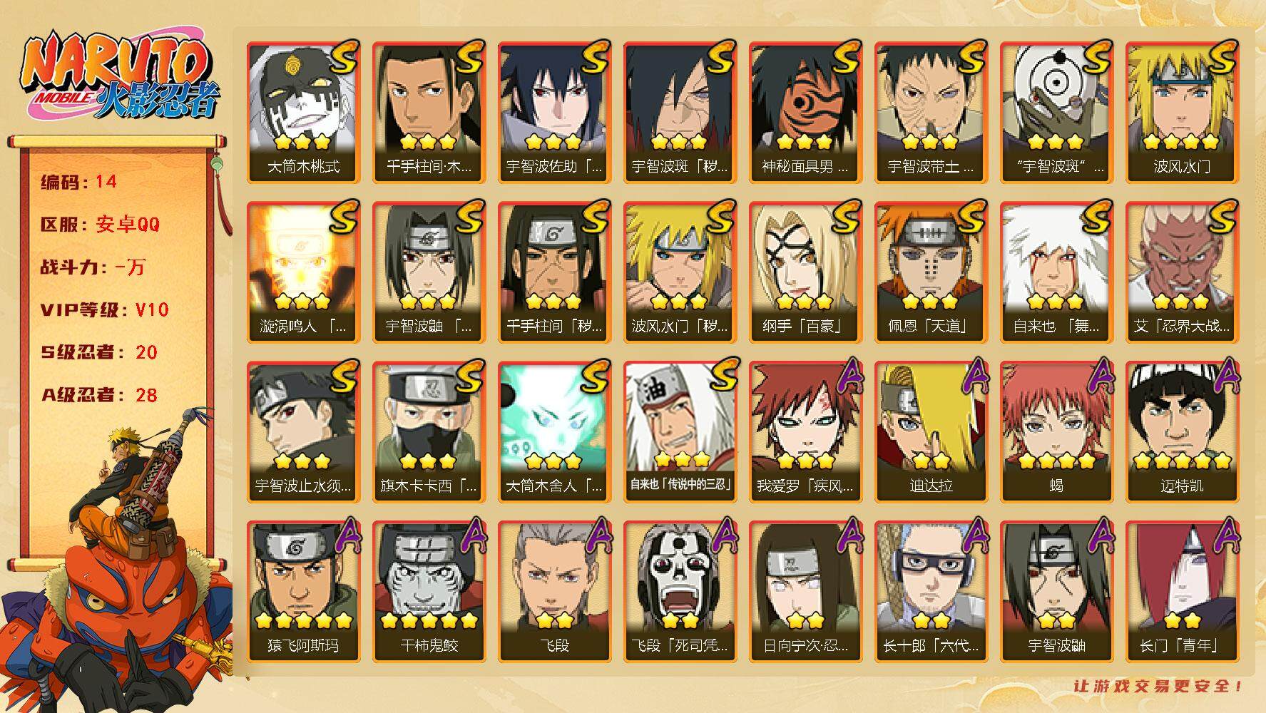 [14064355]【编号51679可秒换绑】【店长推荐捡漏号】20s级忍者数-35a级忍者数 【s级忍者】:猿飞日斩「秽土转生」3星,波风水门「秽土转生」3星,千手扉间「秽土转生」3星,千手柱间「秽土转生」3星,宇智波斑「秽土转生」3星,宇智波斑「秽土转生·解」3星,宇智波带土「忍界大战」3星,艾「三代目雷影」3星,自来也3星,自来也「舞之豪杰」3星,大蛇丸4星,纲手「百豪」3星,千手柱间3星,宇智波斑3星,波风水门3星,药师兜「仙人模式」3星,漩涡鸣人「九喇嘛连结」3星,佩恩「天道」3星,宇智波佐助「永恒万花筒」3星,宇智波斑 「白面具」3星宇智波斑「白面具」 【a级忍者】:艾「青年」2星,长门「青年」2星,波风水门「青年」2星,达鲁伊「博人传」2星,迪达拉2星,迪达拉「秽土转生」2星,大蛇丸「晓」2星,奇拉比「忍界大战」2星,飞段4星,飞段「死司凭血」3星,干柿鬼鲛5星,漩涡博人「桃式显现」2星,漩涡鸣人「仙人模式」2星,漩涡鸣人「九尾查克拉」2星,迈特凯5星,旗木卡卡西「万花筒写轮眼」2星,我爱罗「疾风传」3星,我爱罗「忍界大战」2星,蝎5星,小南2星,角都2星,角都「地怨虞」2星,猿飞阿斯玛5星,猿飞阿斯玛「秽土转生」2星,宇智波鼬2星,宇智波佐助「须佐能乎」2星,宇智波佐助「万花筒写轮眼」2星,药师兜「半蛇斗篷」2星,照美冥「五代目水影」2星,日向宁次「忍界大战」2星,猿飞木叶丸「博人传」2星,黑土「博人传」2星,秋道丁次「忍界大战」2星,千代「近松十人卫」2星,不缘2星