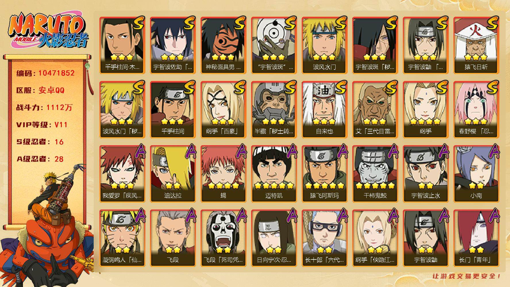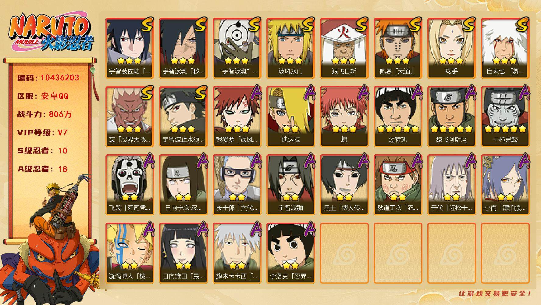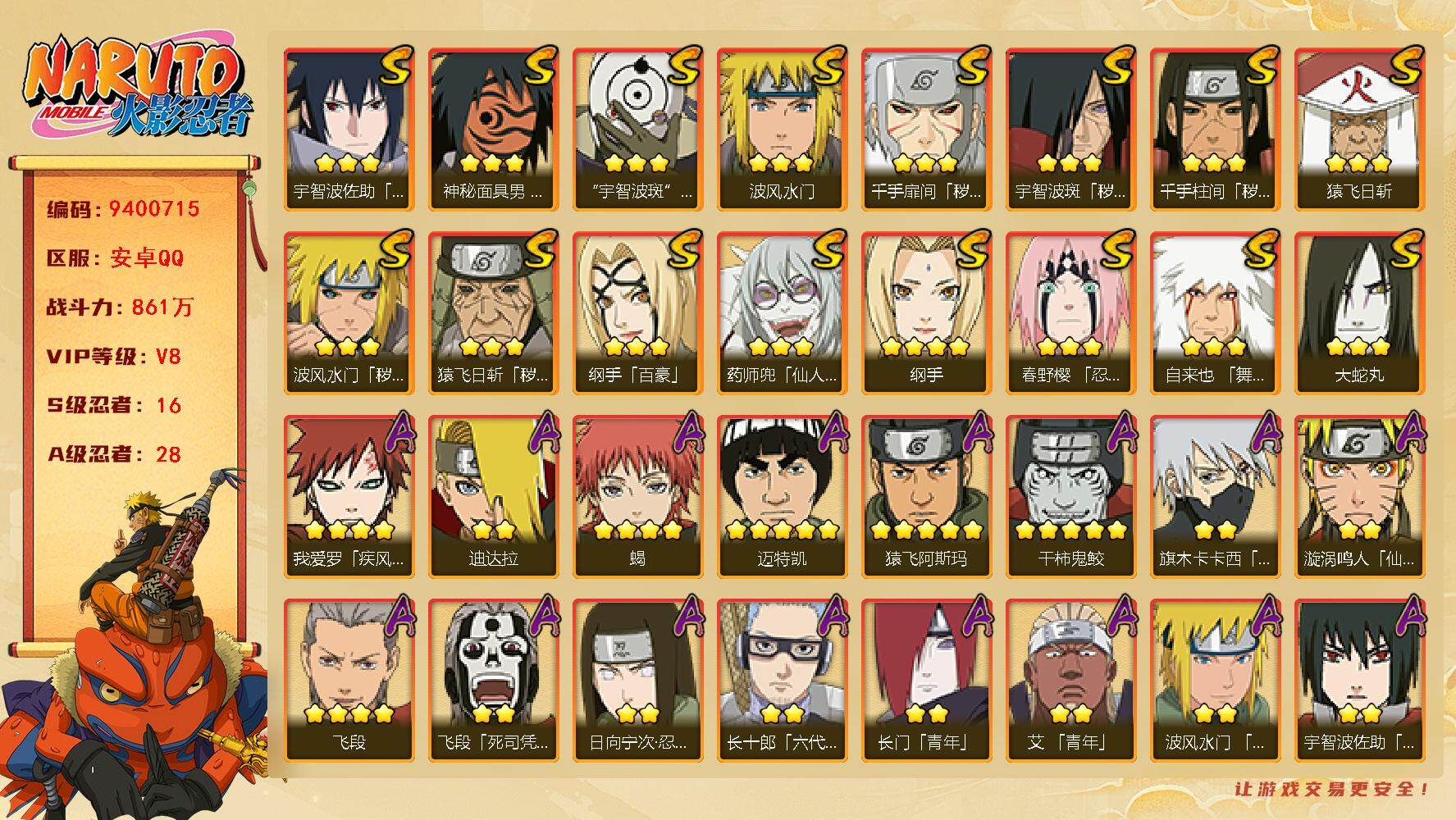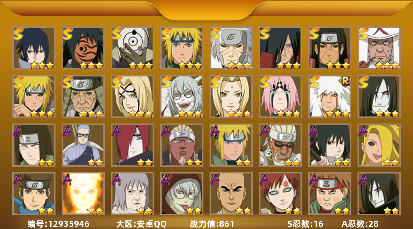[12935946]【编号57720 可秒换绑】【店长推荐捡漏号!】16s级忍者数-28a级忍者数 【s级忍者】:猿飞日斩「秽土转生」3星,波风水门「秽土转生」3星,千手扉间「秽土转生」3星,千手柱间「秽土转生」3星,宇智波斑「秽土转生」3星,春野樱「忍界大战」3星,自来也「舞之豪杰」3星,大蛇丸3星,纲手4星,纲手「百豪」3星,猿飞日斩3星,波风水门3星,药师兜「仙人模式」3星,神秘面具男「红夜之刃」3星,宇智波佐助「永恒万花筒」3星,宇智波斑 「白面具」3星宇智波斑「白面具」 【a级忍者】:艾「青年」2星,长门「青年」2星,波风水门「青年」2星,迪达拉2星,迪达拉「秽土转生」2星,大蛇丸「晓」2星,奇拉比「忍界大战」2星,飞段4星,飞段「死司凭血」2星,干柿鬼鲛5星,漩涡鸣人「仙人模式」2星,漩涡鸣人「九尾查克拉」2星,迈特凯5星,旗木卡卡西「万花筒写轮眼」2星,我爱罗「疾风传」4星,我爱罗「忍界大战」2星,蝎4星,猿飞阿斯玛5星,猿飞日斩「火影继承人」2星,宇智波佐助「须佐能乎」2星,宇智波佐助「万花筒写轮眼」2星,药师兜「半蛇斗篷」2星,日向宁次「忍界大战」2星,长十郎「六代目水影」2星,猿飞木叶丸「博人传」2星,秋道丁次「忍界大战」2星,千代「近松十人卫」2星,地陆2星