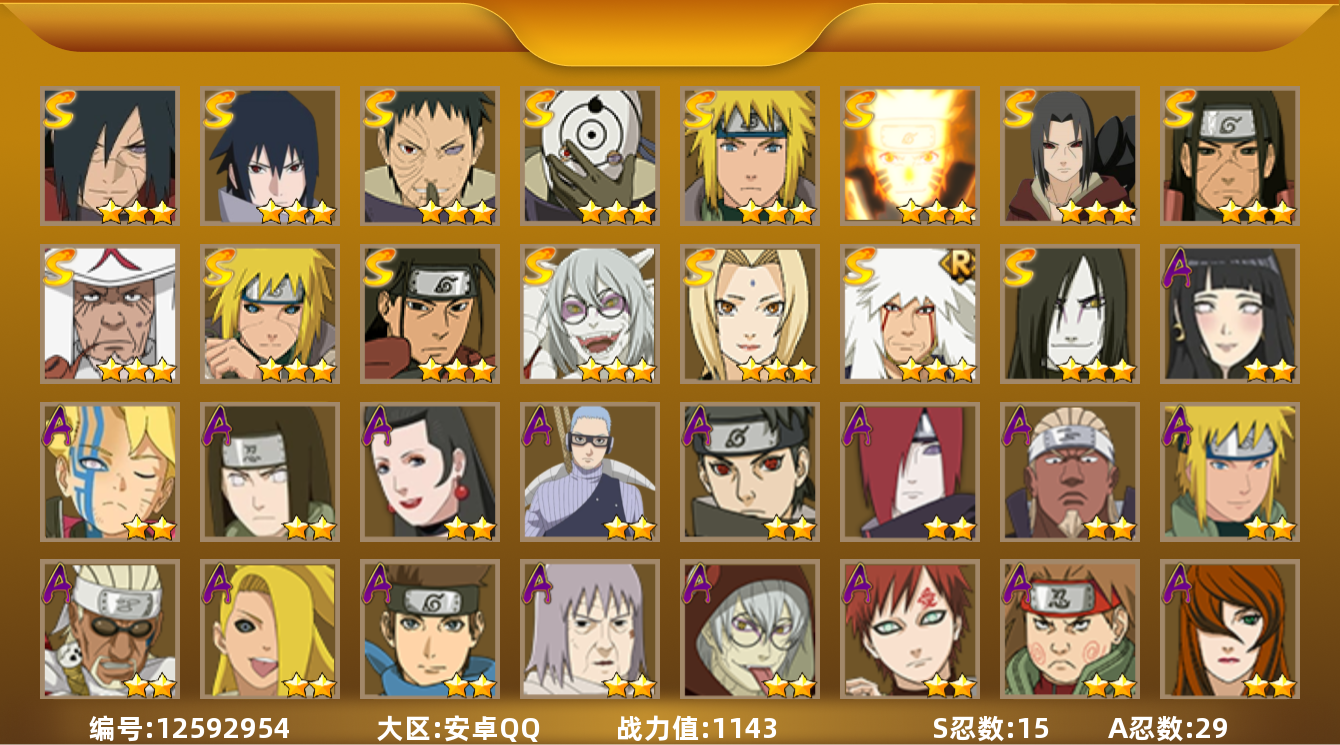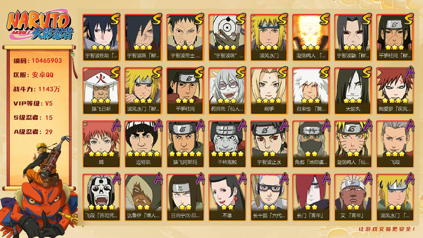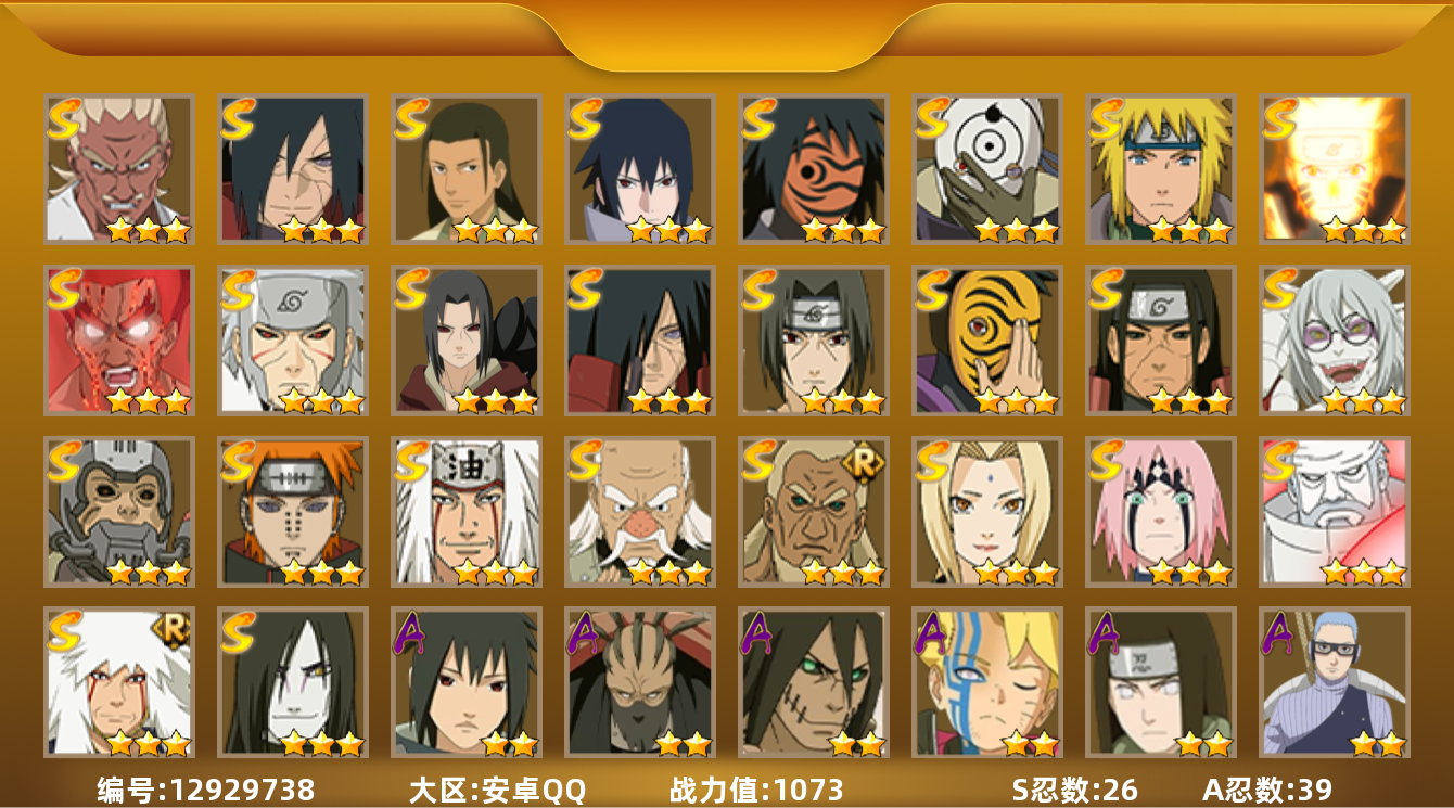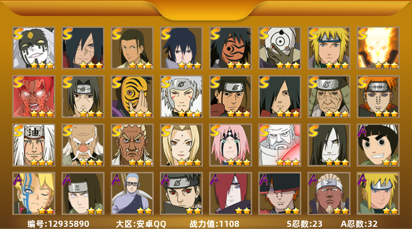 [12935946]【编号57720 可秒换绑】【店长推荐捡漏号!】16s级忍者数-28a级忍者数 【s级忍者】:猿飞日斩「秽土转生」3星,波风水门「秽土转生」3星,千手扉间「秽土转生」3星,千手柱间「秽土转生」3星,宇智波斑「秽土转生」3星,春野樱「忍界大战」3星,自来也「舞之豪杰」3星,大蛇丸3星,纲手4星,纲手「百豪」3星,猿飞日斩3星,波风水门3星,药师兜「仙人模式」3星,神秘面具男「红夜之刃」3星,宇智波佐助「永恒万花筒」3星,宇智波斑 「白面具」3星宇智波斑「白面具」 【a级忍者】:艾「青年」2星,长门「青年」2星,波风水门「青年」2星,迪达拉2星,迪达拉「秽土转生」2星,大蛇丸「晓」2星,奇拉比「忍界大战」2星,飞段4星,飞段「死司凭血」2星,干柿鬼鲛5星,漩涡鸣人「仙人模式」2星,漩涡鸣人「九尾查克拉」2星,迈特凯5星,旗木卡卡西「万花筒写轮眼」2星,我爱罗「疾风传」4星,我爱罗「忍界大战」2星,蝎4星,猿飞阿斯玛5星,猿飞日斩「火影继承人」2星,宇智波佐助「须佐能乎」2星,宇智波佐助「万花筒写轮眼」2星,药师兜「半蛇斗篷」2星,日向宁次「忍界大战」2星,长十郎「六代目水影」2星,猿飞木叶丸「博人传」2星,秋道丁次「忍界大战」2星,千代「近松十人卫」2星,地陆2星