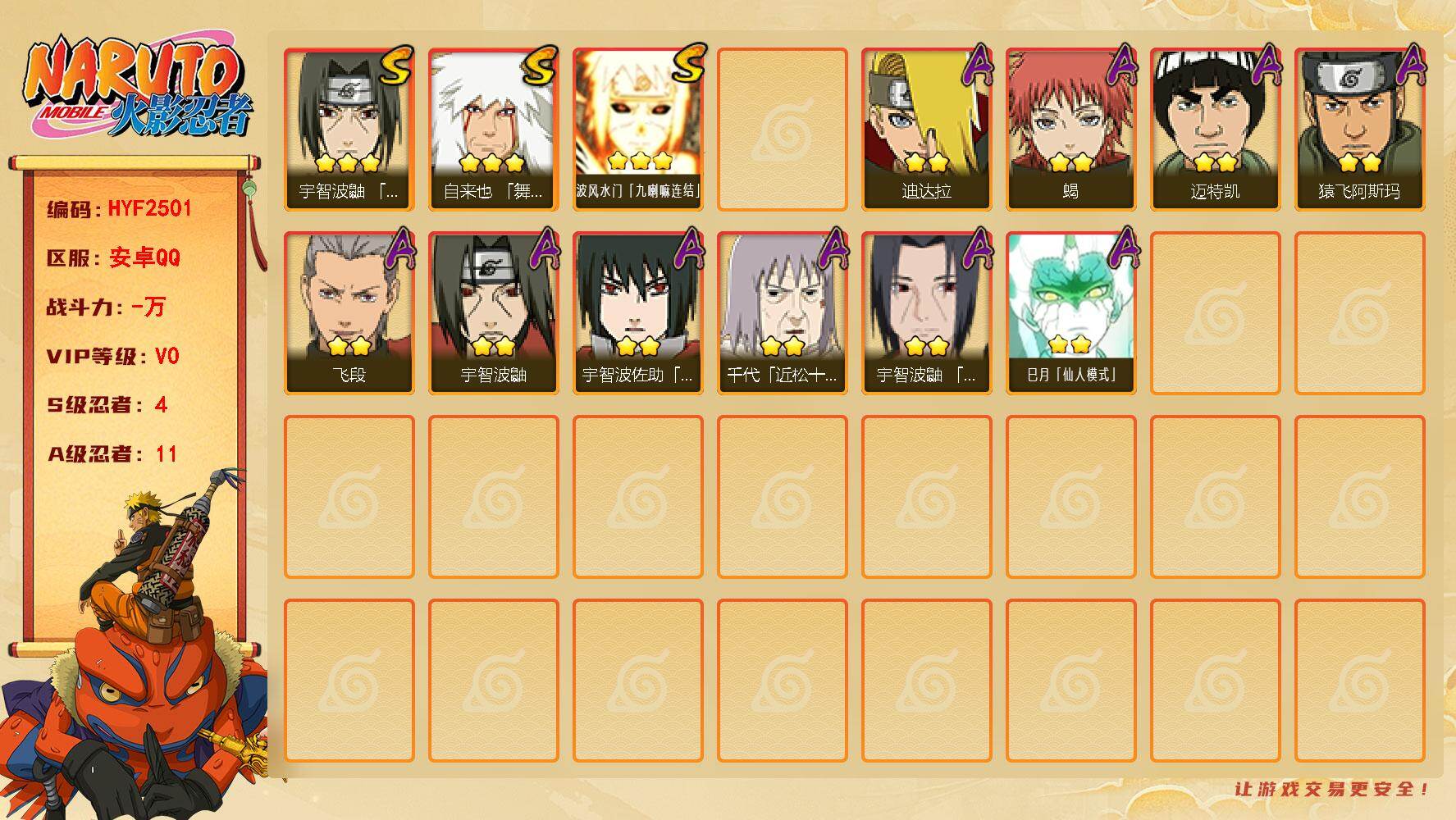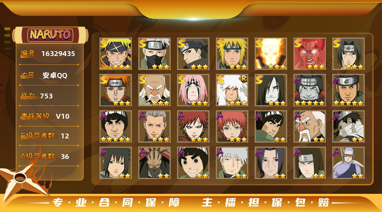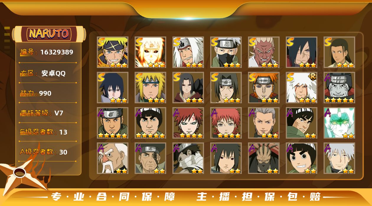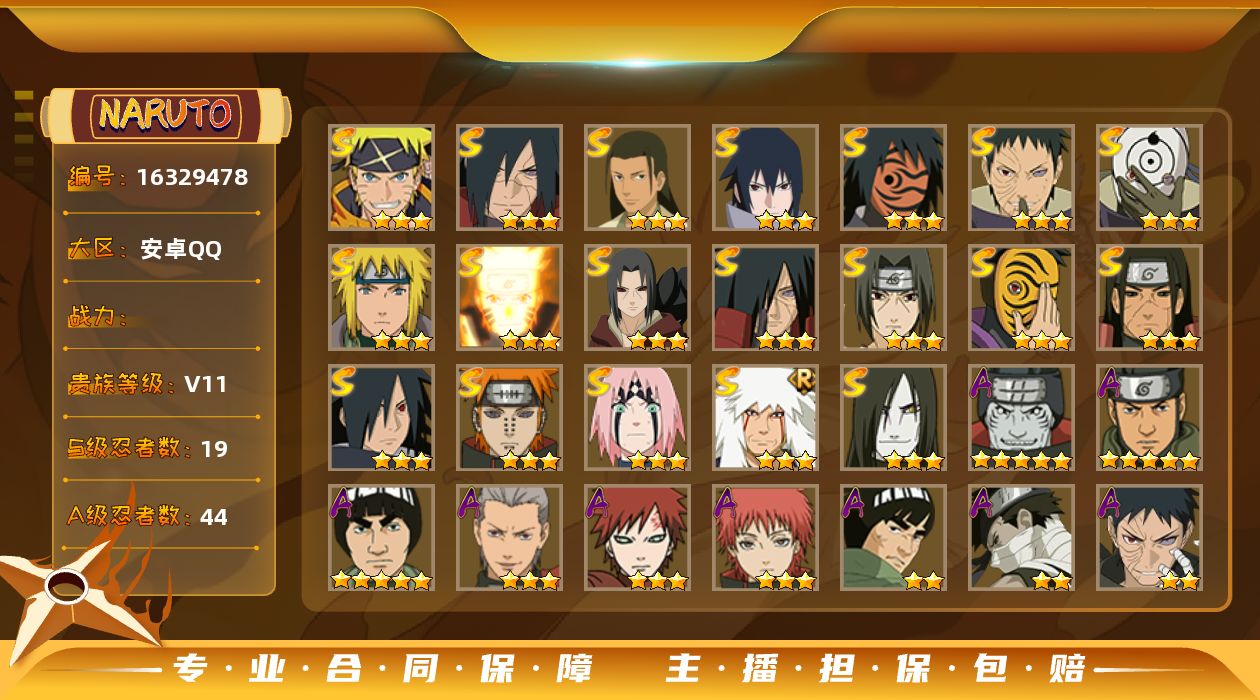 2429061-s忍者数:14a忍者数:33 d【送安卓q王者 营地id 】v11 14s 34a 具体看图便宜出!!! 【s级忍者】宇智波带土「忍界大战」3星,大筒木舍人「最终章」3星,宇智波佐助「永恒万花筒」3星,千手柱间「秽土转生」3星,药师兜「仙人模式」3星,宇智波斑「秽土转生」3星,自来也「舞之豪杰」3星,宇智波鼬「秽土转生」3星,宇智