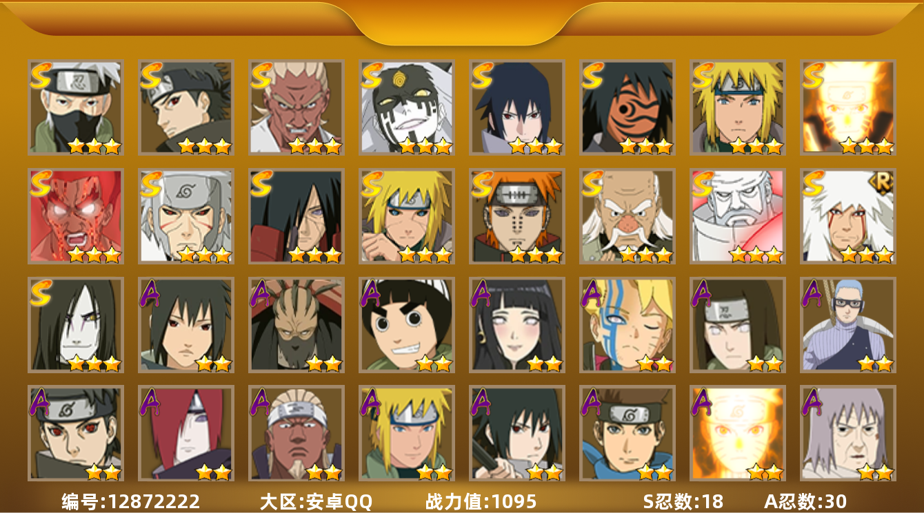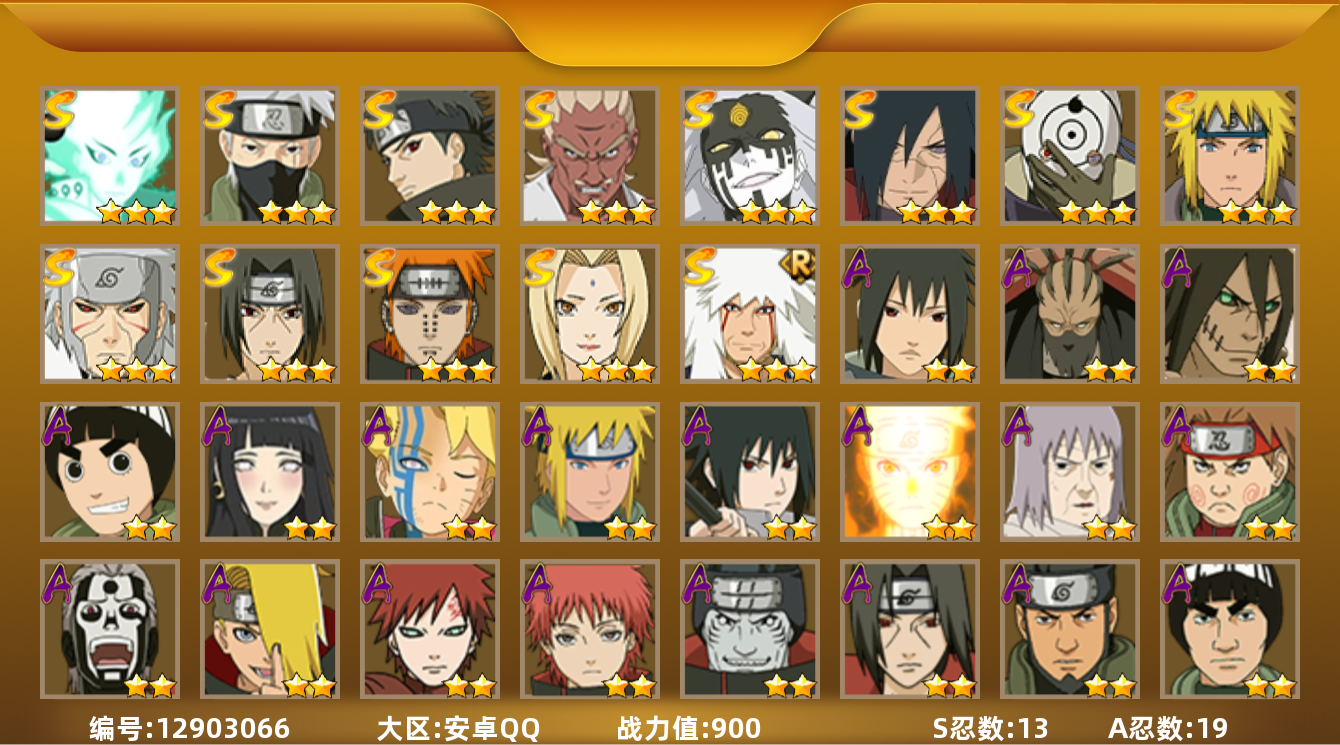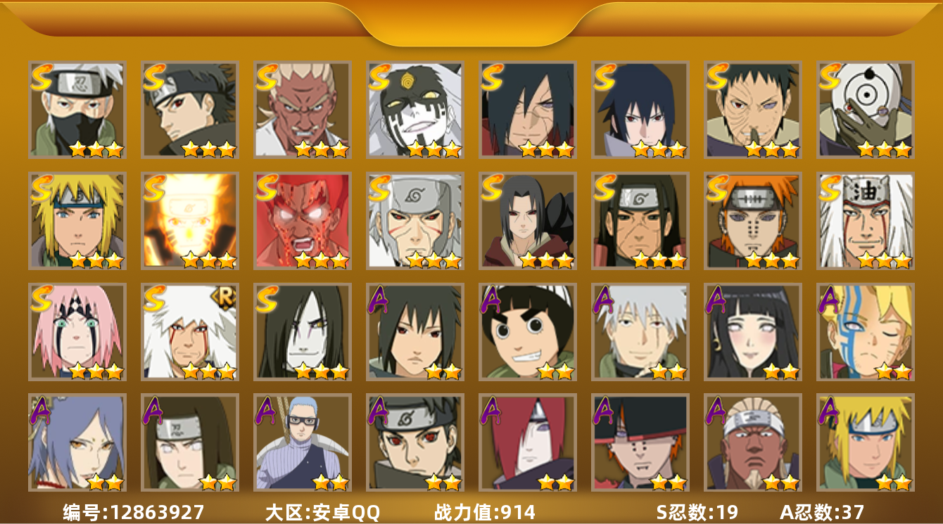 【编号32515可秒换绑】【店长推荐精品号!】【商品标题】:13s级忍者数-25a级忍者数 【s级忍者】:春野樱「忍界大战」3星,宇智波带土「忍界大战」3星,宇智波鼬「须佐能乎」3星,宇智波止水「须佐能乎」3星,旗木卡卡西「须佐能乎」3星,自来也「舞之豪杰」3星,大蛇丸3星,波风水门3星,神秘面具男「红夜之刃」3星,漩涡鸣人「九喇嘛连结」3星,佩恩「天道」3星,宇智波佐助「永恒万花筒」3星,大筒木金式3星 【a级忍者】:艾「青年」2星,长门「青年」2星,波风水门「青年」2星,迪达拉2星,迪达拉「秽土转生」2星,奇拉比2星,飞段3星,飞段「死司凭血」2星,干柿鬼鲛5星,迈特凯5星,我爱罗「疾风传」3星,蝎3星,蝎「绯流琥」2星,小南「漂泊浪客」2星,角都「晓创生」2星,角都「秽土转生」2星,猿飞阿斯玛5星,宇智波止水2星,宇智波鼬2星,宇智波佐助「须佐能乎」2星,日向宁次「忍界大战」2星,李洛克「忍界大战」2星,秋道丁次「忍界大战」2星,千代「近松十人卫」2星,宇智波泉奈2星