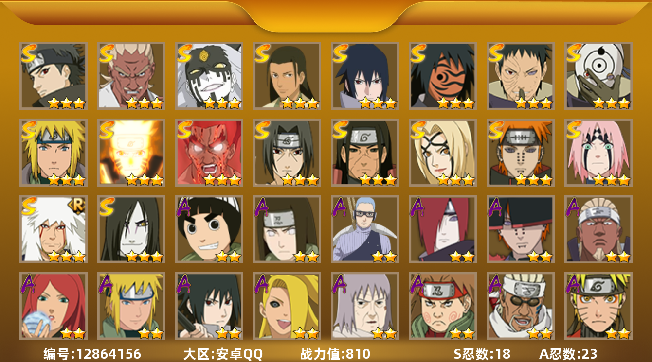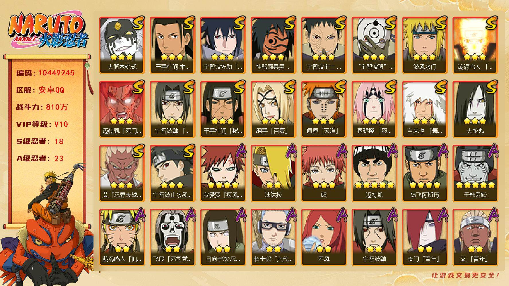 【编号57299 可秒换绑】店长推荐特价处理精品号【商品标题】:18s级忍者数-23a级忍者数 【s级忍者】:千手柱间「秽土转生」3星,春野樱「忍界大战」3星,宇智波带土「忍界大战」3星,艾「忍界大战」3星,宇智波鼬「须佐能乎」3星,宇智波止水「须佐能乎」3星,千手柱间「木叶创立」3星,自来也「舞之豪杰」3星,大蛇丸3星,纲手「百豪」3星,波风水门3星,神秘面具男「红夜之刃」3星,漩涡鸣人「九喇嘛连结」3星,迈特凯「死门」3星,佩恩「天道」3星,宇智波佐助「永恒万花筒」3星,宇智波斑 「白面具」3星宇智波斑「白面具」,大筒木桃式3星 【a级忍者】:艾「青年」2星,长门「青年」2星,波风水门「青年」2星,迪达拉2星,迪达拉「秽土转生」2星,奇拉比2星,飞段「死司凭血」2星,干柿鬼鲛5星,漩涡鸣人「仙人模式」2星,迈特凯5星,我爱罗「疾风传」4星,蝎3星,猿飞阿斯玛4星,宇智波鼬2星,宇智波佐助「须佐能乎」2星,日向宁次「忍界大战」2星,长十郎「六代目水影」2星,佩恩·六道「漂泊浪客」2星,李洛克「忍界大战」2星,黑土「博人传」2星,秋道丁次「忍界大战」2星,千代「近松十人卫」2星,不风2星