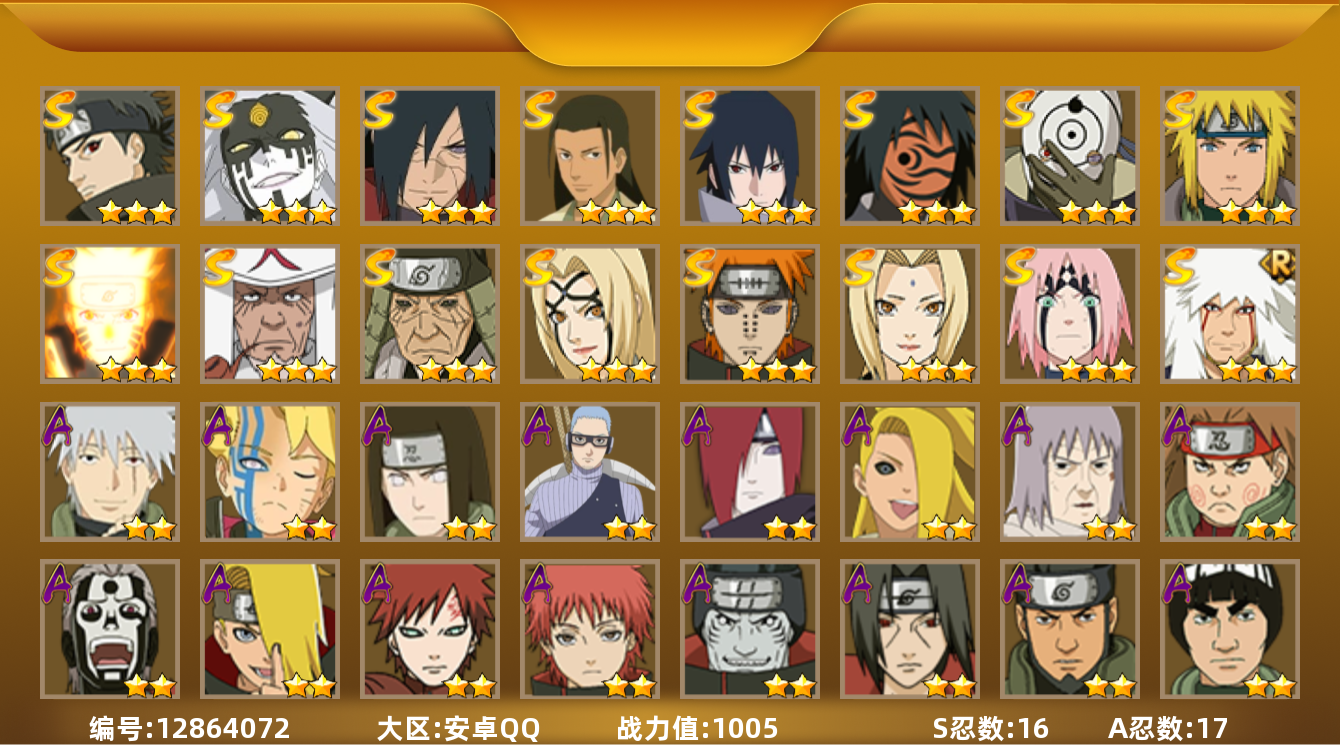 [12864072]【编号65096 可秒换绑】店长推荐特价处理精品号16s级忍者数-17a级忍者数 【s级忍者】:猿飞日斩「秽土转生」3星,宇智波斑「秽土转生·解」3星,春野樱「忍界大战」3星,宇智波止水「须佐能乎」3星,千手柱间「木叶创立」3星,自来也「舞之豪杰」3星,纲手3星,纲手「百豪」3星,猿飞日斩3星,波风水门3星,神秘面具男「红夜之刃」3星,漩涡鸣人「九喇嘛连结」3星,佩恩「天道」3星,宇智波佐助「永恒万花筒」3星,宇智波斑 「白面具」3星宇智波斑「白面具」,大筒木桃式3星 【a级忍者】:长门「青年」2星,迪达拉2星,迪达拉「秽土转生」2星,飞段「死司凭血」2星,干柿鬼鲛5星,漩涡博人「桃式显现」2星,迈特凯5星,旗木卡卡西「幻之真容」2星,我爱罗「疾风传」3星,蝎4星,猿飞阿斯玛5星,宇智波鼬2星,日向宁次「忍界大战」2星,长十郎「六代目水影」2星,卑留呼「火之意志继承者」2星,秋道丁次「忍界大战」2星,千代「近松十人卫」2星