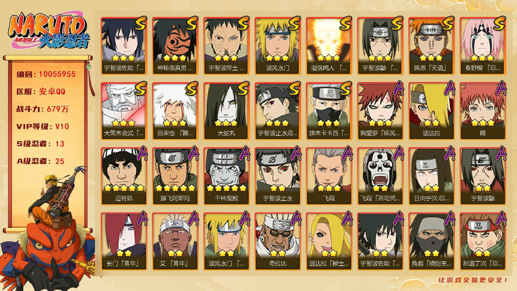 【编号25970可秒换绑】【店长推荐精品号!】【商品标题】:13s级忍者数-19a级忍者数 【s级忍者】:千手扉间「秽土转生」3星,宇智波斑「秽土转生·解」3星,艾「忍界大战」3星,宇智波鼬「须佐能乎」3星,宇智波止水「须佐能乎」3星,旗木卡卡西「须佐能乎」3星,自来也「舞之豪杰」3星,纲手3星,波风水门3星,佩恩「天道」3星,宇智波斑 「白面具」3星宇智波斑「白面具」,大筒木桃式3星,大筒木舍人「最终章」3星 【a级忍者】:波风水门「青年」2星,迪达拉2星,飞段「死司凭血」2星,干柿鬼鲛5星,漩涡博人「桃式显现」2星,漩涡鸣人「九尾查克拉」2星,迈特凯5星,我爱罗「疾风传」2星,蝎3星,蝎「绯流琥」2星,角都「秽土转生」2星,猿飞阿斯玛5星,宇智波鼬2星,宇智波佐助「须佐能乎」2星,日向雏田「最终章」2星,李洛克「忍界大战」2星,秋道丁次「忍界大战」2星,千代「近松十人卫」2星,宇智波泉奈2星