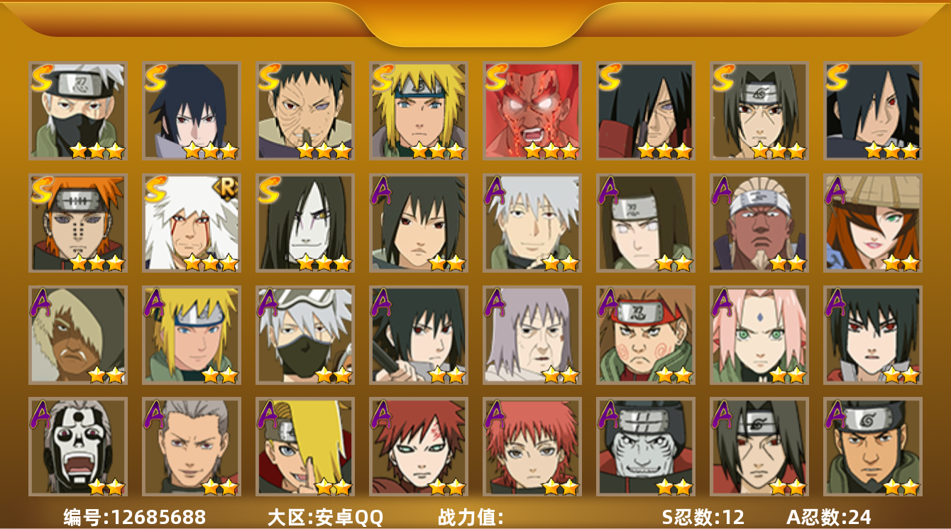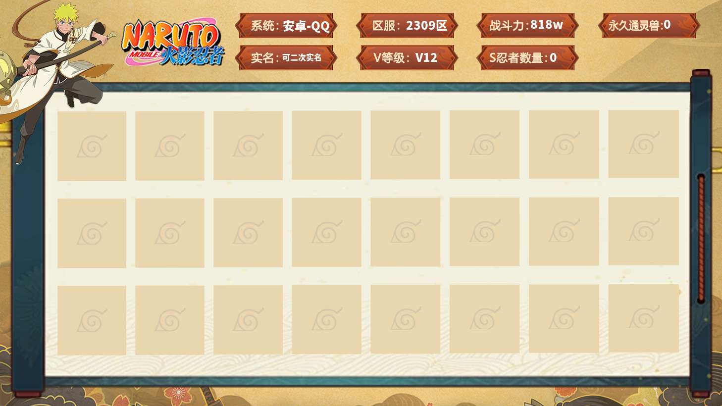 [12685688]0ahmtw 号 vip12,497w战力,s忍14个,a忍25个,本服排名1216,战区排名未上榜,通灵兽15个,6时装,暗部1阶,忍者星数299