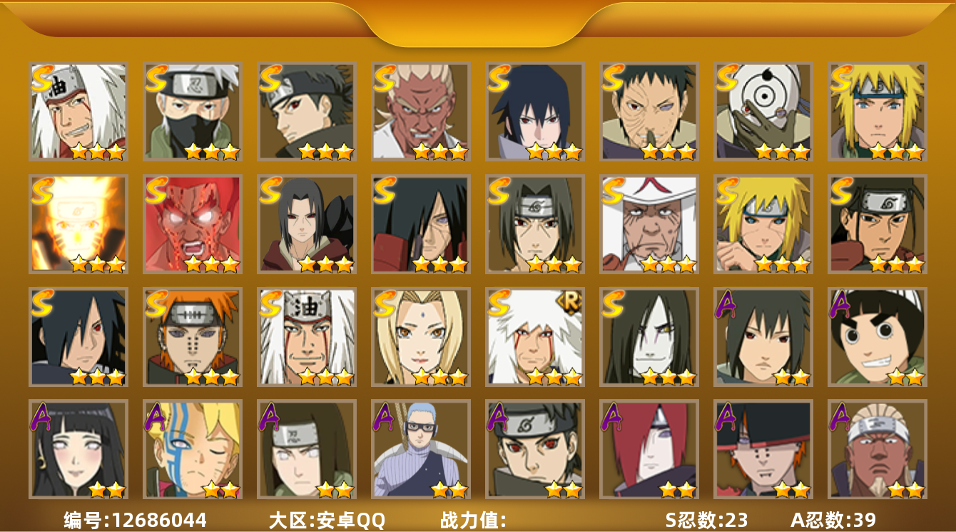 [12686044]0ai7f5 号 vip10,1343w战力,s忍23个,a忍38个,本服排名143,战区排名未上榜,通灵兽20个,7时装,暗部2阶,忍者星数575