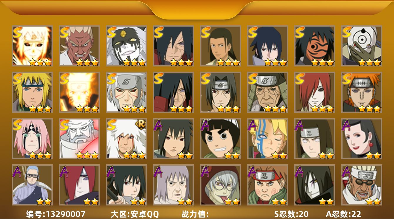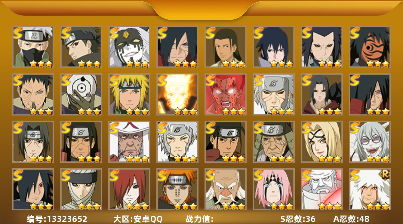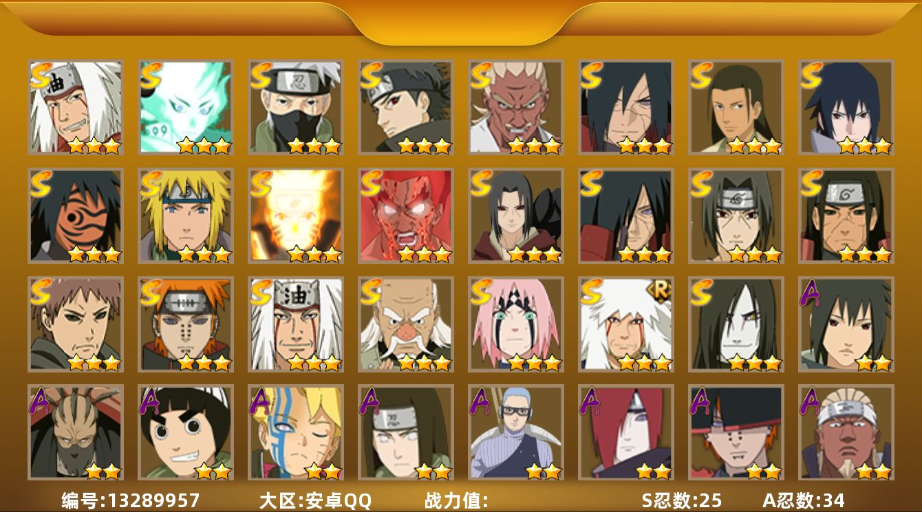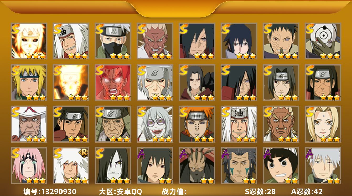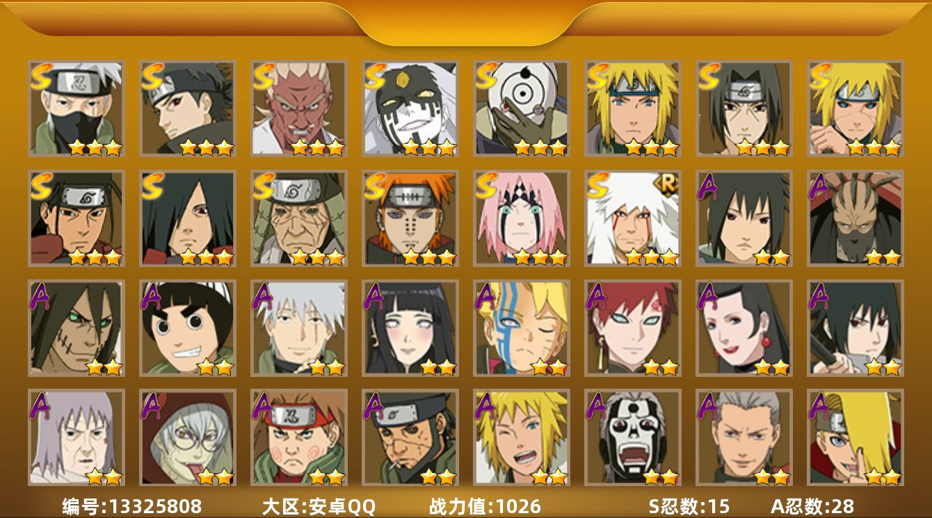 [13325808]v101026w战力,15s级忍者数-28a级忍者数,1w金币,32高招券,日斩72片,金水门70片,秽土解斑69片,三代目风影65片,最终章舍人80片,有熊猫等。me1793 【s级忍者】:猿飞日斩「秽土转生」3星,波风水门「秽土转生」3星,春野樱「忍界大战」3星,艾「忍界大战」3星,宇智波鼬「须佐能乎」3星,宇智波止水「须佐能乎」3星,旗木卡卡西「须佐能乎」3星,自来也「舞之豪杰」3星,自来也「传说中的三忍」3星,千手柱间3星,宇智波斑3星,波风水门3星,佩恩「天道」3星,宇智波斑 「白面具」3星宇智波斑「白面具」,大筒木桃式3星 【a级忍者】:波风水门「新春限定」2星,达鲁伊「博人传」2星,迪达拉2星,飞段2星,飞段「死司凭血」2星,干柿鬼鲛5星,漩涡博人「桃式显现」2星,迈特凯5星,旗木卡卡西「幻之真容」2星,桃地再不斩「秽土转生」2星,我爱罗「疾风传」2星,我爱罗「新春限定」2星,蝎3星,蝎「绯流琥」2星,角都「秽土转生」2星,猿飞阿斯玛5星,猿飞阿斯玛「秽土转生」2星,宇智波鼬2星,宇智波佐助「须佐能乎」2星,药师兜「半蛇斗篷」2星,日向雏田「最终章」2星,李洛克「忍界大战」2星,秋道丁次「忍界大战」2星,千代「近松十人卫」2星,神农「羁绊」2星,不缘2星,宇智波泉奈2星,大野木「侠隐江湖」2星