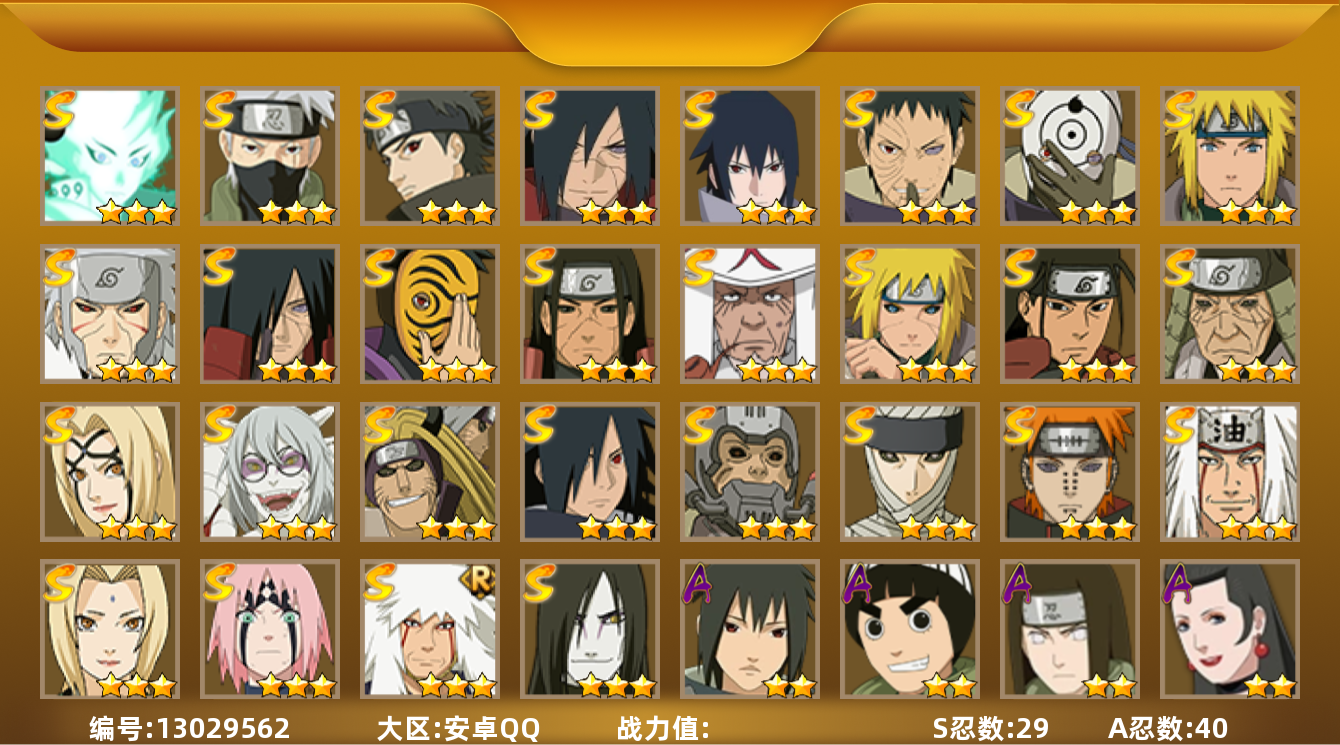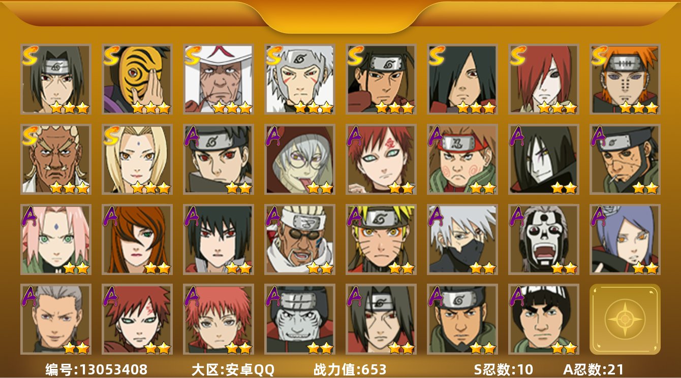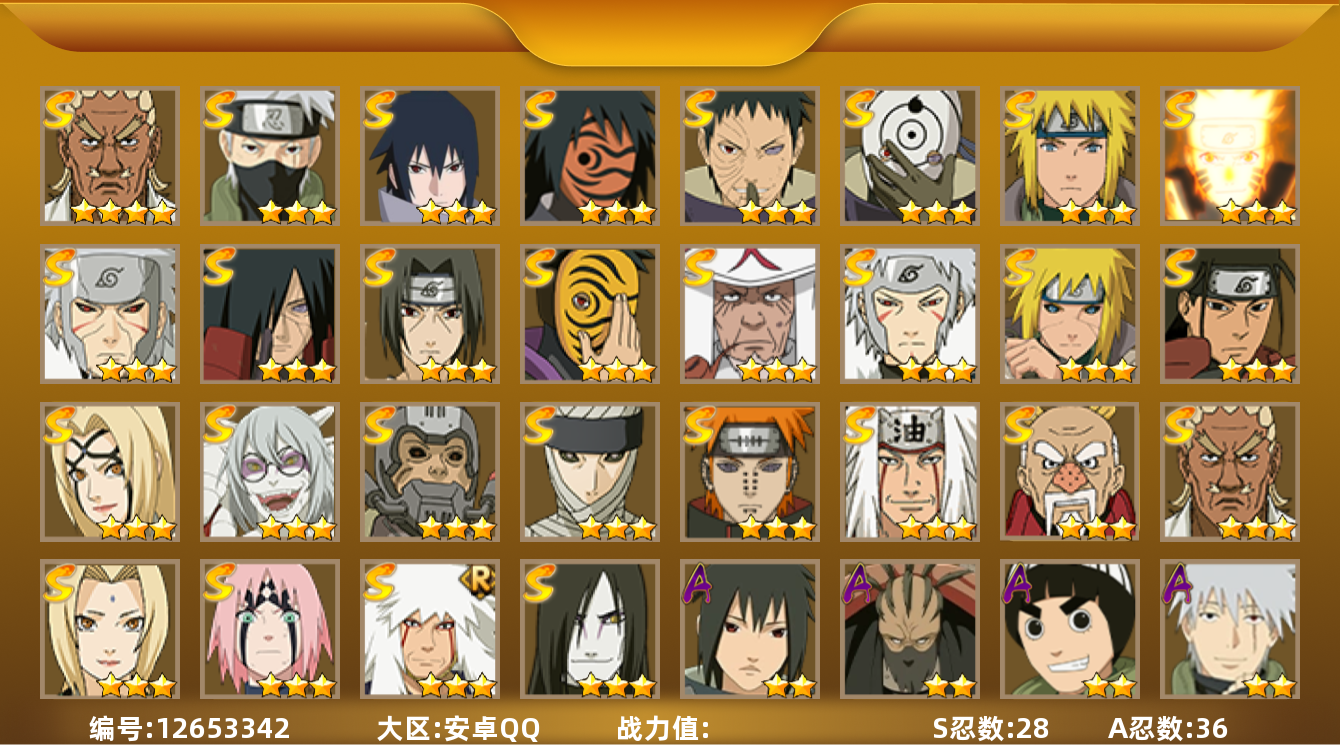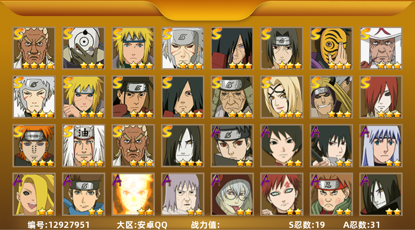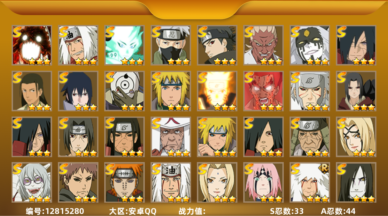 [13053408]实名: 可修改 s忍数: 10 a忍数: 21 战力值万: 6537645 贵族等级: v9 s级忍者: 长门「秽土转生」宇智波斑千手柱间艾「四代目雷影」千手扉间神秘面具男佩恩「天道」纲手宇智波鼬 「须佐能乎」猿飞日斩 通灵兽: 忍犬忍龟蛤蟆吉蓝蛇猿魔蛞蝓蛤蟆仙人镰鼬山椒鱼蜃鲛鲨蛤蟆健乌鸦蛤蟆龙蛤蟆广