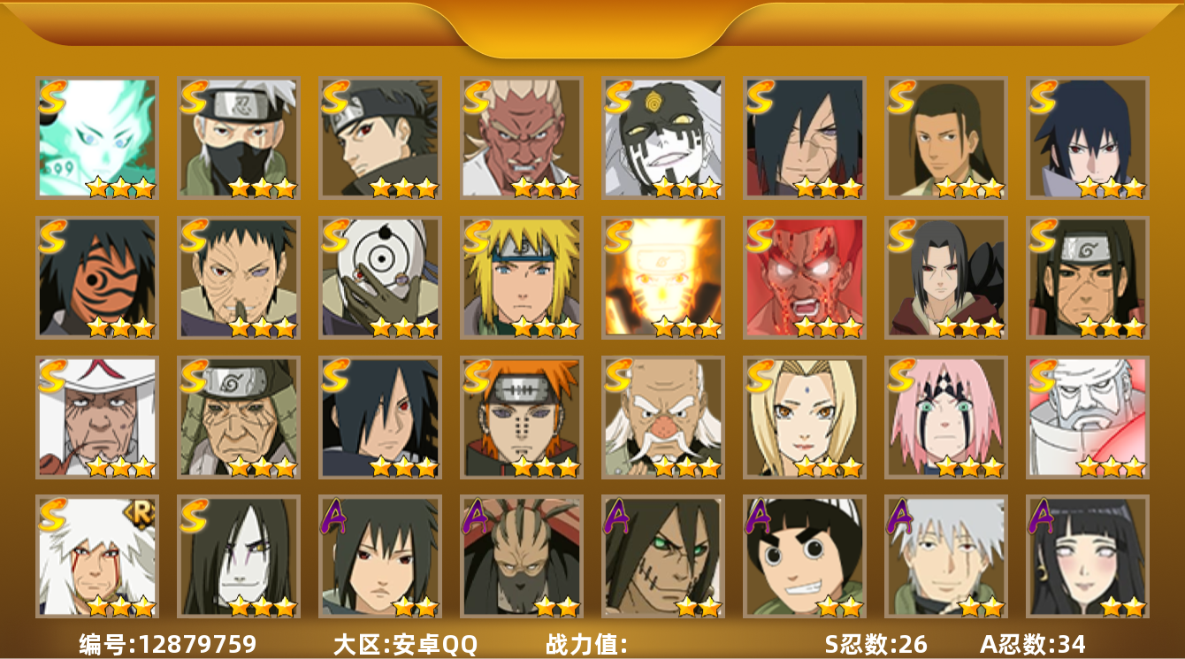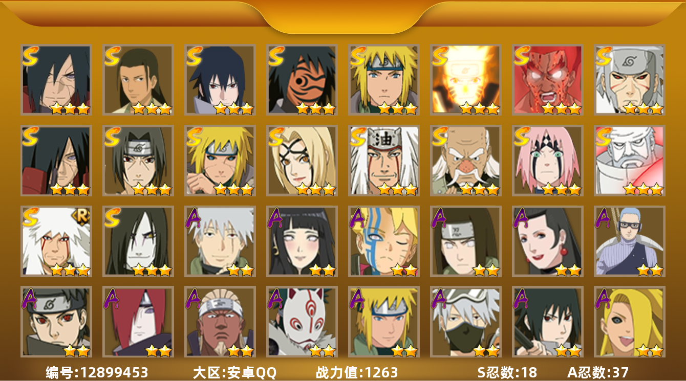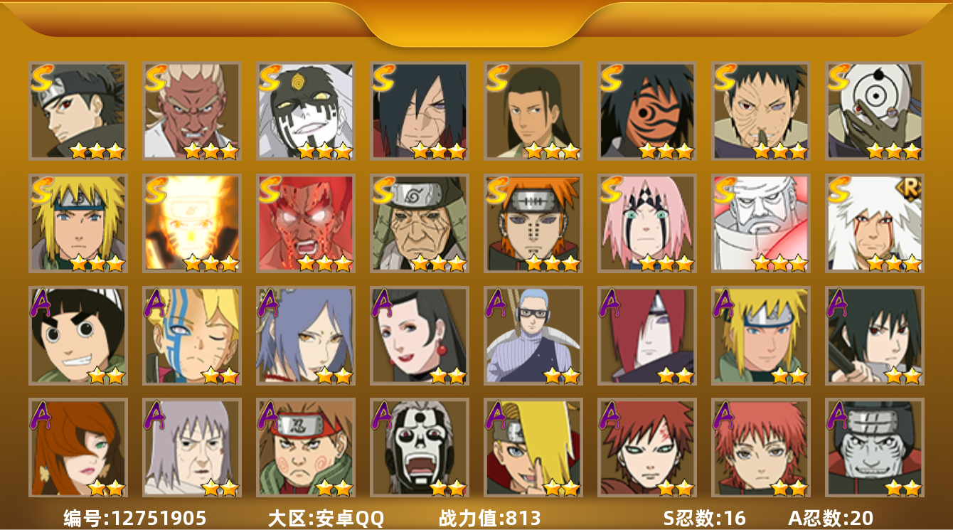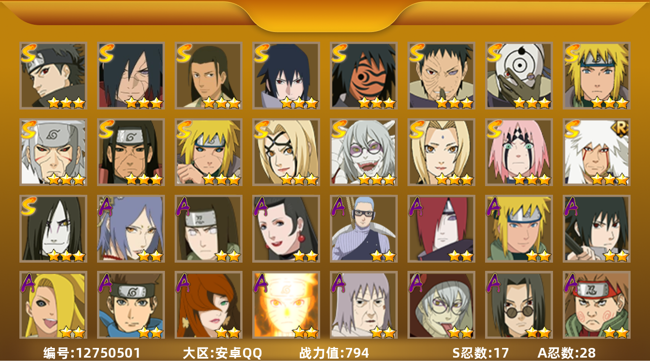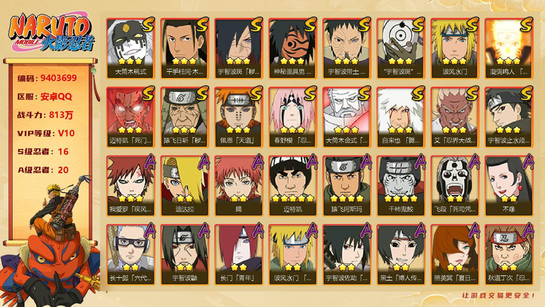 [12751905]【编号52091可秒换绑】【店长推荐精品号】16s级忍者数-20a级忍者数 【s级忍者】:猿飞日斩「秽土转生」3星,宇智波斑「秽土转生·解」3星,春野樱「忍界大战」3星,宇智波带土「忍界大战」3星,艾「忍界大战」3星,宇智波止水「须佐能乎」3星,千手柱间「木叶创立」3星,自来也「舞之豪杰」3星,波风水门3星,神秘面具男「红夜之刃」3星,漩涡鸣人「九喇嘛连结」3星,迈特凯「死门」3星,佩恩「天道」3星,宇智波斑 「白面具」3星宇智波斑「白面具」,大筒木金式3星,大筒木桃式3星 【a级忍者】:长门「青年」2星,波风水门「青年」2星,迪达拉2星,飞段「死司凭血」2星,干柿鬼鲛4星,漩涡博人「桃式显现」2星,迈特凯5星,我爱罗「疾风传」3星,蝎2星,小南「漂泊浪客」2星,猿飞阿斯玛4星,宇智波鼬2星,宇智波佐助「须佐能乎」2星,照美冥「夏日泳装」2星,长十郎「六代目水影」2星,李洛克「忍界大战」2星,黑土「博人传」2星,秋道丁次「忍界大战」2星,千代「近松十人卫」2星,不缘2星