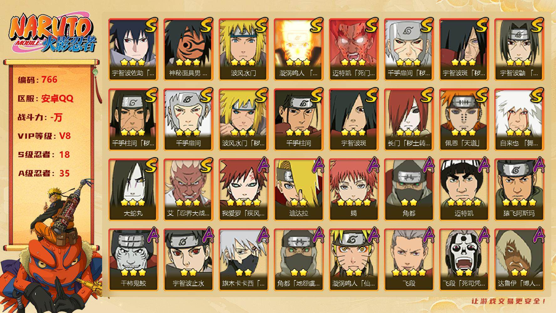 [12899453]【编号35384可秒换绑】【店长推荐精品号!】18s级忍者数-37a级忍者数 【s级忍者】:波风水门「秽土转生」3星,千手扉间「秽土转生」3星,宇智波斑「秽土转生」3星,宇智波斑「秽土转生·解」3星,大野木「忍界大战」3星,春野樱「忍界大战」3星,宇智波鼬「须佐能乎」3星,千手柱间「木叶创立」3星,自来也3星,自来也「舞之豪杰」3星,大蛇丸3星,纲手「百豪」3星,波风水门3星,神秘面具男「红夜之刃」3星,漩涡鸣人「九喇嘛连结」3星,迈特凯「死门」3星,宇智波佐助「永恒万花筒」3星,大筒木金式3星 【a级忍者】:艾「青年」2星,长门「青年」2星,波风水门「青年」2星,达鲁伊「博人传」2星,迪达拉2星,迪达拉「秽土转生」2星,飞段3星,飞段「死司凭血」2星,干柿鬼鲛5星,漩涡博人「桃式显现」2星,漩涡鸣人「仙人模式」2星,漩涡鸣人「九尾查克拉」2星,迈特凯5星,旗木卡卡西「元气夏日」2星,旗木卡卡西「万花筒写轮眼」2星,旗木卡卡西「幻之真容」2星,我爱罗「疾风传」4星,我爱罗「忍界大战」2星,蝎4星,猿飞阿斯玛5星,宇智波止水2星,宇智波鼬2星,宇智波鼬「新春限定」2星,宇智波佐助「须佐能乎」2星,药师兜「半蛇斗篷」2星,照美冥「五代目水影」2星,日向宁次「忍界大战」2星,日向雏田「最终章」2星,长十郎「六代目水影」2星,卑留呼「火之意志继承者」2星,神秘面具男「忍者之路」2星,猿飞木叶丸「博人传」2星,黑土「博人传」2星,春野樱「百豪」2星,秋道丁次「忍界大战」2星,千代「近松十人卫」2星,不缘2星