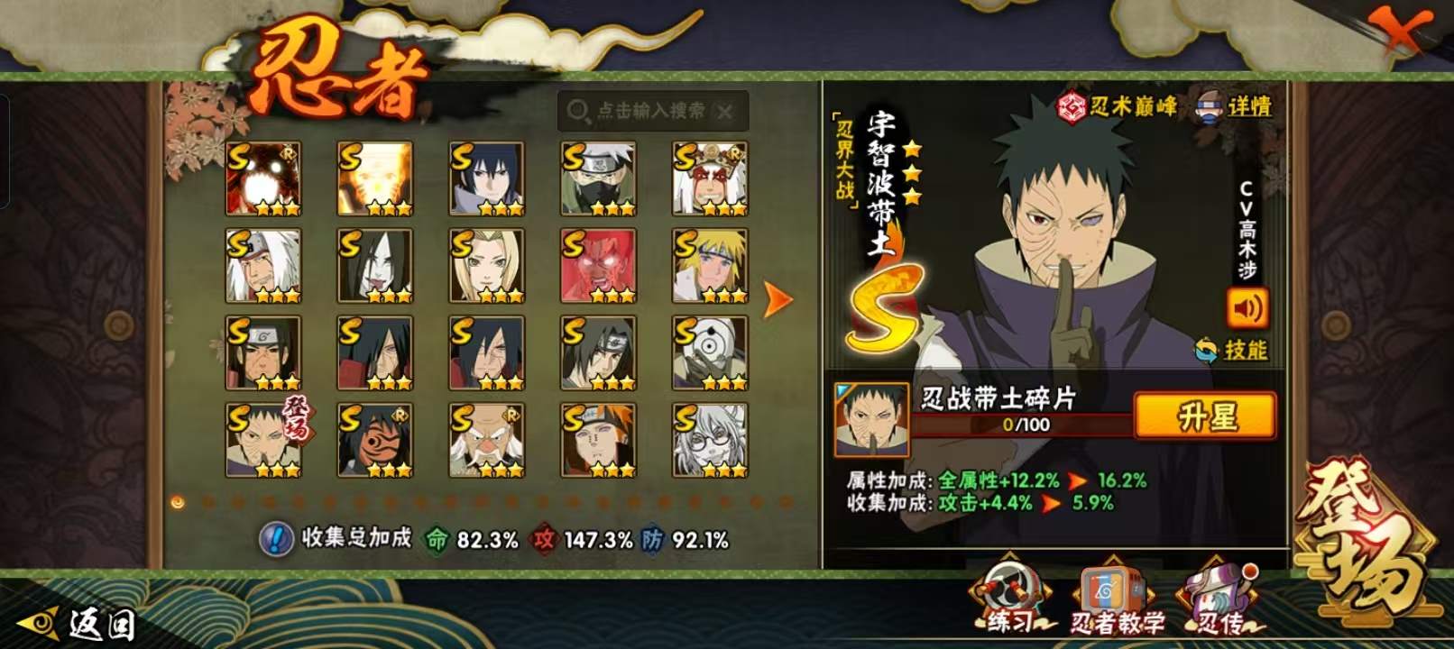 24s级忍者数-47a级忍者数 【s级忍者】:半藏「秽土转生」3星,猿飞日斩「秽土转生」3星,千手柱间「秽土转生」3星,宇智波斑「秽土转生」3星,宇智波斑「秽土转生·解」3星,春野樱「忍界大战」3星,宇智波带土「忍界大战」3星,艾「忍界大战」3星,宇智波鼬「须佐能乎」4星,旗木卡卡西「须佐能乎」3星,宇智波斑「木叶创立」3星,艾「三代目雷影」3星,自来也3星,自来也「舞之豪杰」3星,大蛇丸3星,纲手3星,猿飞日斩4星,波风水门3星,药师兜「仙人模式」3星,漩涡鸣人「九喇嘛连结」3星,迈特凯「死门」3星,佩恩「天道」3星,宇智波佐助「永恒万花筒」3星,漩涡鸣人「暴怒·第六尾」3星 【a级忍者】:艾「青年」2星,长门「青年」2星,波风水门「青年」3星,达鲁伊「博人传」2星,迪达拉2星,迪达拉「秽土转生」2星,大蛇丸「晓」2星,奇拉比2星,奇拉比「忍界大战」2星,飞段4星,飞段「死司凭血」4星,干柿鬼鲛5星,漩涡博人「桃式显现」2星,漩涡鸣人「仙人模式」2星,漩涡鸣人「九尾查克拉」2星,迈特凯5星,旗木卡卡西「元气夏日」2星,旗木卡卡西「幻之真容」2星,桃地再不斩「漂泊武士」2星,桃地再不斩「秽土转生」2星,我爱罗「疾风传」4星,蝎5星,蝎「绯流琥」2星,小南2星,小南「夏日泳装」2星,角都「地怨虞」2星,角都「晓创生」2星,猿飞阿斯玛5星,猿飞阿斯玛「秽土转生」2星,宇智波鼬2星,宇智波佐助「须佐能乎」2星,宇智波佐助「万花筒写轮眼」2星,宇智波佐助「侠隐江湖」2星,药师兜「半蛇斗篷」2星,照美冥「五代目水影」2星,日向宁次「忍界大战」2星,黑绝2星,长十郎「六代目水影」2星,李洛克「忍界大战」2星,黑土「博人传」2星,千手扉间「漂泊武士」2星,勘九郎「忍界大战」2星,秋道丁次「忍界大战」2星,千代「近松十人卫」2星,神农「羁绊」2星,不风2星,宇智波泉奈2星 【通灵兽】:忍犬,蓝蛇,蛤蟆吉,忍龟,镰鼬,蜃,山椒鱼,猿魔,蛤蟆仙人,鲛鲨,蛤蟆健,乌鸦,蛤蟆龙,蛤蟆广,梦貘,鵺,蛞蝓,螃蟹,砂之守鹤,蜘蛛