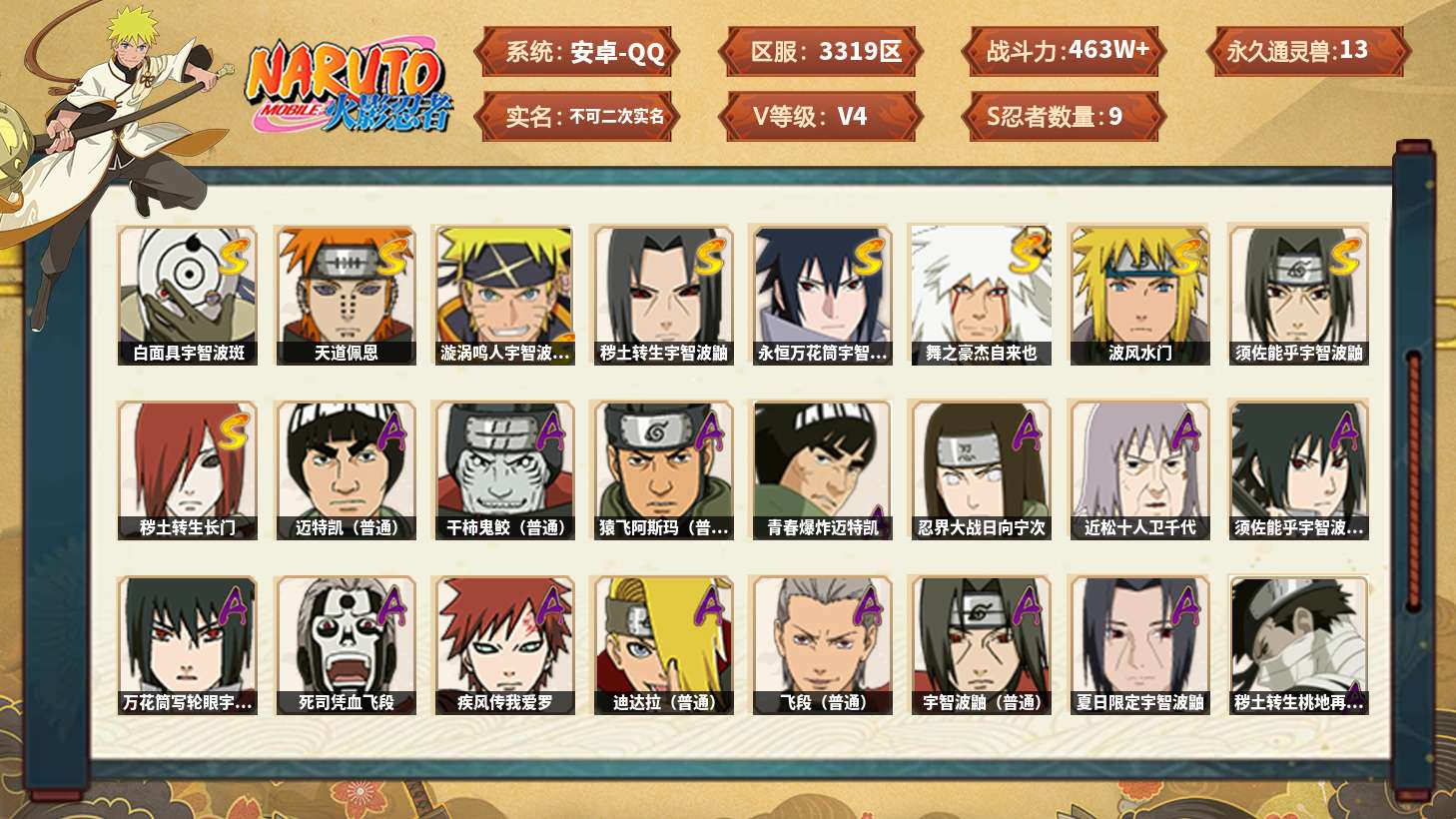 【火影忍者】【lyhy11393】战斗力:463w;段位:上忍2阶;本服排名:1949;vip:v4级;s忍:9个;a忍:18个;通灵兽:13个,s忍:白面具宇智波斑|天道佩恩|漩涡鸣人宇智波佐助|秽土转生宇智波鼬|永恒万花筒宇智波佐助|舞之豪杰自来也|波风水门|须佐能乎宇智波鼬|秽土转生长门__a忍:青春爆炸迈特凯|忍界大战日向宁次|近松十人卫千代|须佐能乎宇智波佐助|万花筒写轮眼宇智波佐助|死司凭血飞段|疾风传我爱罗|迪达拉(普通)|飞段(普通)|迈特凯(普通) 4星|宇智波鼬(普通)|夏日限定宇智波鼬|干柿鬼鲛(普通) 4星|秽土转生桃地再不斩|蝎(普通)|猿飞阿斯玛(普通) 4星|六代目水影长十郎|宇智波泉奈__通灵兽:忍犬(普通)|蓝蛇|蛤蟆吉|忍龟|砂之守鹤|镰鼬|猿魔|山椒鱼|蜃|蛤蟆仙人|鲛鲨|蛤蟆健|乌鸦(普通)