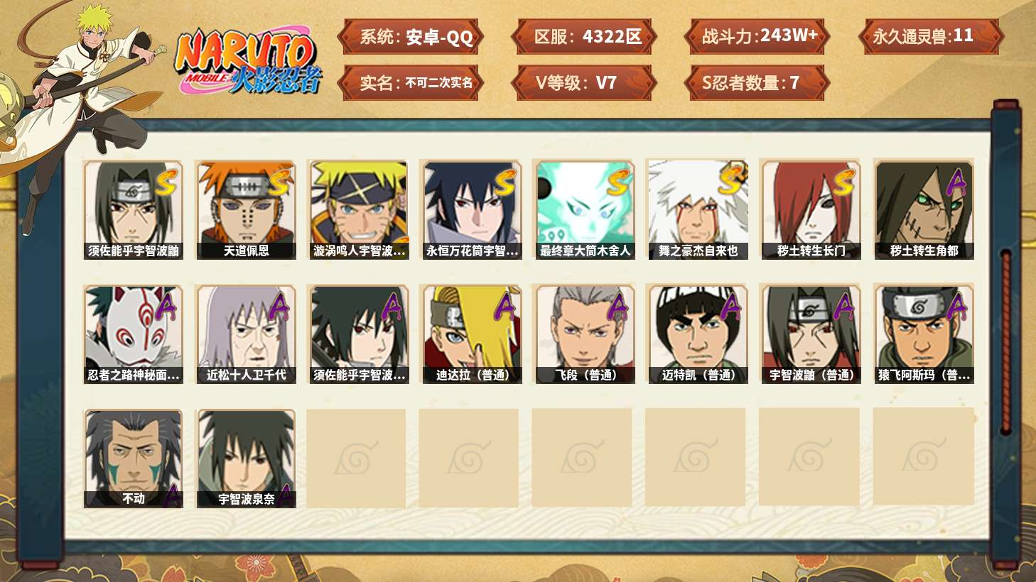 【火影忍者】【lyhy11391】战斗力:243w;段位:中忍2阶;本服排名:2106;vip:v7级;s忍:7个;a忍:11个;通灵兽:11个,s忍:天道佩恩|漩涡鸣人宇智波佐助|永恒万花筒宇智波佐助|最终章大筒木舍人|舞之豪杰自来也|须佐能乎宇智波鼬 4星|秽土转生长门__a忍:秽土转生角都|忍者之路神秘面具男|近松十人卫千代|须佐能乎宇智波佐助|迪达拉(普通)|飞段(普通)|迈特凯(普通)|宇智波鼬(普通)|猿飞阿斯玛(普通)|不动|宇智波泉奈__通灵兽:忍犬(普通)|蓝蛇|蛤蟆吉|忍龟|镰鼬|猿魔|砂之守鹤|山椒鱼|蜃|蛤蟆仙人|鲛鲨