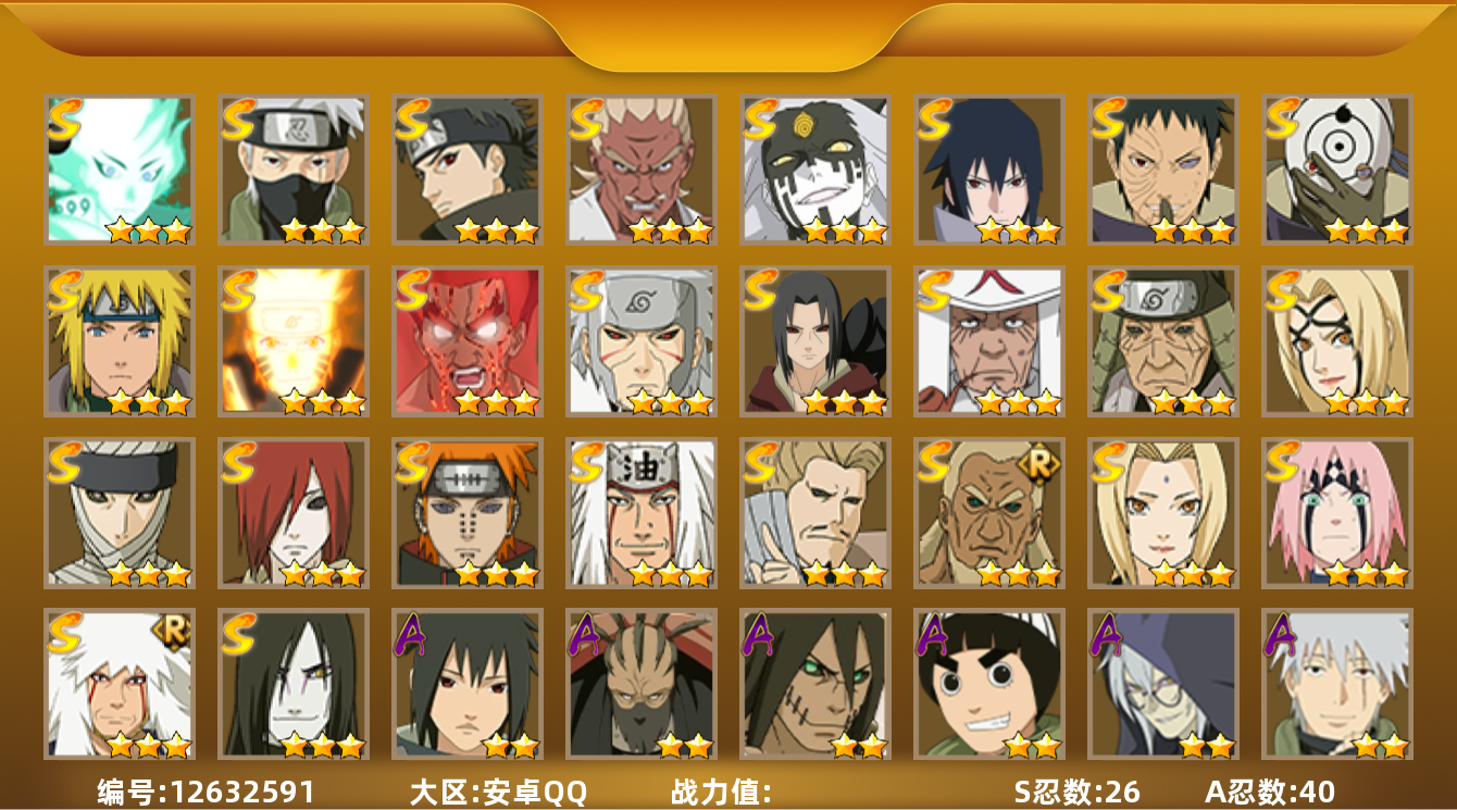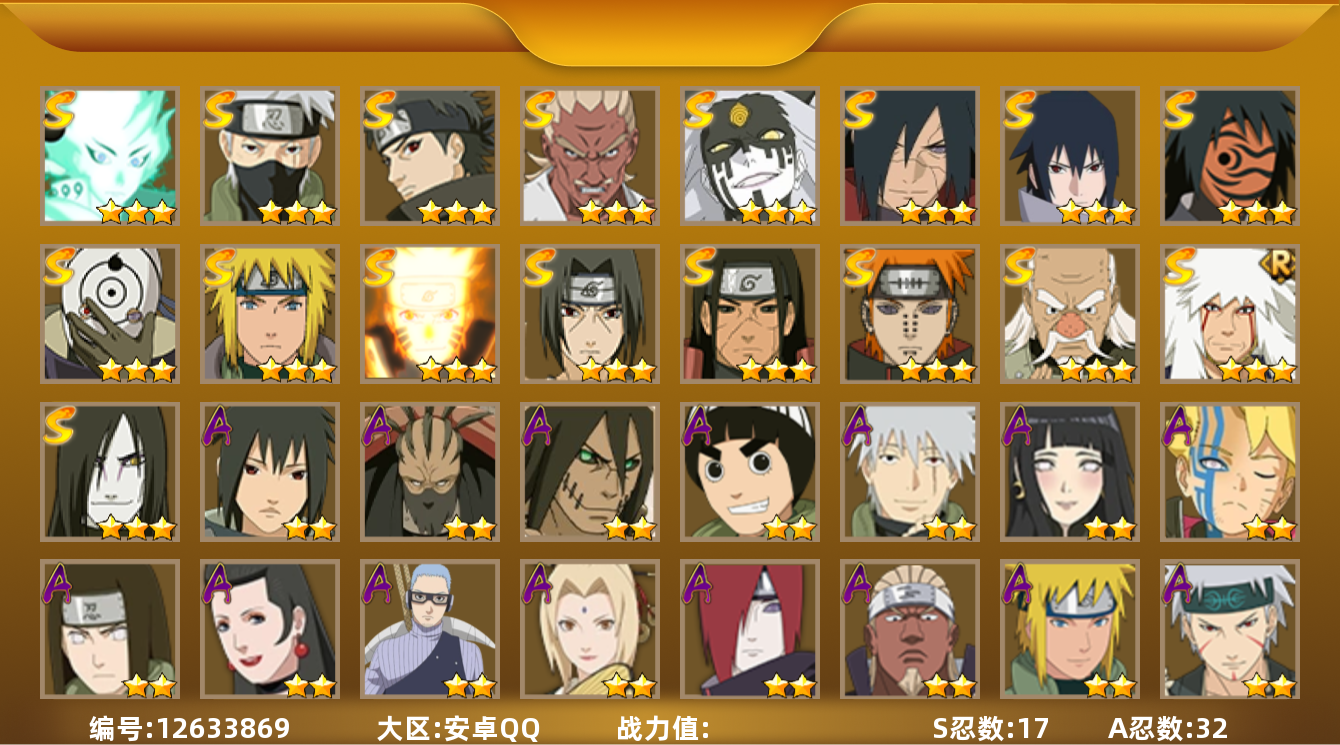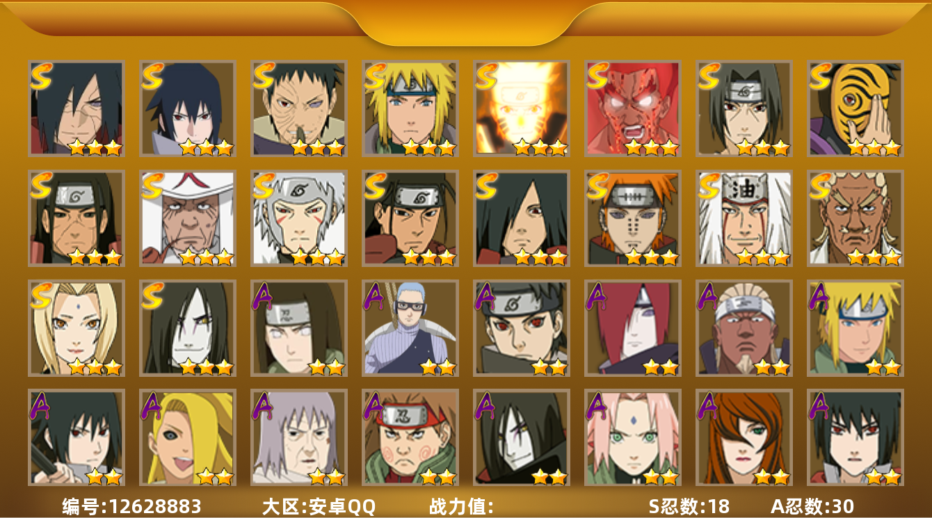 【商品标题】:18s级忍者数-24a级忍者数 【s级忍者】:猿飞日斩「秽土转生」3星,宇智波斑「秽土转生·解」3星,春野樱「忍界大战」3星,艾「忍界大战」3星,宇智波鼬「须佐能乎」3星,旗木卡卡西「须佐能乎」3星,艾「四代目雷影」3星,自来也「舞之豪杰」3星,大蛇丸3星,自来也「传说中的三忍」3星,纲手「百豪」3星,千手柱间3星,宇智波斑3星,波风水门3星,佩恩「天道」3星,宇智波佐助「永恒万花筒」3星,大筒木舍人「最终章」3星,漩涡鸣人「暴怒·第六尾」3星 【a级忍者】:迪达拉2星,奇拉比2星,奇拉比「忍界大战」2星,飞段2星,飞段「死司凭血」2星,干柿鬼鲛4星,漩涡博人「桃式显现」2星,迈特凯5星,桃地再不斩2星,我爱罗「疾风传」3星,蝎3星,蝎「绯流琥」3星,角都「秽土转生」2星,猿飞阿斯玛5星,宇智波鼬2星,宇智波佐助「须佐能乎」2星,日向宁次「忍界大战」2星,长十郎「六代目水影」2星,李洛克「忍界大战」2星,秋道丁次「忍界大战」2星,千代「近松十人卫」2星,神农「羁绊」2星,不缘2星,宇智波泉奈2星