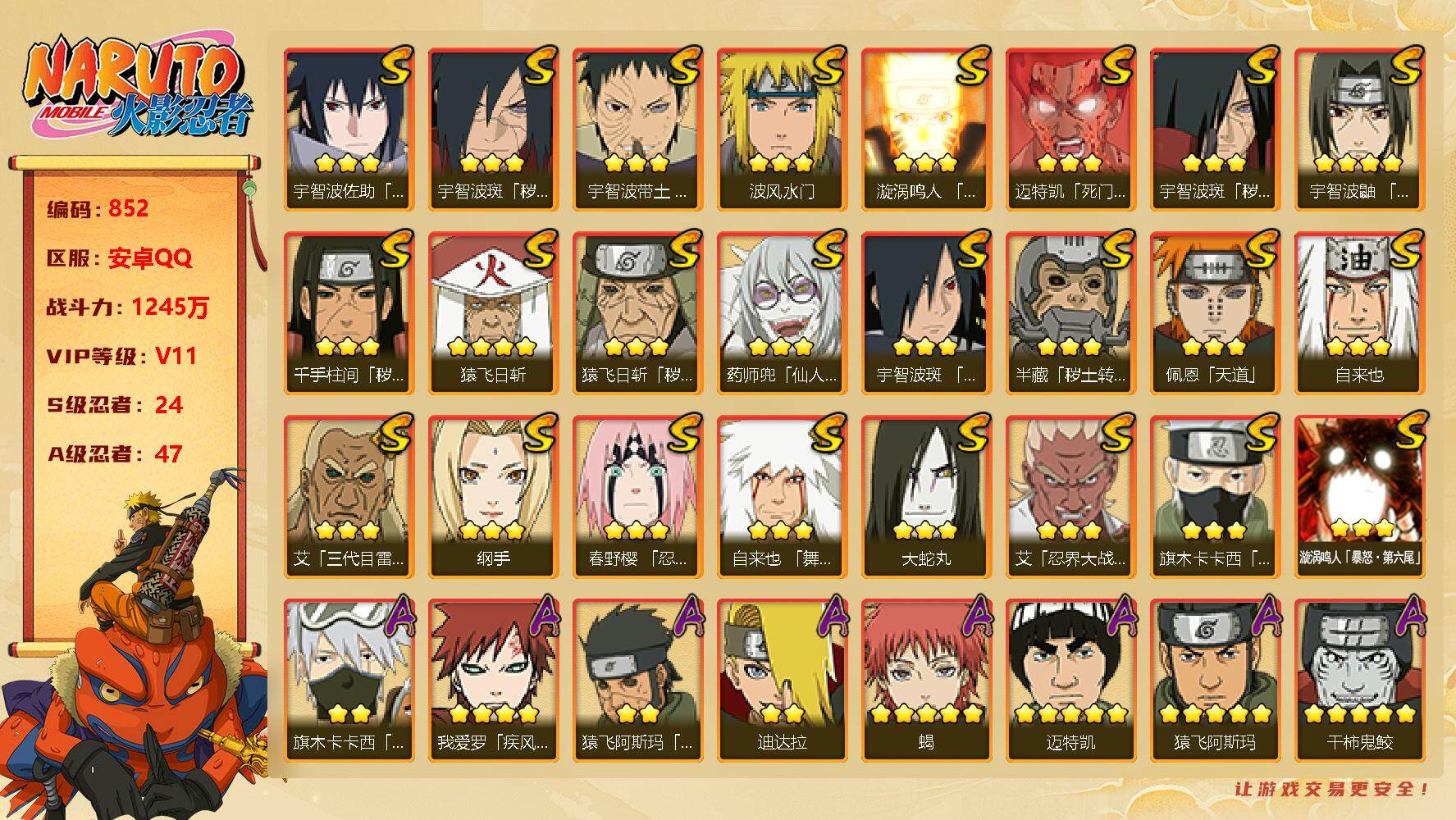 [12633869]【编号28095可秒换绑】店长推荐精品号17s级忍者数-32a级忍者数 【s级忍者】:千手柱间「秽土转生」3星,宇智波斑「秽土转生·解」3星,大野木「忍界大战」3星,艾「忍界大战」3星,宇智波鼬「须佐能乎」3星,宇智波止水「须佐能乎」3星,旗木卡卡西「须佐能乎」3星,自来也「舞之豪杰」3星,大蛇丸3星,波风水门3星,神秘面具男「红夜之刃」3星,漩涡鸣人「九喇嘛连结」3星,佩恩「天道」3星,宇智波佐助「永恒万花筒」3星,宇智波斑 「白面具」3星宇智波斑「白面具」,大筒木桃式3星,大筒木舍人「最终章」3星 【a级忍者】:艾「青年」2星,长门「青年」2星,波风水门「青年」2星,迪达拉2星,大蛇丸「晓」2星,飞段2星,飞段「死司凭血」2星,干柿鬼鲛2星,漩涡博人「桃式显现」2星,迈特凯3星,旗木卡卡西「幻之真容」2星,我爱罗「疾风传」3星,蝎2星,蝎「绯流琥」2星,角都「秽土转生」2星,猿飞阿斯玛2星,猿飞阿斯玛「秽土转生」2星,猿飞日斩「火影继承人」2星,宇智波鼬2星,宇智波佐助「须佐能乎」2星,宇智波佐助「万花筒写轮眼」2星,照美冥「五代目水影」2星,日向宁次「忍界大战」2星,日向雏田「最终章」2星,宇智波带土「漂泊浪客」2星,长十郎「六代目水影」2星,纲手「侠隐江湖」2星,李洛克「忍界大战」2星,千手扉间「漂泊武士」2星,秋道丁次「忍界大战」2星,不缘2星,宇智波泉奈2星