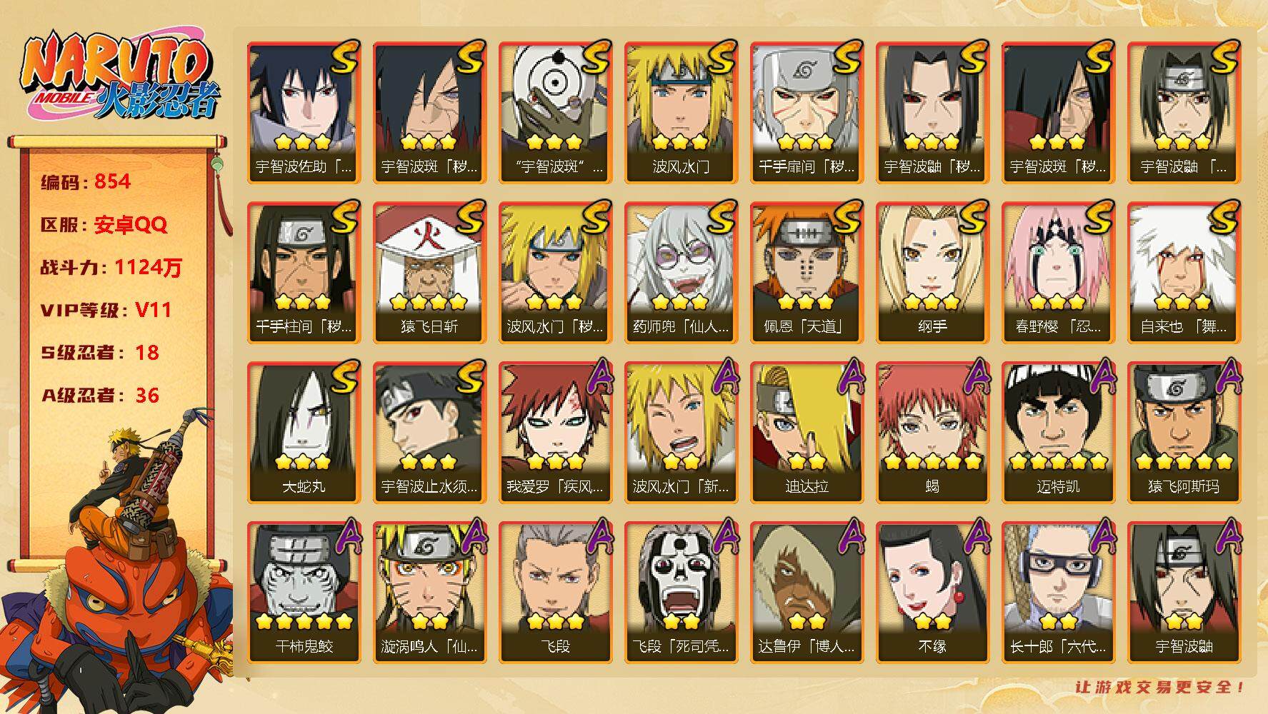[12628883]【编号74144可秒换绑】店长推荐精品号18s级忍者数-30a级忍者数 【s级忍者】:千手柱间「秽土转生」3星,宇智波斑「秽土转生·解」3星,宇智波带土「忍界大战」3星,宇智波鼬「须佐能乎」3星,艾「四代目雷影」3星,自来也3星,大蛇丸4星,纲手3星,千手柱间3星,千手扉间3星,猿飞日斩3星,宇智波斑3星,波风水门4星,神秘面具男3星,漩涡鸣人「九喇嘛连结」3星,迈特凯「死门」3星,佩恩「天道」3星,宇智波佐助「永恒万花筒」3星 【a级忍者】:艾「青年」2星,长门「青年」2星,波风水门「青年」2星,达鲁伊「博人传」2星,迪达拉2星,迪达拉「秽土转生」2星,大蛇丸「晓」2星,奇拉比3星,飞段4星,飞段「死司凭血」2星,干柿鬼鲛5星,漩涡鸣人「仙人模式」2星,迈特凯5星,旗木卡卡西「万花筒写轮眼」3星,我爱罗「疾风传」4星,蝎3星,小南2星,角都「地怨虞」2星,猿飞阿斯玛5星,宇智波止水2星,宇智波鼬2星,宇智波佐助「须佐能乎」2星,宇智波佐助「万花筒写轮眼」2星,照美冥「五代目水影」2星,日向宁次「忍界大战」2星,长十郎「六代目水影」2星,黑土「博人传」2星,春野樱「百豪」2星,秋道丁次「忍界大战」2星,千代「近松十人卫」2星