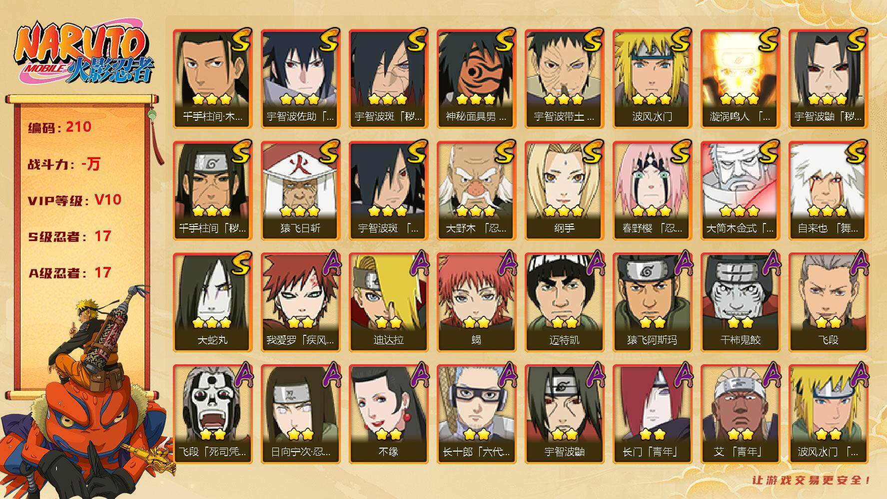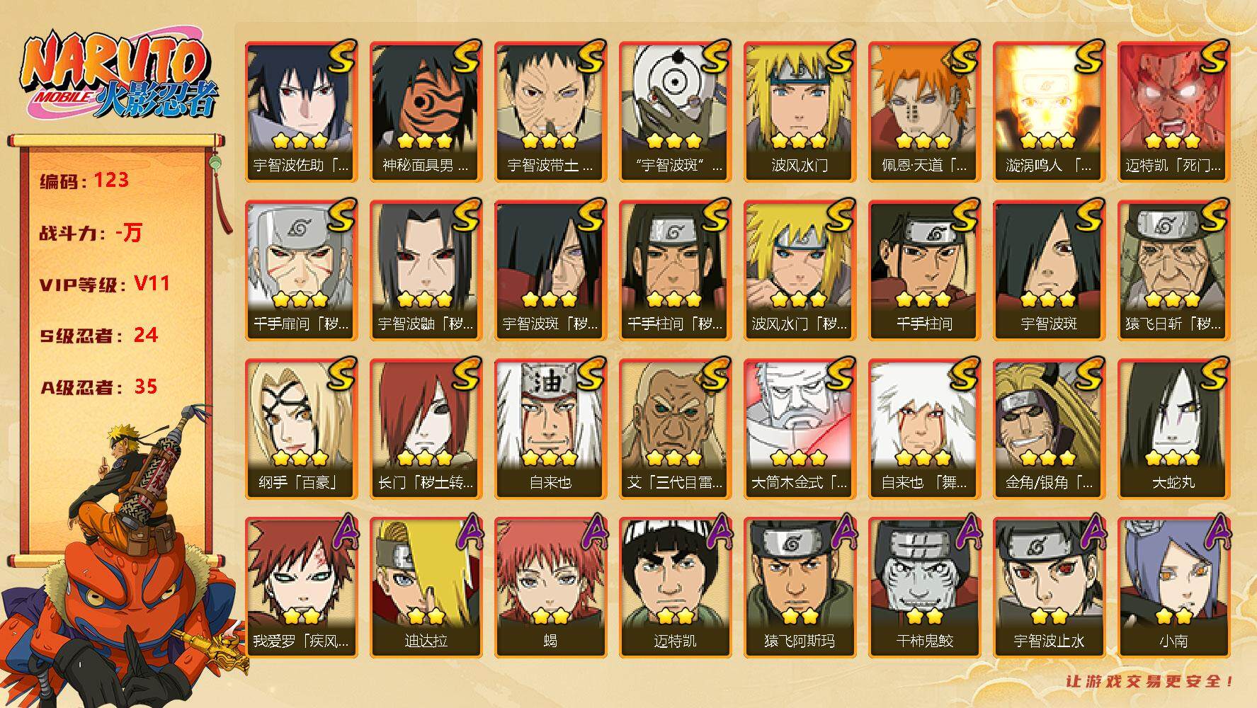 【商品标题】:8s级忍者数-25a级忍者数 【s级忍者】:猿飞日斩「秽土转生」3星猿飞日斩「秽土转生」,波风水门「秽土转生」3星波风水门「秽土转生」,千手扉间「秽土转生」3星千手扉间「秽土转生」,自来也「舞之豪杰」3星自来也「舞之豪杰」,大蛇丸3星大蛇丸,波风水门3星波风水门,迈特凯「死门」3星迈特凯「死门」,宇智波佐助「永恒万花筒」3星宇智波佐助「永恒万花筒」 【a级忍者】:艾「青年」2星艾「青年」,迪达拉2星迪达拉,大蛇丸「晓」2星大蛇丸「晓」,飞段2星飞段,飞段「死司凭血」2星飞段「死司凭血」,干柿鬼鲛2星干柿鬼鲛,迈特凯2星迈特凯,旗木卡卡西「万花筒写轮眼」2星旗木卡卡西「万花筒写轮眼」,秋道丁次「忍界大战」2星秋道丁次「忍界大战」,千代「近松十人卫」2星千代「近松十人卫」,我爱罗「疾风传」2星我爱罗「疾风传」,我爱罗「忍界大战」2星我爱罗「忍界大战」,蝎2星蝎,漩涡鸣人「仙人模式」2星漩涡鸣人「仙人模式」,漩涡鸣人「九尾查克拉」2星漩涡鸣人「九尾查克拉」,猿飞阿斯玛「秽土转生」2星猿飞阿斯玛「秽土转生」,猿飞阿斯玛2星猿飞阿斯玛,宇智波止水2星宇智波止水,宇智波鼬2星宇智波鼬,宇智波佐助「万花筒写轮眼」2星宇智波佐助「万花筒写轮眼」,宇智波佐助「须佐能乎」2星宇智波佐助「须佐能乎」,宇智波鼬「新春限定」2星宇智波鼬「新春限定」,药师兜「半蛇斗篷」2星药师兜「半蛇斗篷」,长门「青年」2星长门「青年」,照美冥「五代目水影」2星照美冥「五代目水影」