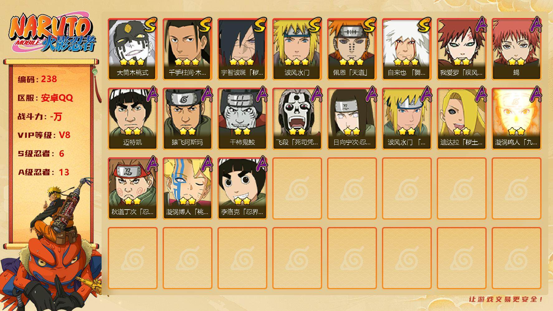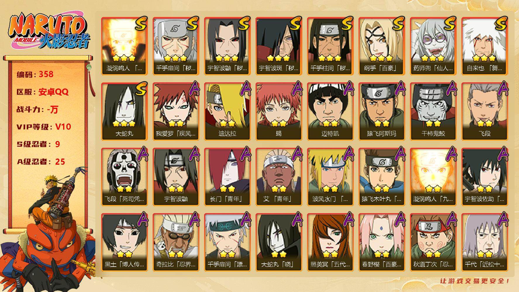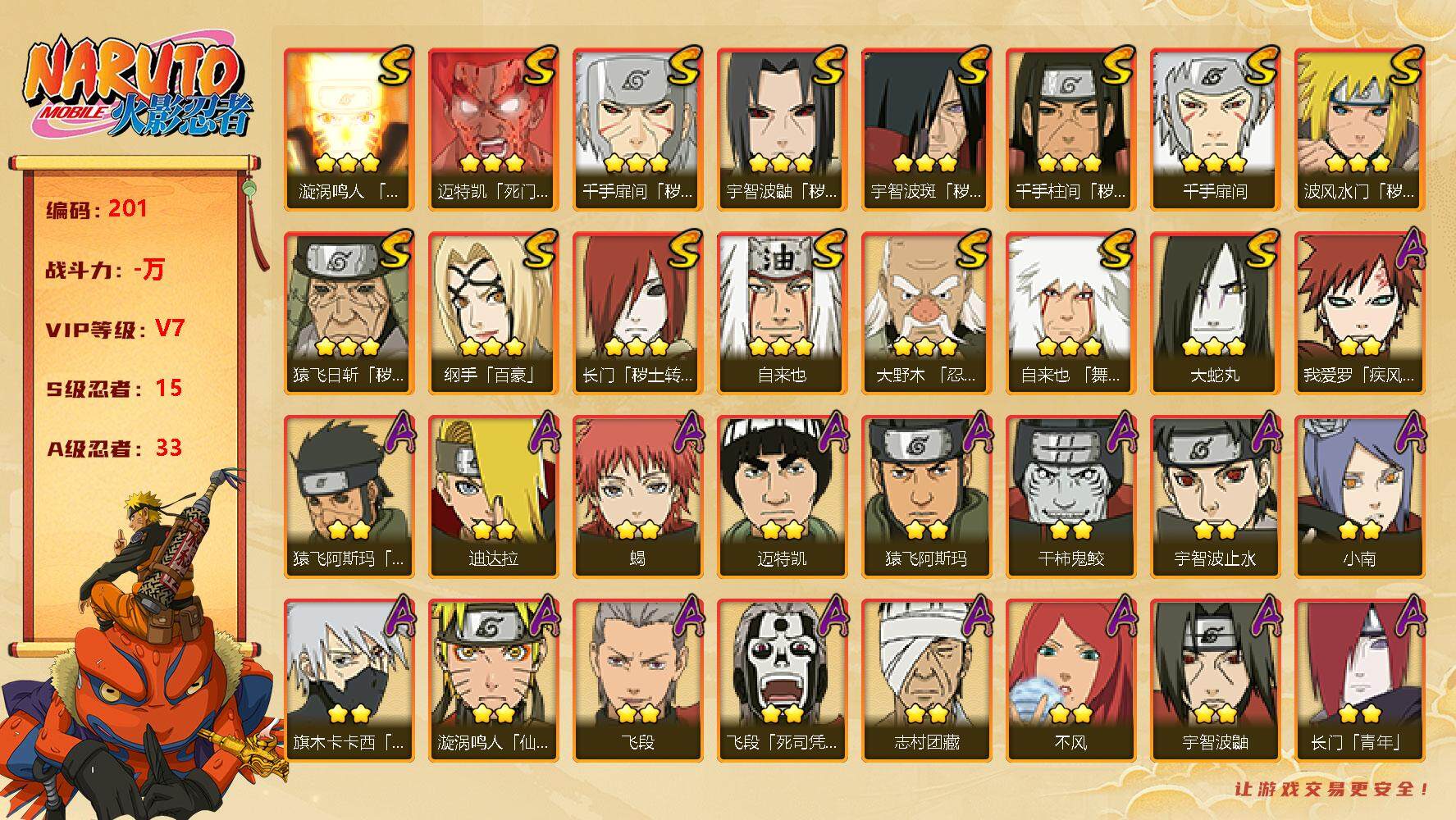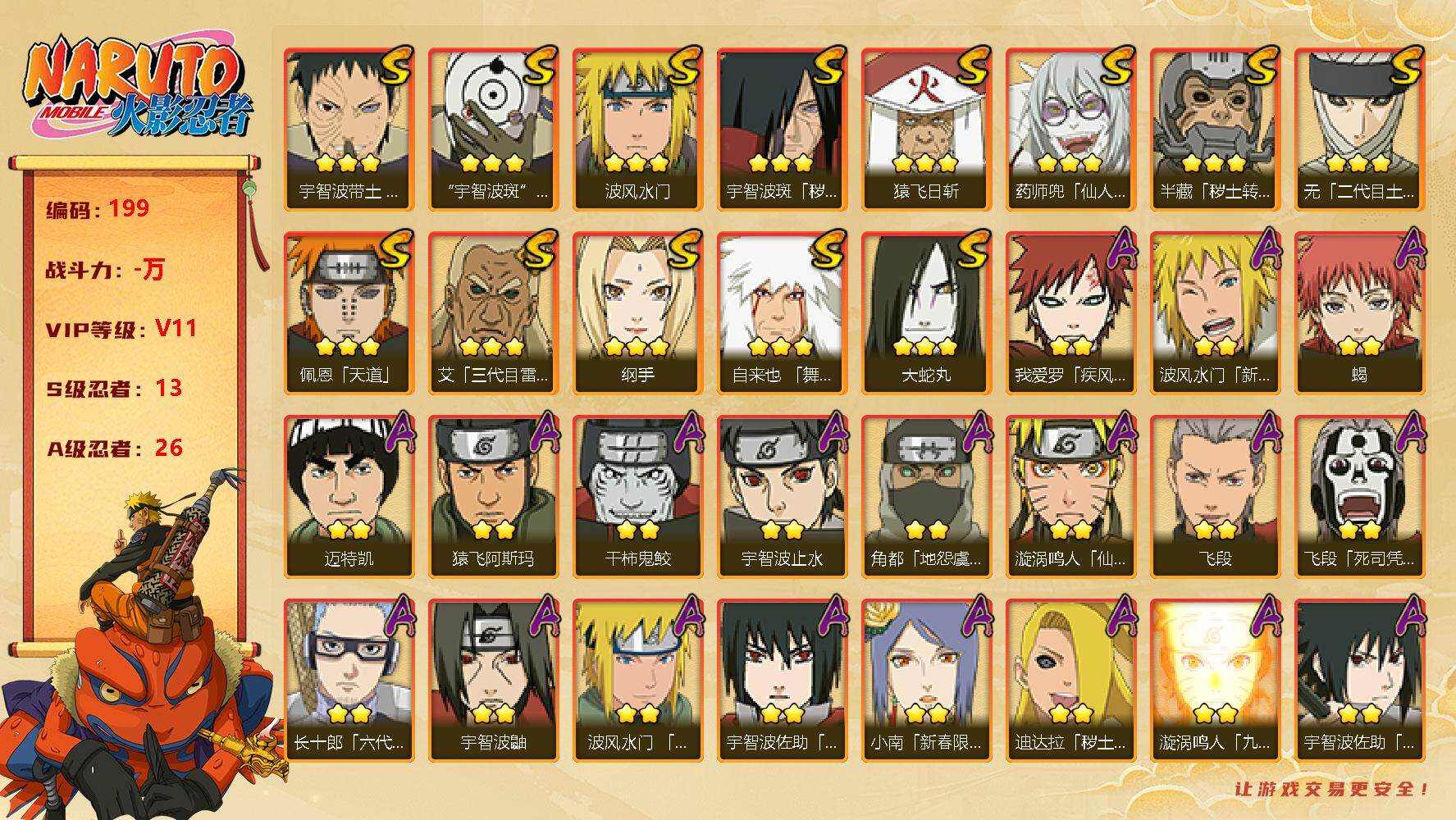 【商品标题】:10s级忍者数-26a级忍者数 【s级忍者】:千手柱间「秽土转生」3星千手柱间「秽土转生」,大野木「忍界大战」3星大野木「忍界大战」,宇智波带土「忍界大战」3星宇智波带土「忍界大战」,自来也「舞之豪杰」3星自来也「舞之豪杰」,大蛇丸3星大蛇丸,纲手3星纲手,千手柱间3星千手柱间,千手扉间3星千手扉间,宇智波斑3星宇智波斑,波风水门3星波风水门 【a级忍者】:艾 「青年」2星艾 「青年」,波风水门 「青年」2星波风水门 「青年」,春野樱「百豪」2星春野樱「百豪」,地陆2星地陆,飞段2星飞段,飞段「死司凭血」2星飞段「死司凭血」,干柿鬼鲛2星干柿鬼鲛,迈特凯2星迈特凯,佩恩·六道「漂泊浪客」2星佩恩·六道「漂泊浪客」,奇拉比2星奇拉比,旗木卡卡西「忍界大战」2星旗木卡卡西「忍界大战」,奇拉比「忍界大战」2星奇拉比「忍界大战」,秋道丁次「忍界大战」2星秋道丁次「忍界大战」,千代「近松十人卫」2星千代「近松十人卫」,三船2星三船,我爱罗「疾风传」2星我爱罗「疾风传」,蝎2星蝎,漩涡鸣人「仙人模式」2星漩涡鸣人「仙人模式」,猿飞阿斯玛2星猿飞阿斯玛,宇智波鼬2星宇智波鼬,宇智波佐助「万花筒写轮眼」2星宇智波佐助「万花筒写轮眼」,宇智波佐助「须佐能乎」2星宇智波佐助「须佐能乎」,药师兜「半蛇斗篷」2星药师兜「半蛇斗篷」,长十郎「六代目水影」2星长十郎「六代目水影」,长门「青年」2星长门「青年」,照美冥「五代目水影」2星照美冥「五代目水影」