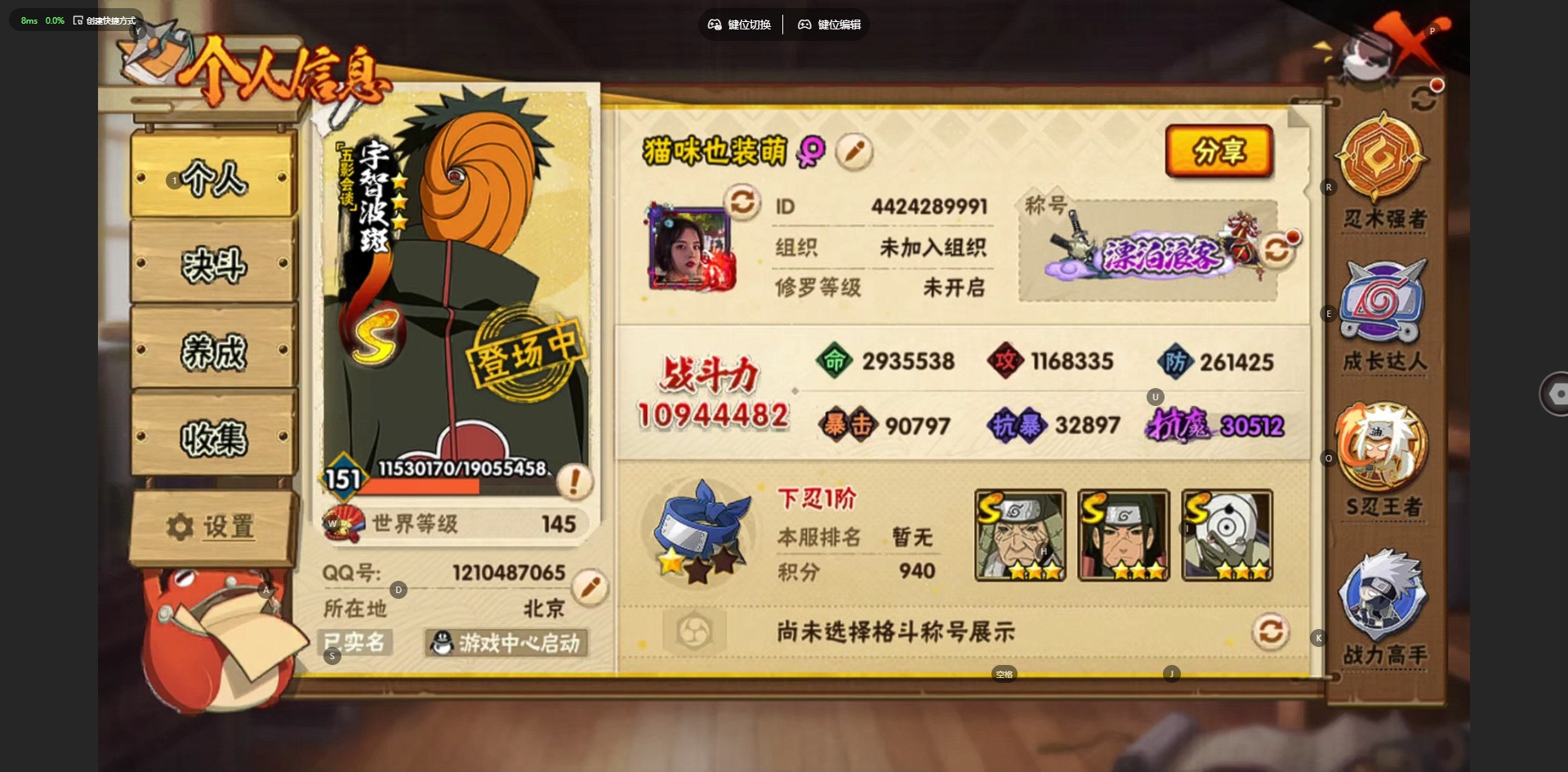 v11 34s忍 48a忍 19通灵 1094.4w战力 可二次 可修改实名 【s级忍者】宇智波止水「须佐能乎」艾「忍界大战」大筒木桃式宇智波斑「秽土转生·解」千手柱间·木叶创立宇智波佐助「永恒万花筒」神秘面具男 「红夜之刃」春野樱 「忍界大战」大筒木金式「博人传」漩涡鸣人 「九