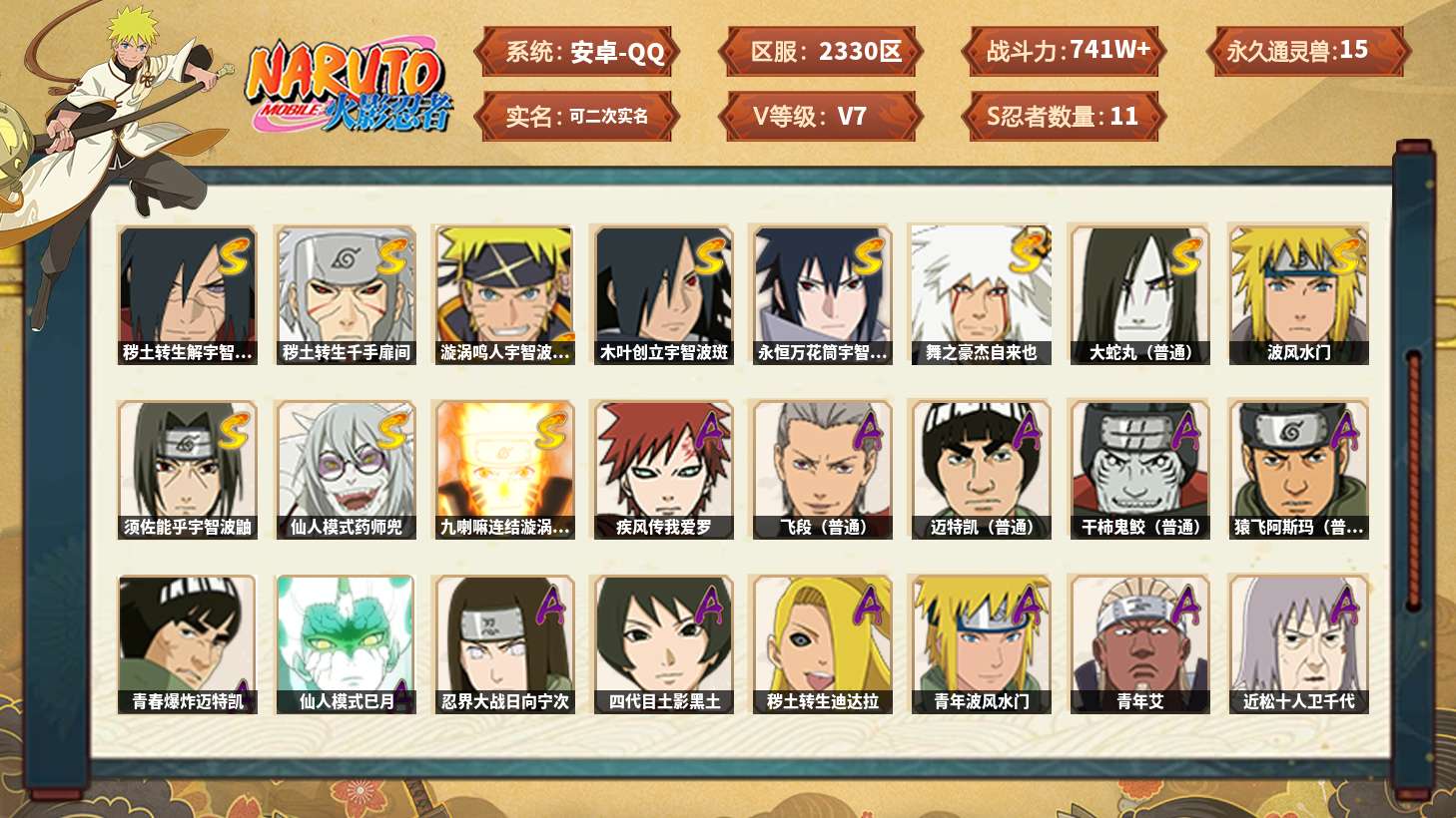 【火影忍者】【lyhy11358】战斗力:741w;段位:上忍3阶;本服排名:879;vip:v7级;s忍:11个;a忍:30个;通灵兽:15个,s忍:秽土转生解宇智波斑|秽土转生千手扉间|漩涡鸣人宇智波佐助|木叶创立宇智波斑|永恒万花筒宇智波佐助|舞之豪杰自来也|大蛇丸(普通)|波风水门|须佐能乎宇智波鼬|仙人模式药师兜|九喇嘛连结漩涡鸣人__a忍:青春爆炸迈特凯|仙人模式巳月|忍界大战日向宁次|四代目土影黑土|秽土转生迪达拉|青年波风水门|青年艾|近松十人卫千代|半蛇斗篷药师兜|须佐能乎宇智波佐助|九尾查克拉漩涡鸣人|晓大蛇丸|忍界大战秋道丁次|忍界大战我爱罗|疾风传咒印宇智波佐助|奇拉比(普通)|万花筒写轮眼宇智波佐助|死司凭血飞段|疾风传我爱罗 3星|迪达拉(普通)|飞段(普通) 3星|仙人模式漩涡鸣人|迈特凯(普通) 3星|宇智波鼬(普通)|干柿鬼鲛(普通) 3星|蝎(普通)|猿飞阿斯玛(普通) 3星|桃式显现漩涡博人|六代目水影长十郎|侠隐江湖大野木__通灵兽:忍犬(普通)|蓝蛇|砂之守鹤|蛤蟆吉|忍龟|镰鼬|猿魔|山椒鱼|蜃|蛤蟆仙人|鲛鲨|蛤蟆健|乌鸦(普通)|蛤蟆龙|蛤蟆广
