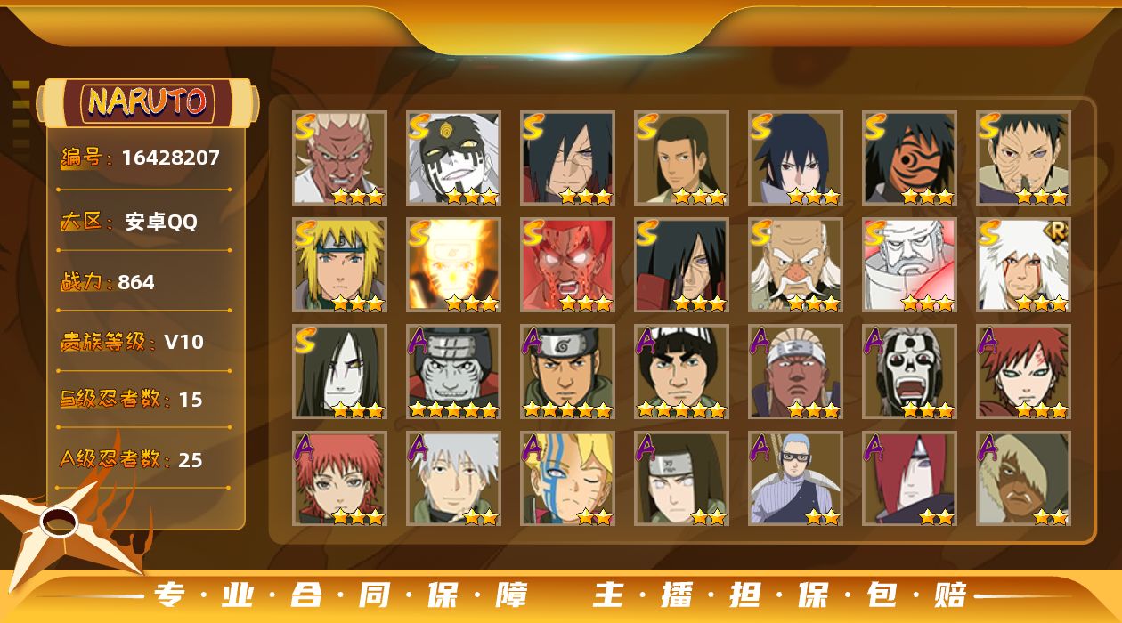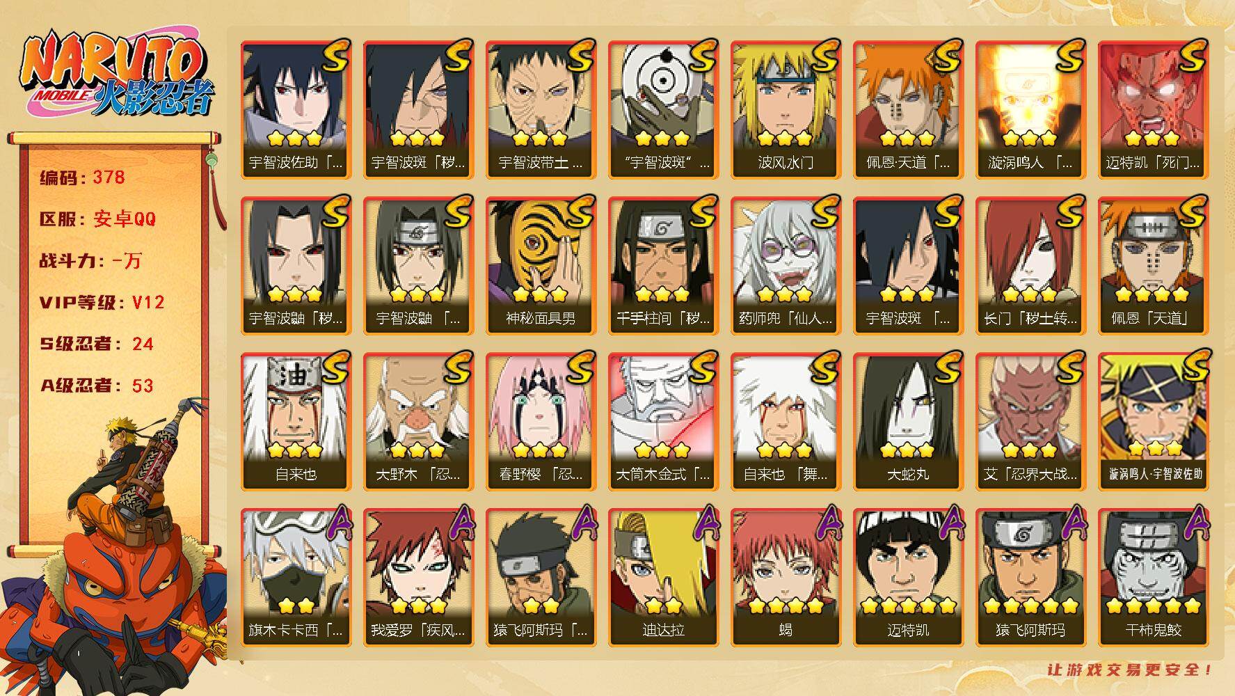 [16428346]【编号37772可秒换绑】店长推荐特价处理精品号 16s级忍者数-38a级忍者数 【s级忍者】:半藏「秽土转生」3星,千手扉间「秽土转生」3星,宇智波斑「秽土转生」3星,宇智波斑「秽土转生·解」3星,艾「三代目雷影」3星,自来也「舞之豪杰」3星,大蛇丸3星,纲手3星,波风水门3星,药师兜「仙人模式」3星,漩涡鸣人「九喇嘛连结」3星,迈特凯「死门」3星,佩恩「天道」3星,宇智波斑 「白面具」3星宇智波斑「白面具」,大筒木金式3星,大筒木桃式3星 【a级忍者】:艾「青年」2星,长门「青年」2星,波风水门「新春限定」2星,迪达拉2星,迪达拉「秽土转生」2星,大蛇丸「晓」2星,奇拉比2星,奇拉比「忍界大战」2星,飞段3星,飞段「死司凭血」2星,干柿鬼鲛4星,干柿鬼鲛「鲛肌融合」2星,漩涡博人「桃式显现」2星,漩涡鸣人「仙人模式」2星,漩涡鸣人「九尾查克拉」2星,迈特凯4星,旗木卡卡西「忍界大战」2星,旗木卡卡西「万花筒写轮眼」2星,我爱罗「疾风传」3星,我爱罗「忍界大战」2星,蝎3星,小南「夏日泳装」2星,猿飞阿斯玛4星,猿飞阿斯玛「秽土转生」2星,宇智波佐助「须佐能乎」2星,宇智波佐助「疾风传咒印」2星,宇智波佐助「万花筒写轮眼」2星,药师兜「半蛇斗篷」2星,照美冥「五代目水影」2星,日向宁次「忍界大战」2星,宇智波带土「暴怒」2星,长十郎「六代目水影」2星,卑留呼「火之意志继承者」2星,李洛克「忍界大战」2星,黑土「博人传」2星,春野樱「百豪」2星,秋道丁次「忍界大战」2星,千代「近松十人卫」2星