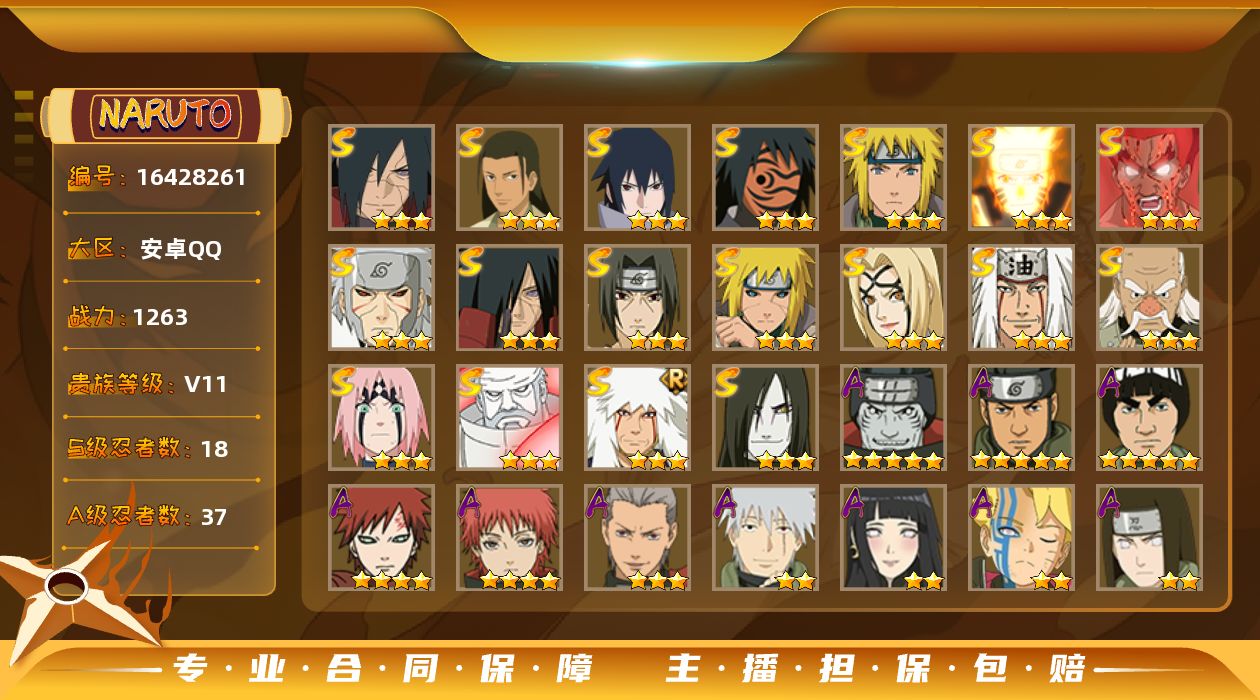 [16428261]【编号35384可秒换绑】【店长推荐精品号!】18s级忍者数-37a级忍者数 【s级忍者】:波风水门「秽土转生」3星,千手扉间「秽土转生」3星,宇智波斑「秽土转生」3星,宇智波斑「秽土转生·解」3星,大野木「忍界大战」3星,春野樱「忍界大战」3星,宇智波鼬「须佐能乎」3星,千手柱间「木叶创立」3星,自来也3星,自来也「舞之豪杰」3星,大蛇丸3星,纲手「百豪」3星,波风水门3星,神秘面具男「红夜之刃」3星,漩涡鸣人「九喇嘛连结」3星,迈特凯「死门」3星,宇智波佐助「永恒万花筒」3星,大筒木金式3星 【a级忍者】:艾「青年」2星,长门「青年」2星,波风水门「青年」2星,达鲁伊「博人传」2星,迪达拉2星,迪达拉「秽土转生」2星,飞段3星,飞段「死司凭血」2星,干柿鬼鲛5星,漩涡博人「桃式显现」2星,漩涡鸣人「仙人模式」2星,漩涡鸣人「九尾查克拉」2星,迈特凯5星,旗木卡卡西「元气夏日」2星,旗木卡卡西「万花筒写轮眼」2星,旗木卡卡西「幻之真容」2星,我爱罗「疾风传」4星,我爱罗「忍界大战」2星,蝎4星,猿飞阿斯玛5星,宇智波止水2星,宇智波鼬2星,宇智波鼬「新春限定」2星,宇智波佐助「须佐能乎」2星,药师兜「半蛇斗篷」2星,照美冥「五代目水影」2星,日向宁次「忍界大战」2星,日向雏田「最终章」2星,长十郎「六代目水影」2星,卑留呼「火之意志继承者」2星,神秘面具男「忍者之路」2星,猿飞木叶丸「博人传」2星,黑土「博人传」2星,春野樱「百豪」2星,秋道丁次「忍界大战」2星,千代「近松十人卫」2星,不缘2星