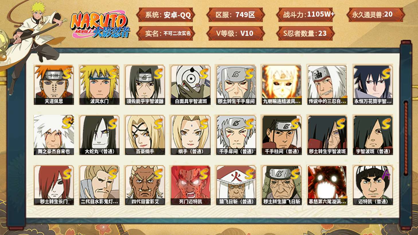【火影忍者】【lyhy11289】战斗力:1105w;段位:中忍2阶;本服排名:593;vip:v10级;s忍:23个;a忍:37个;通灵兽:20个,s忍:白面具宇智波斑|秽土转生千手扉间|九喇嘛连结波风水门|天道佩恩 4星|传说中的三忍自来也|永恒万花筒宇智波佐助|舞之豪杰自来也|大蛇丸(普通)|百豪纲手|纲手(普通)|波风水门 4星|千手扉间(普通)|千手柱间(普通)|秽土转生宇智波斑|宇智波斑(普通)|须佐能乎宇智波鼬 4星|秽土转生长门|二代目水影鬼灯幻月|四代目雷影艾|死门迈特凯|猿飞日斩(普通)|秽土转生猿飞日斩|暴怒第六尾漩涡鸣人__a忍:幻之真容旗木卡卡西|木叶上忍猿飞木叶丸|秽土转生迪达拉|宇智波止水(普通)|不风|青年波风水门|忍界大战旗木卡卡西|漂泊武士桃地再不斩|近松十人卫千代|半蛇斗篷药师兜|须佐能乎宇智波佐助|九尾查克拉漩涡鸣人|晓大蛇丸|百豪春野樱|忍界大战秋道丁次|忍界大战我爱罗|奇拉比(普通)|万花筒写轮眼宇智波佐助|五代目水影照美冥|五代目雷影达鲁伊|死司凭血飞段|地怨虞角都|疾风传我爱罗 4星|迪达拉(普通)|飞段(普通) 4星|仙人模式漩涡鸣人|万花筒写轮眼旗木卡卡西|迈特凯(普通) 5星|宇智波鼬(普通)|干柿鬼鲛(普通) 5星|蝎(普通) 5星|绯流琥蝎|猿飞阿斯玛(普通) 5星|六代目水影长十郎|宇智波泉奈|羁绊神农|侠隐江湖大野木__通灵兽:忍犬(普通)|蓝蛇|蛤蟆吉|忍龟|镰鼬|猿魔|山椒鱼|蜃|蛤蟆仙人|鲛鲨|蛤蟆健|乌鸦(普通)|怒鬼(普通)|蛞蝓(普通)|熊猫|蛤蟆龙|蛤蟆广|梦貘|砂之守鹤|鹰